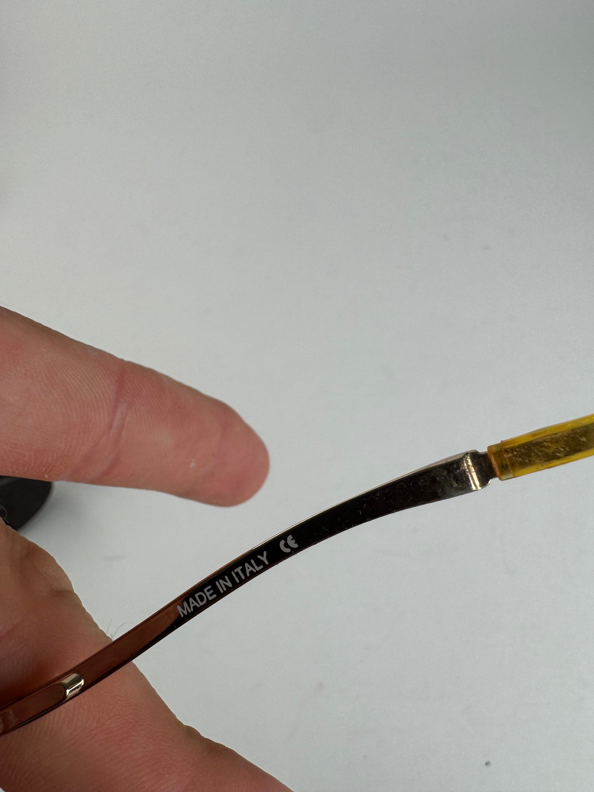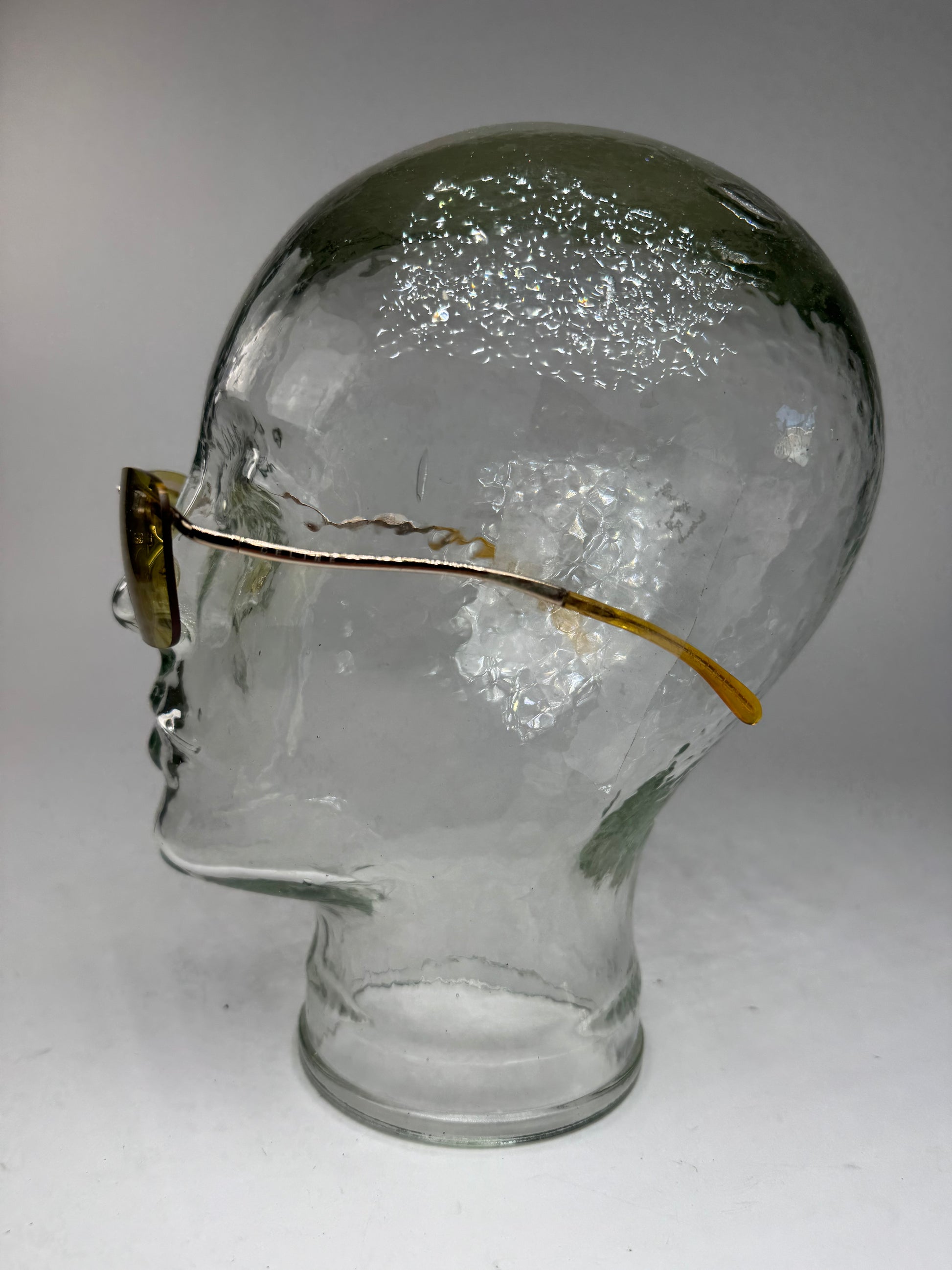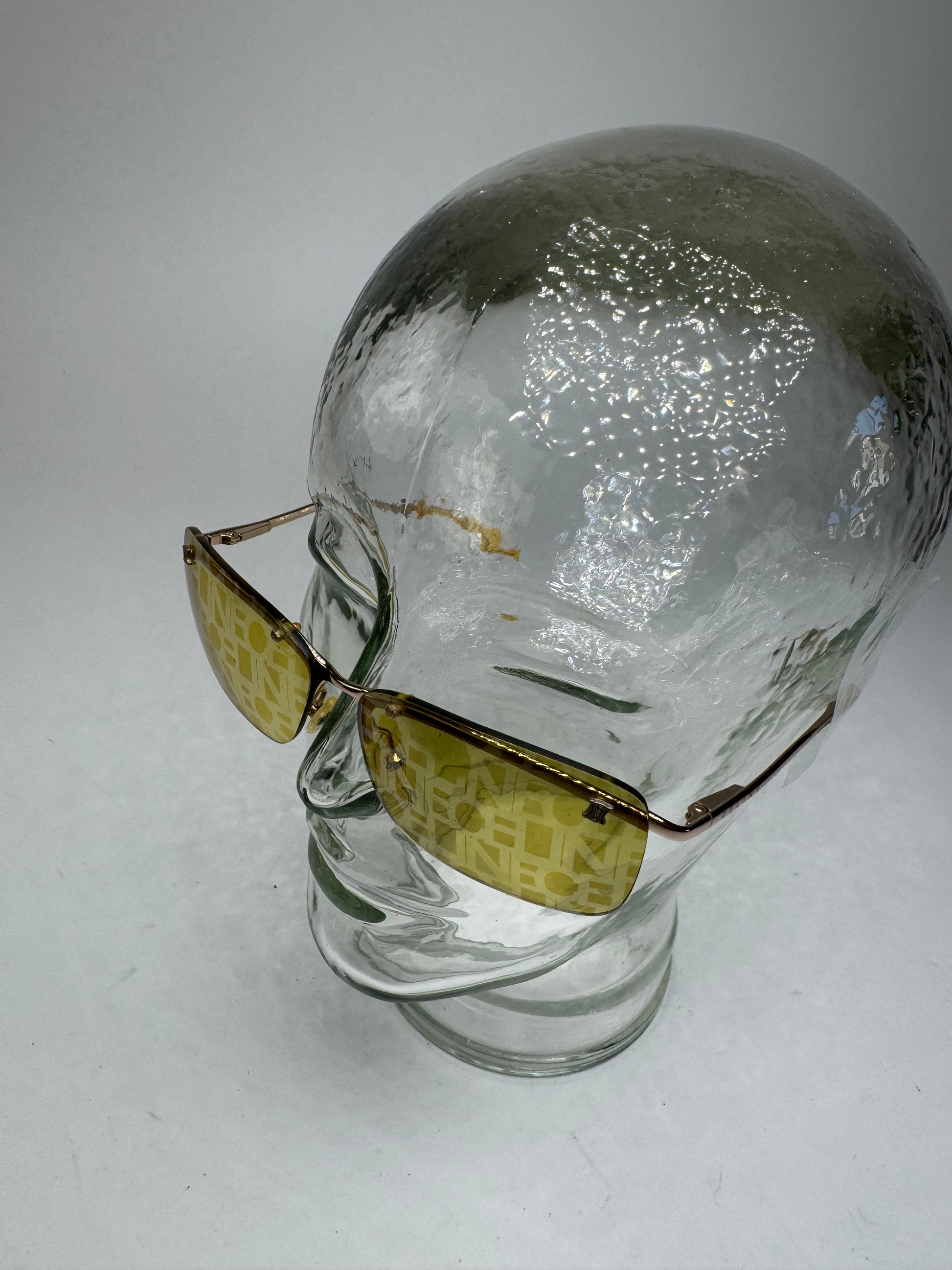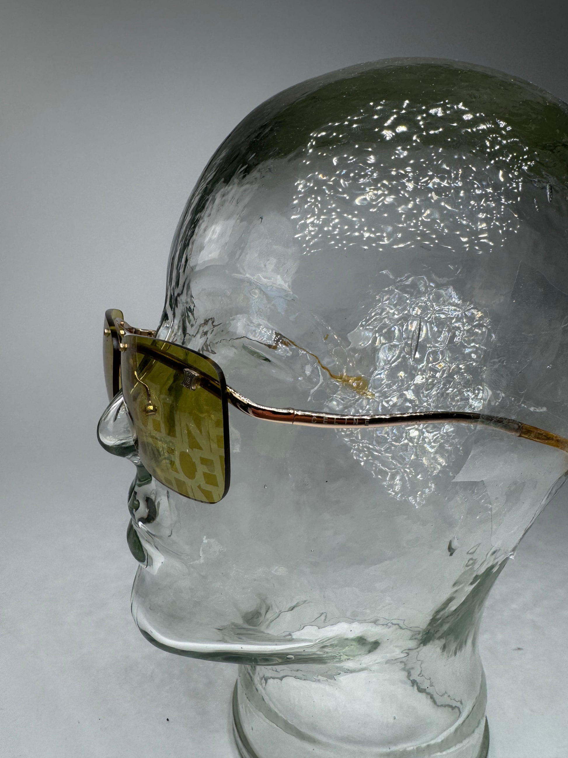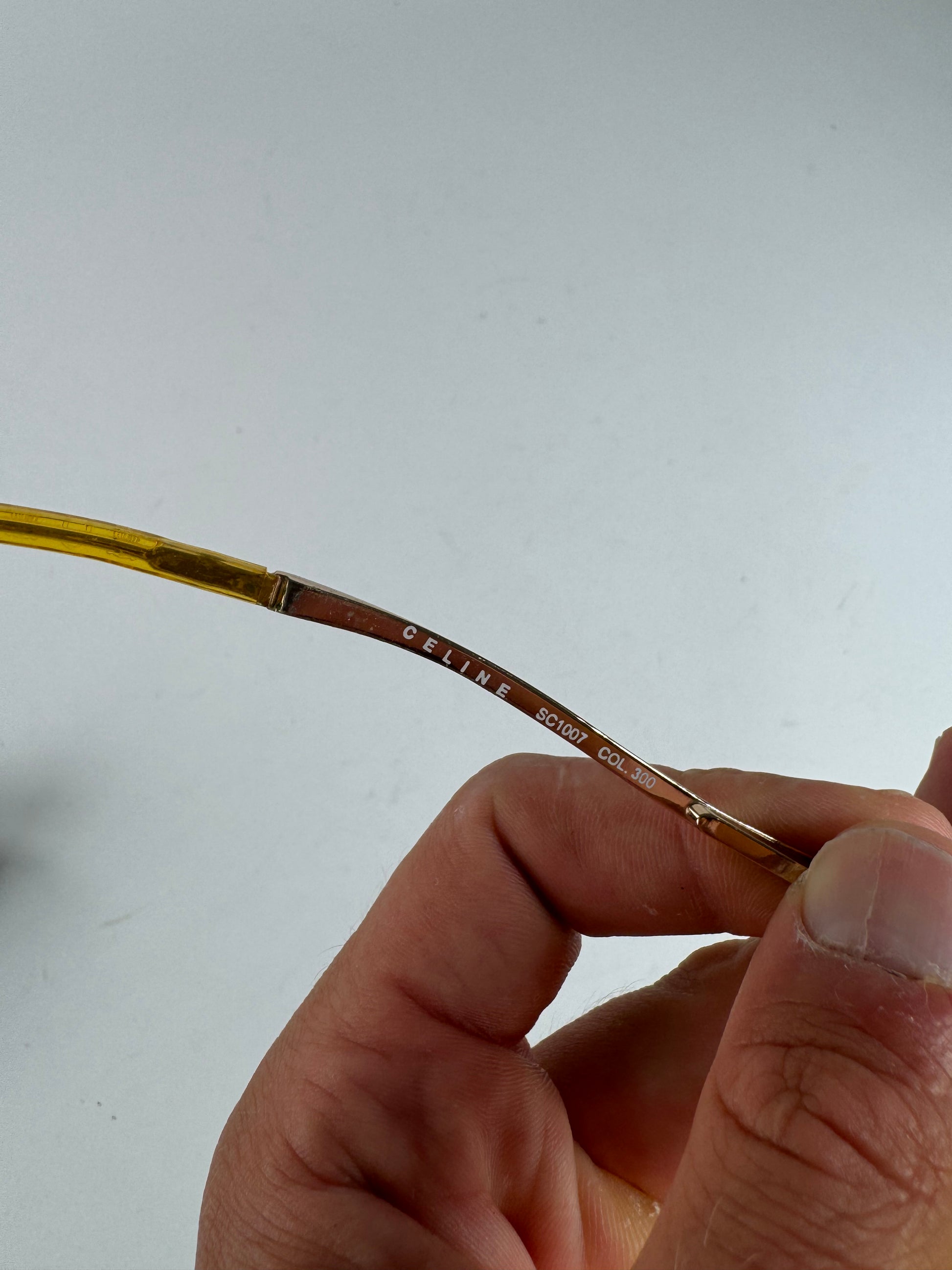 CELINE PARIS Vintage Rimless Monogram Sunglasses. These unisex sunglasses feature a rimless design with yellow-tinted lenses subtly decorated with a CELINE monogram motif—applied in a brush-like texture that is barely noticeable when worn. The temples are crafted of gold-tone steel with yellow acetate-coated ends. Made in Italy.
