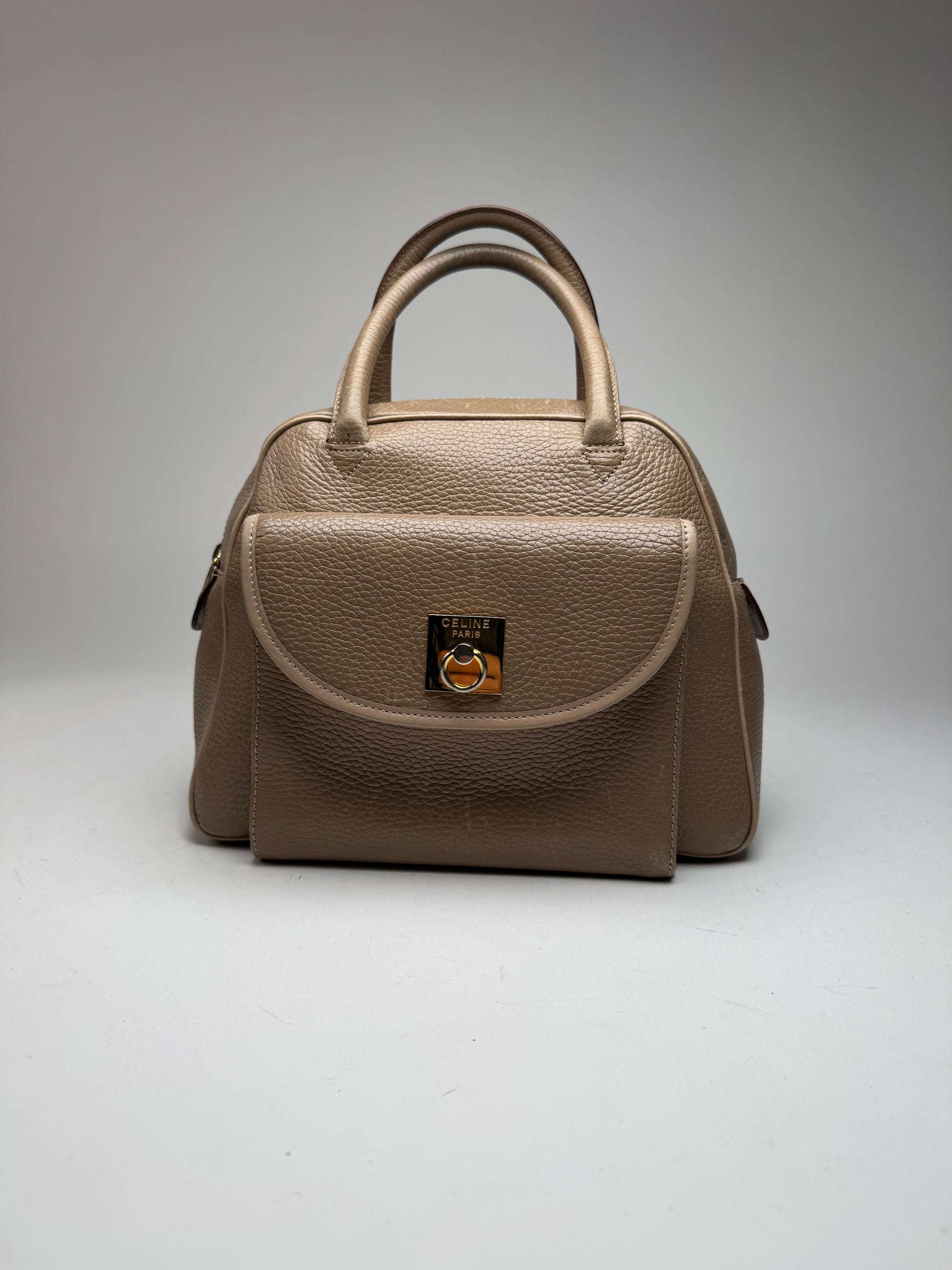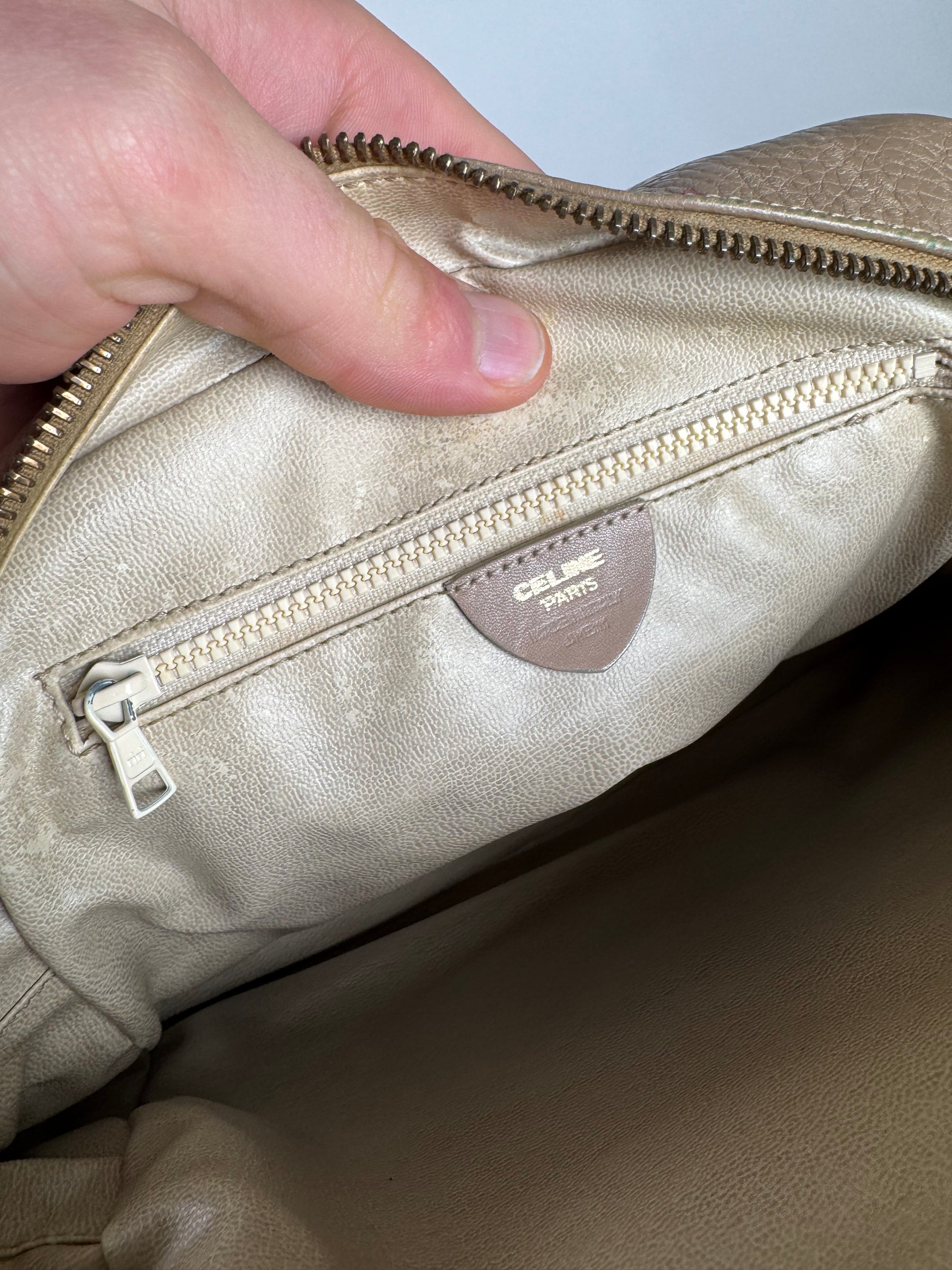 This vintage handbag is finely crafted from sand-colored and white leather, featuring gold-tone stainless steel hardware. Made in Italy, this elegant piece showcases Celine’s timeless craftsmanship. Despite light scuffs inside and out, the overall condition remains very good. A sophisticated and classic accessory.