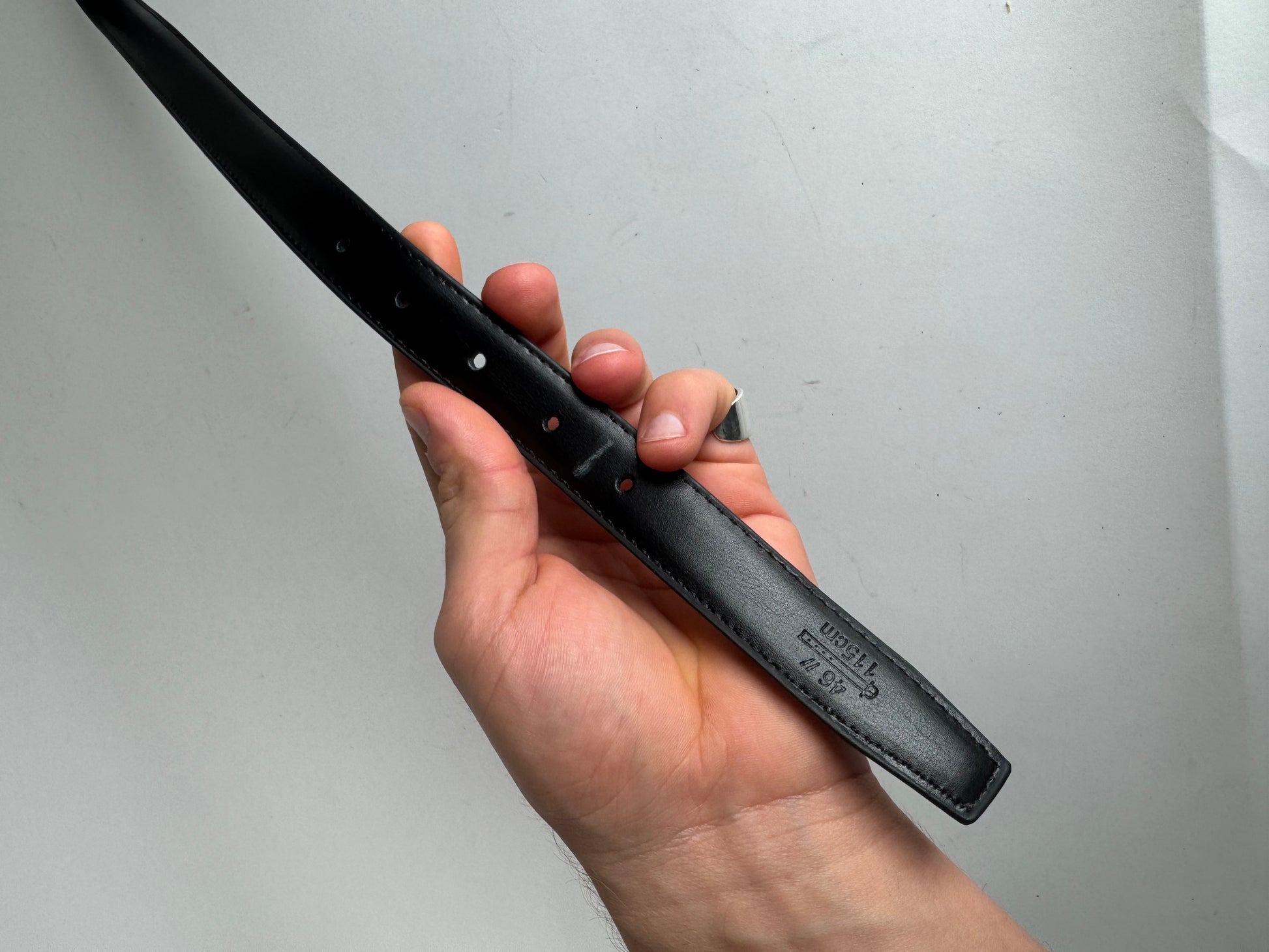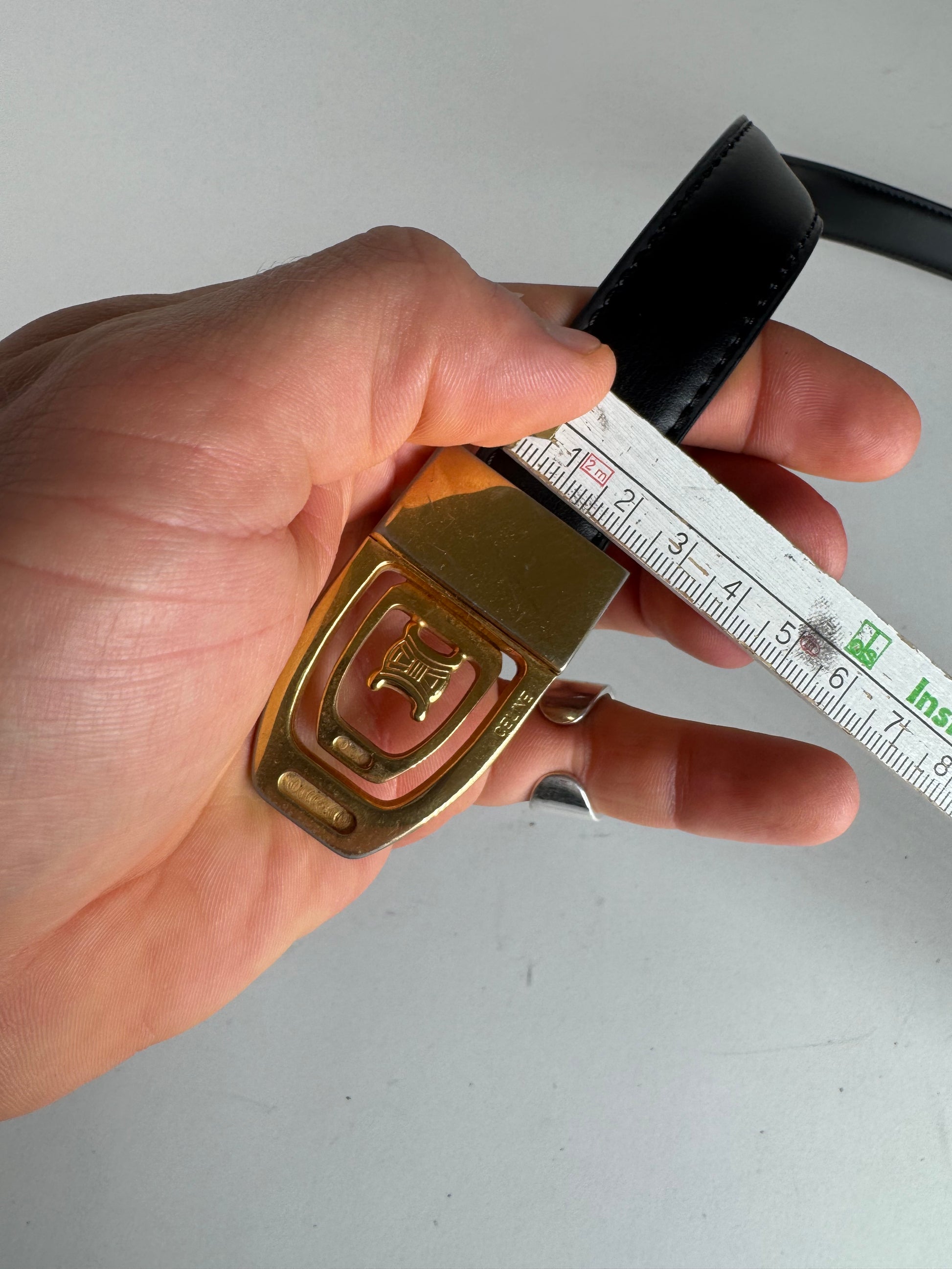 CELINE PARIS Vintage Triomphe Belt. This vintage Celine Paris Triomphe belt features a black leather strap paired with a signature gold-tone steel buckle, adding a refined and timeless touch. The buckle is made in Italy, while the belt strap has been replaced. Despite this, the piece remains in very good condition. A stylish and elegant unisex accessory.