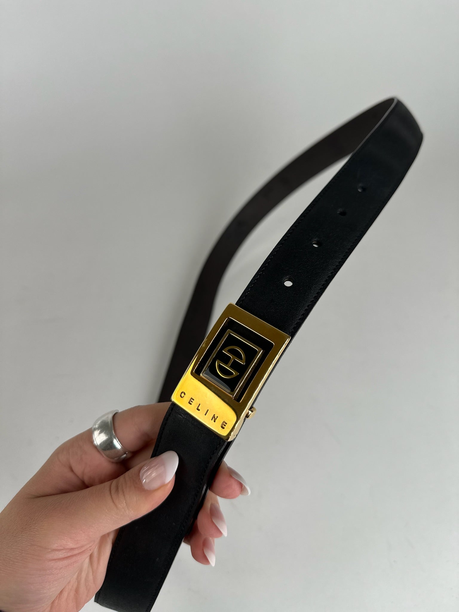 CELINE PARIS Vintage Belt . This chic belt features a glossy black leather strap (not original) and a gold-tone steel horseshoe buckle. The buckle is made in Italy.