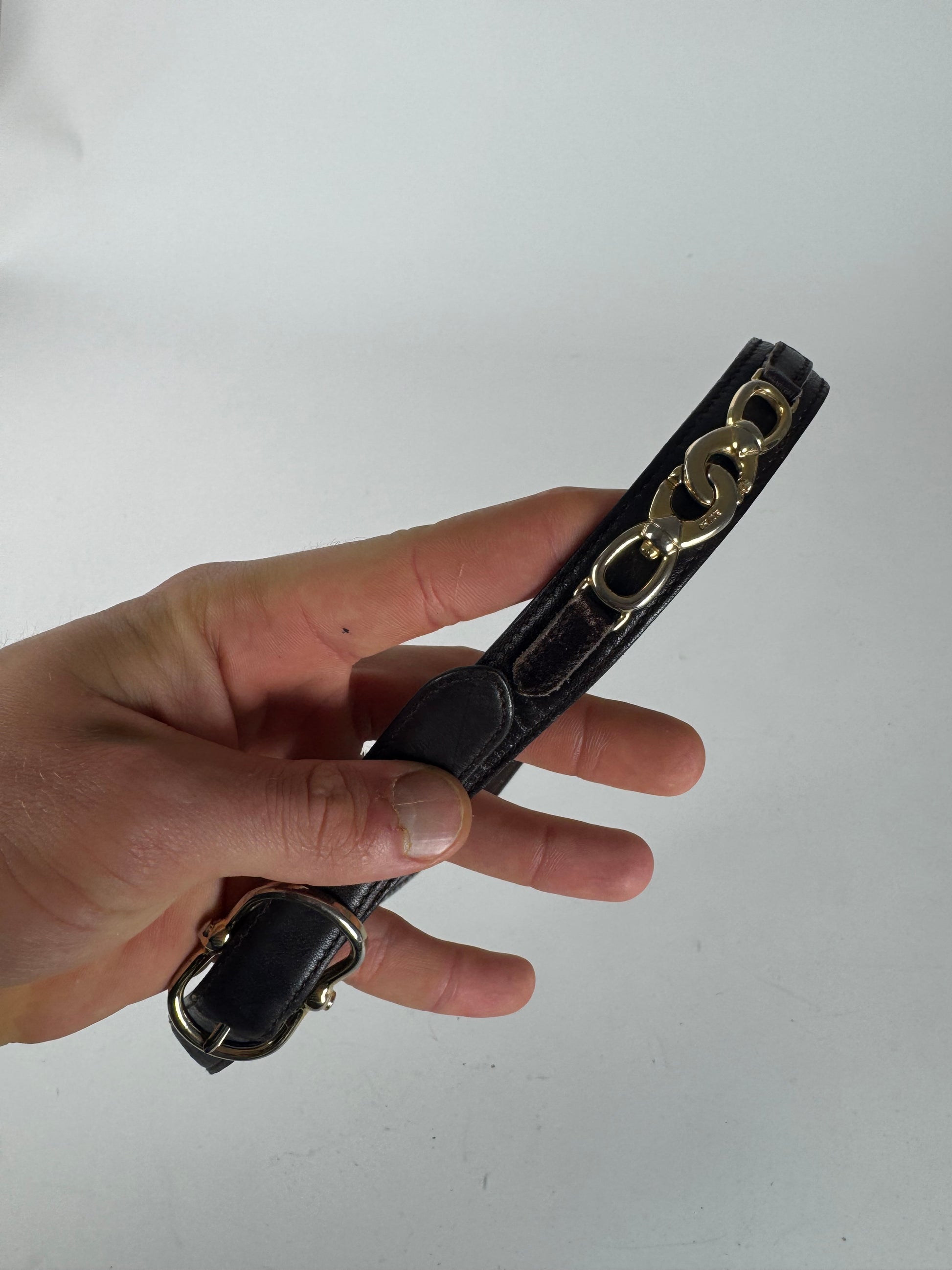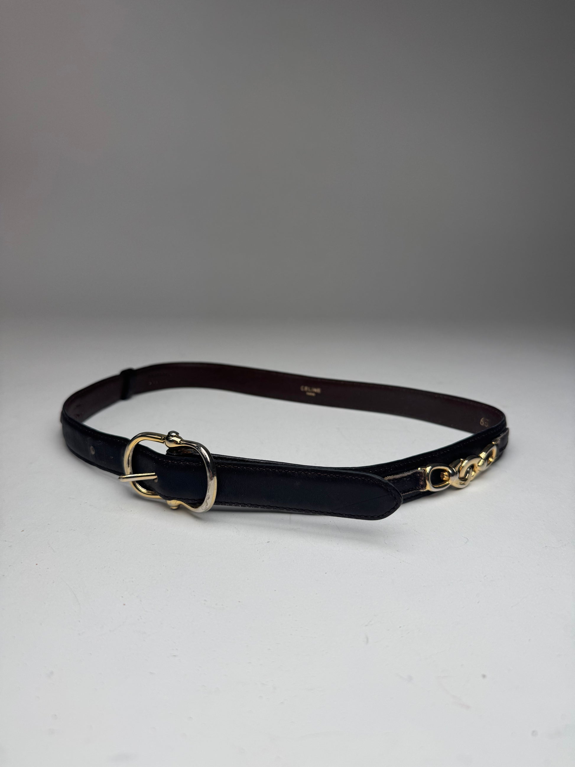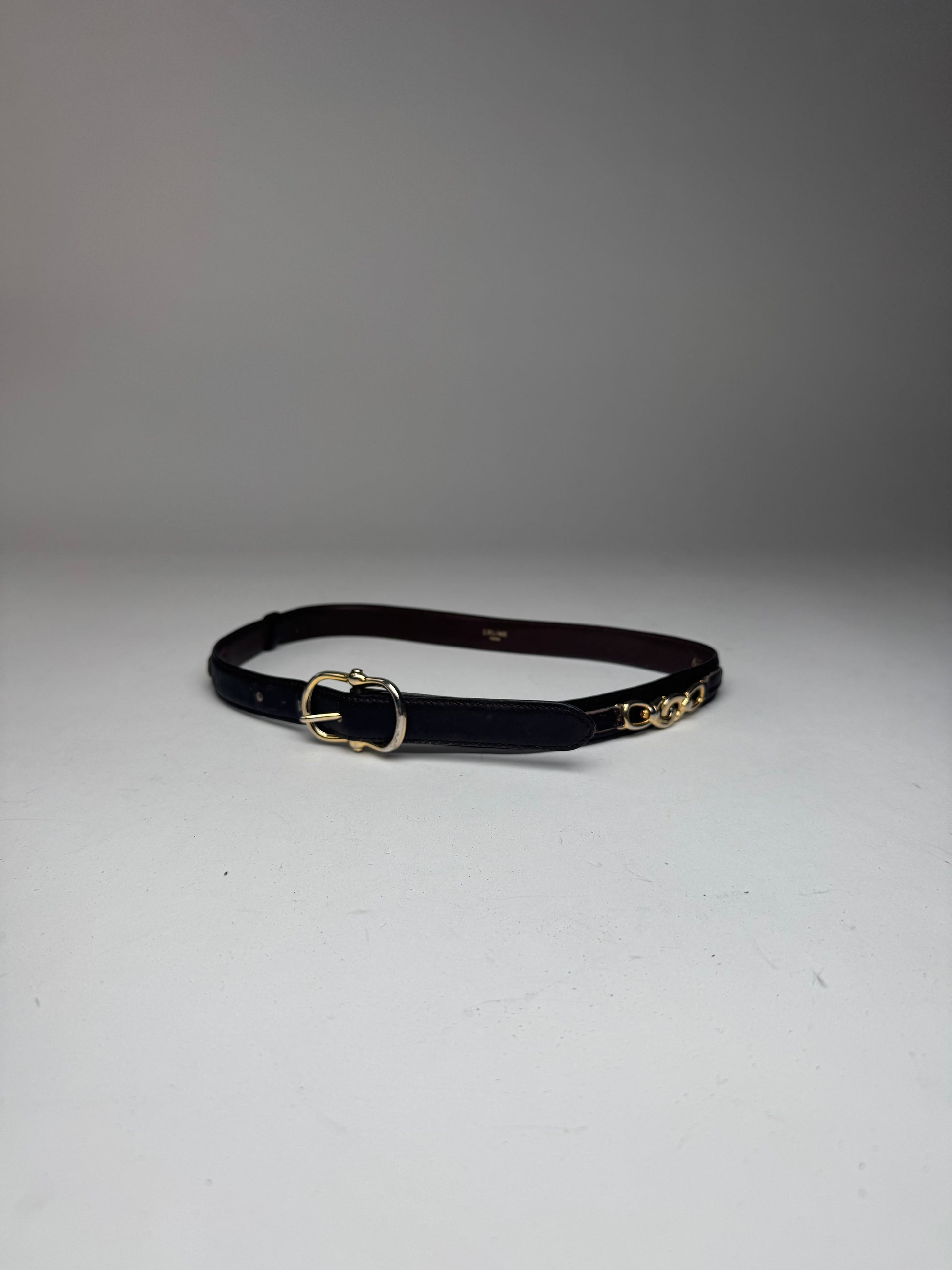 CELINE PARIS Vintage Belt. This vintage Celine Paris belt is crafted from brown leather with gold-tone steel hardware and features chain-style appliqué details for a bold, statement look. Made in Italy in 2004, it remains in very good condition despite minor scuffs and scratches. A stylish unisex accessory.