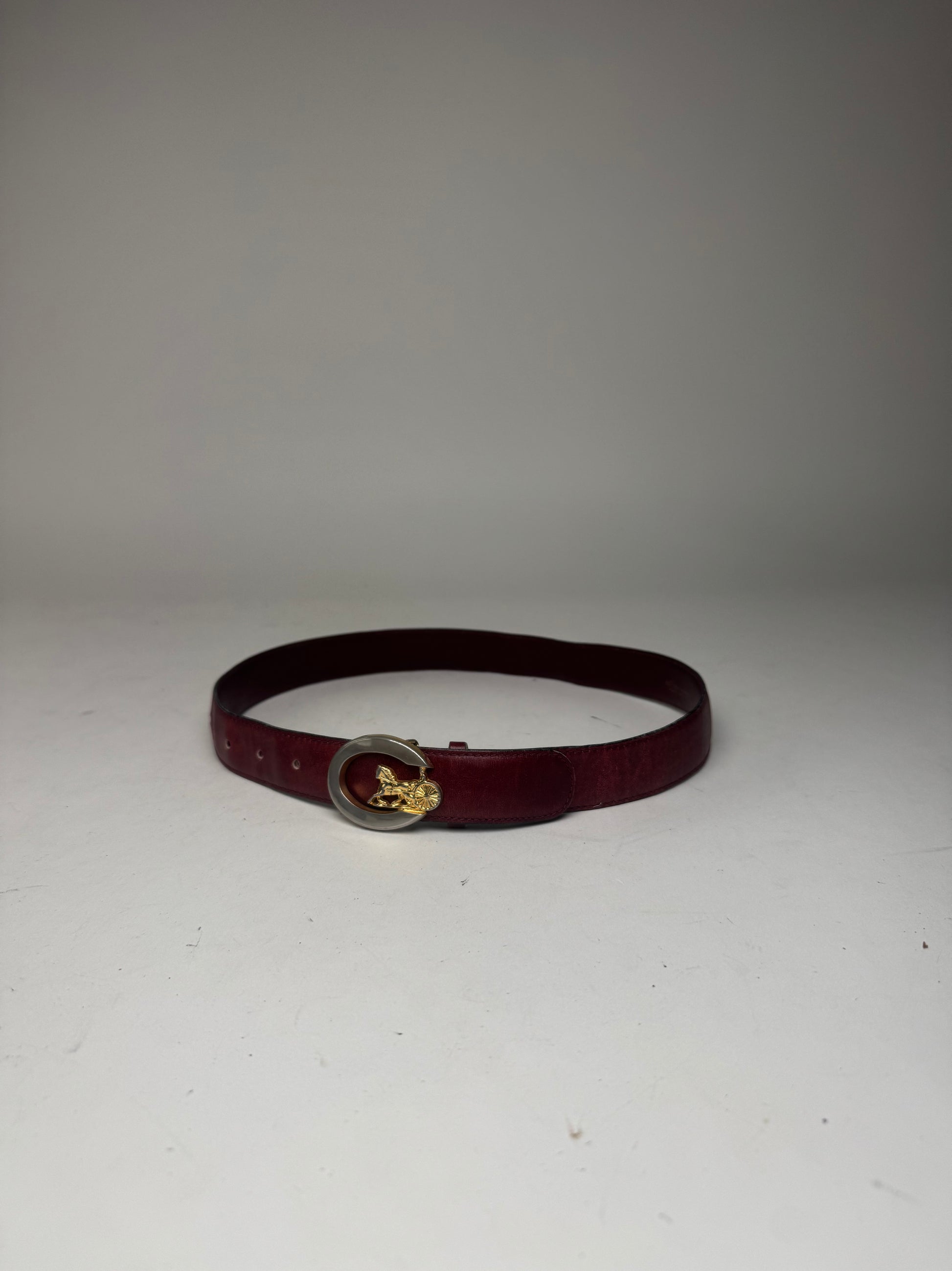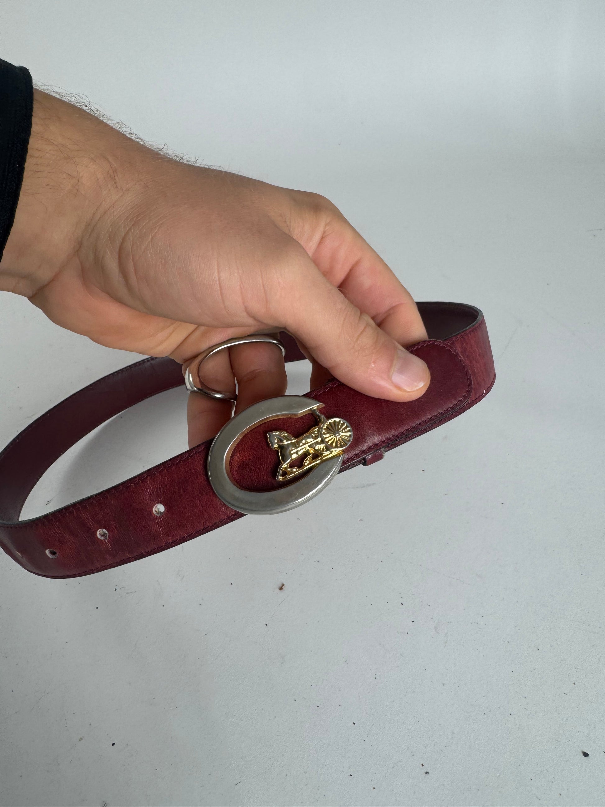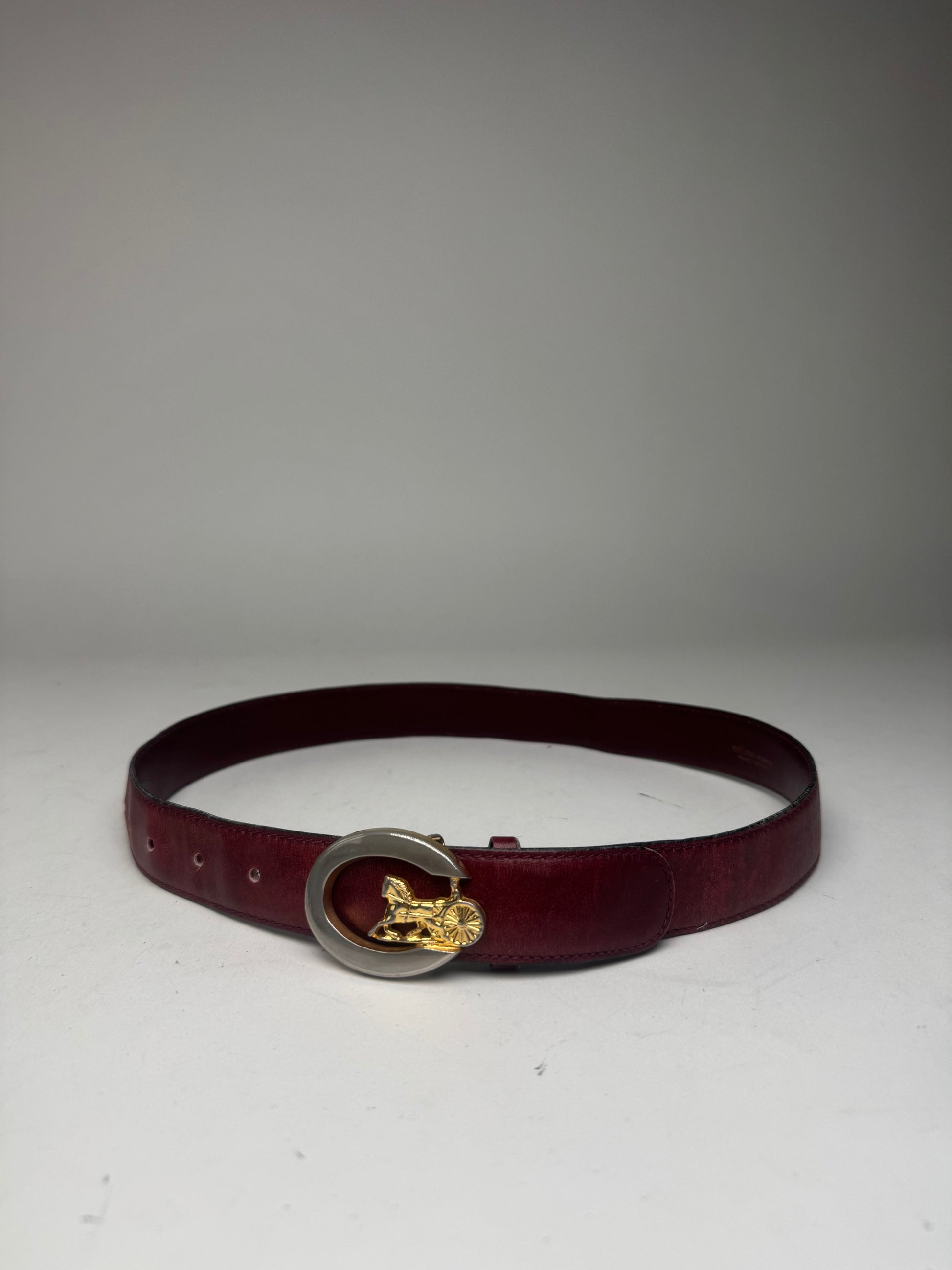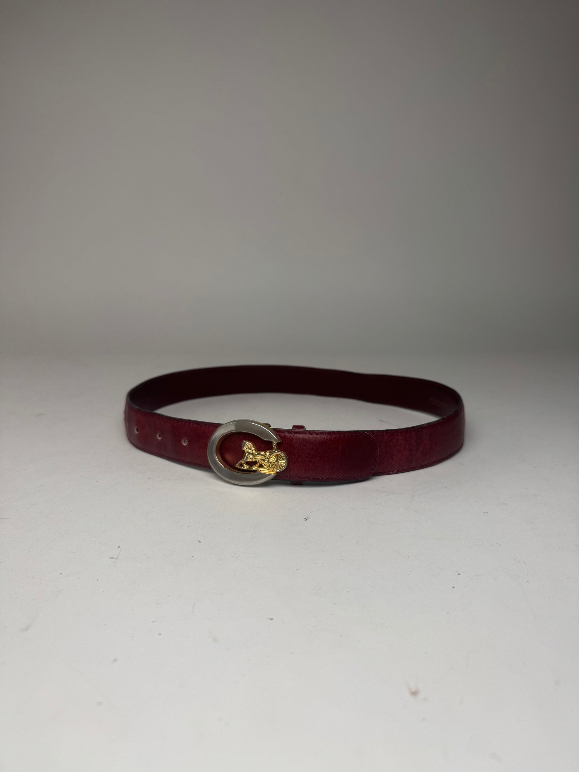 CELINE PARIS Vintage Belt. This elegant belt is finely crafted of burgundy leather. It features a distinctive half-circle buckle in gold-tone steel with the iconic CELINE carriage logo at its center, framed by silver-tone steel. Introduced in the 1970s, the carriage logo reflects Celine’s Parisian heritage, symbolizing timeless sophistication and the house’s connection to classic French elegance.