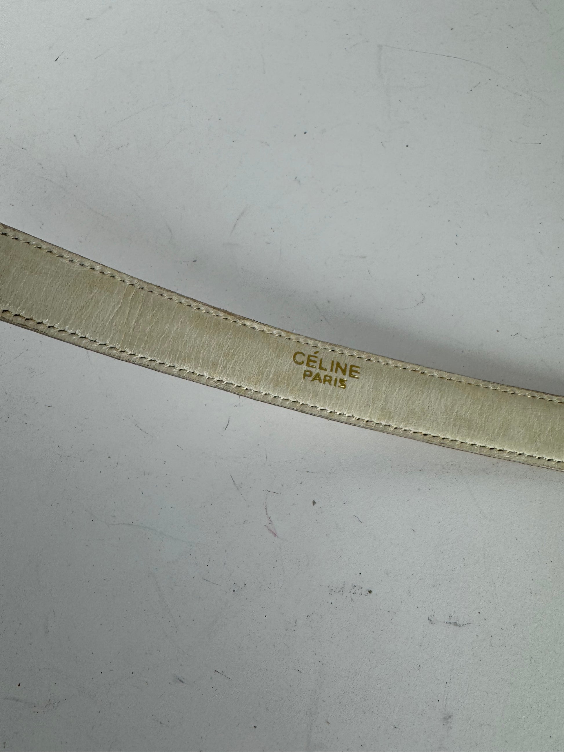 CELINE PARIS Vintage Chain Belt. This stylish belt is finely crafted of white leather and gold-toned steel chain links. Made in Italy, this 90s piece features a timeless design with logo detailing.