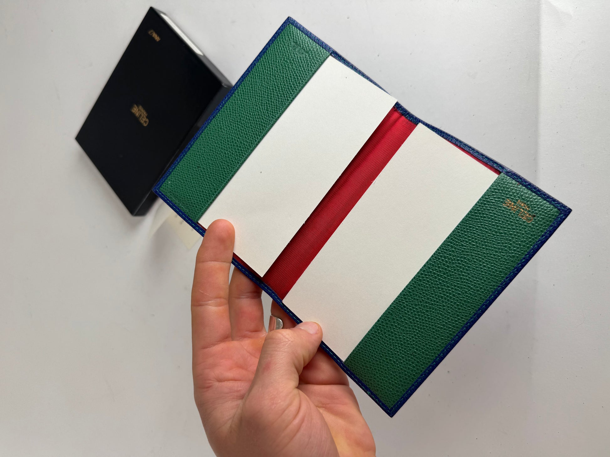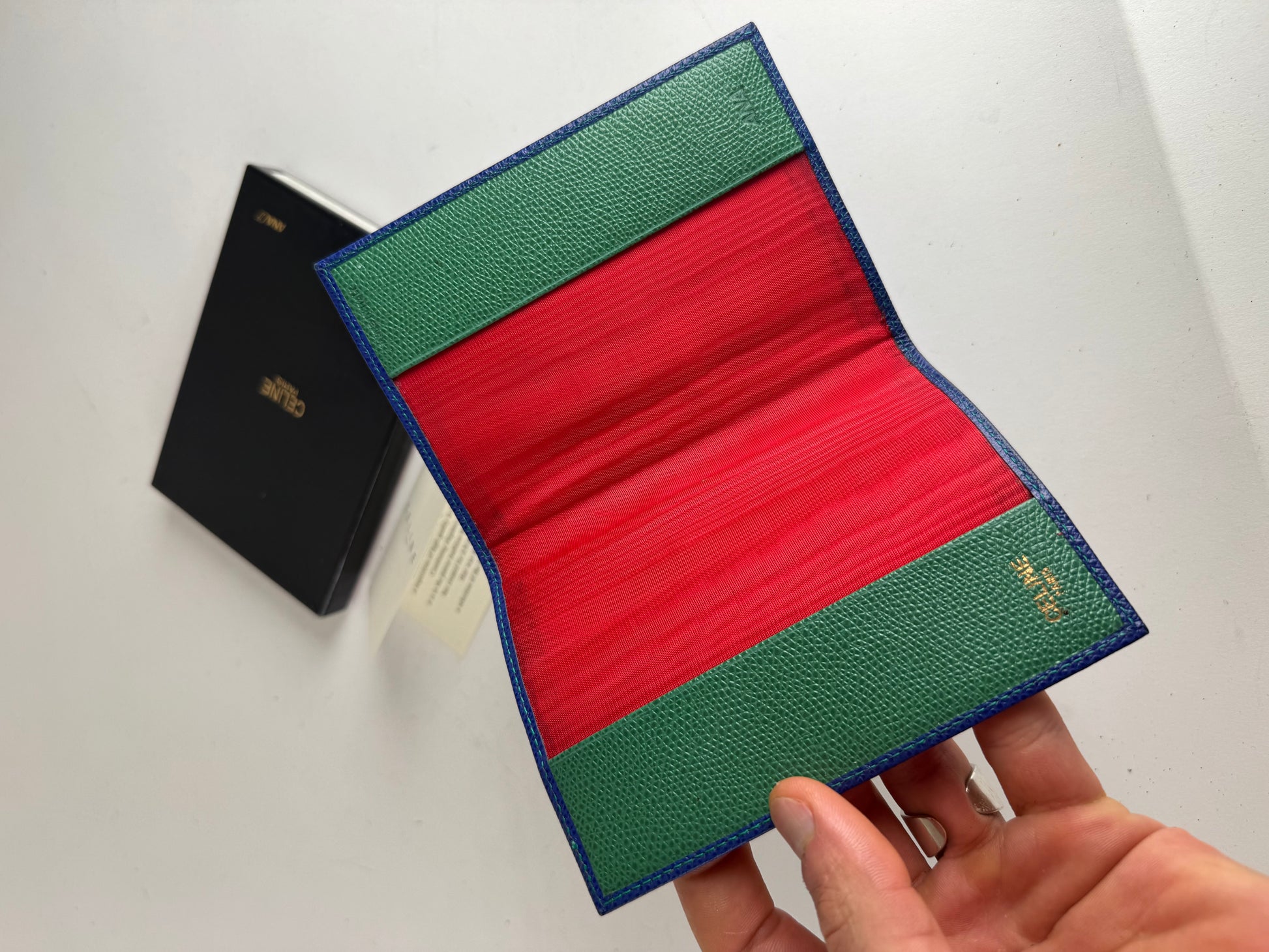 CELINE PARIS Vintage Card Holder. This elegant card holder is finely crafted of blue leather. Made in Italy, the unisex accessory features a green leather and red canvas interior.