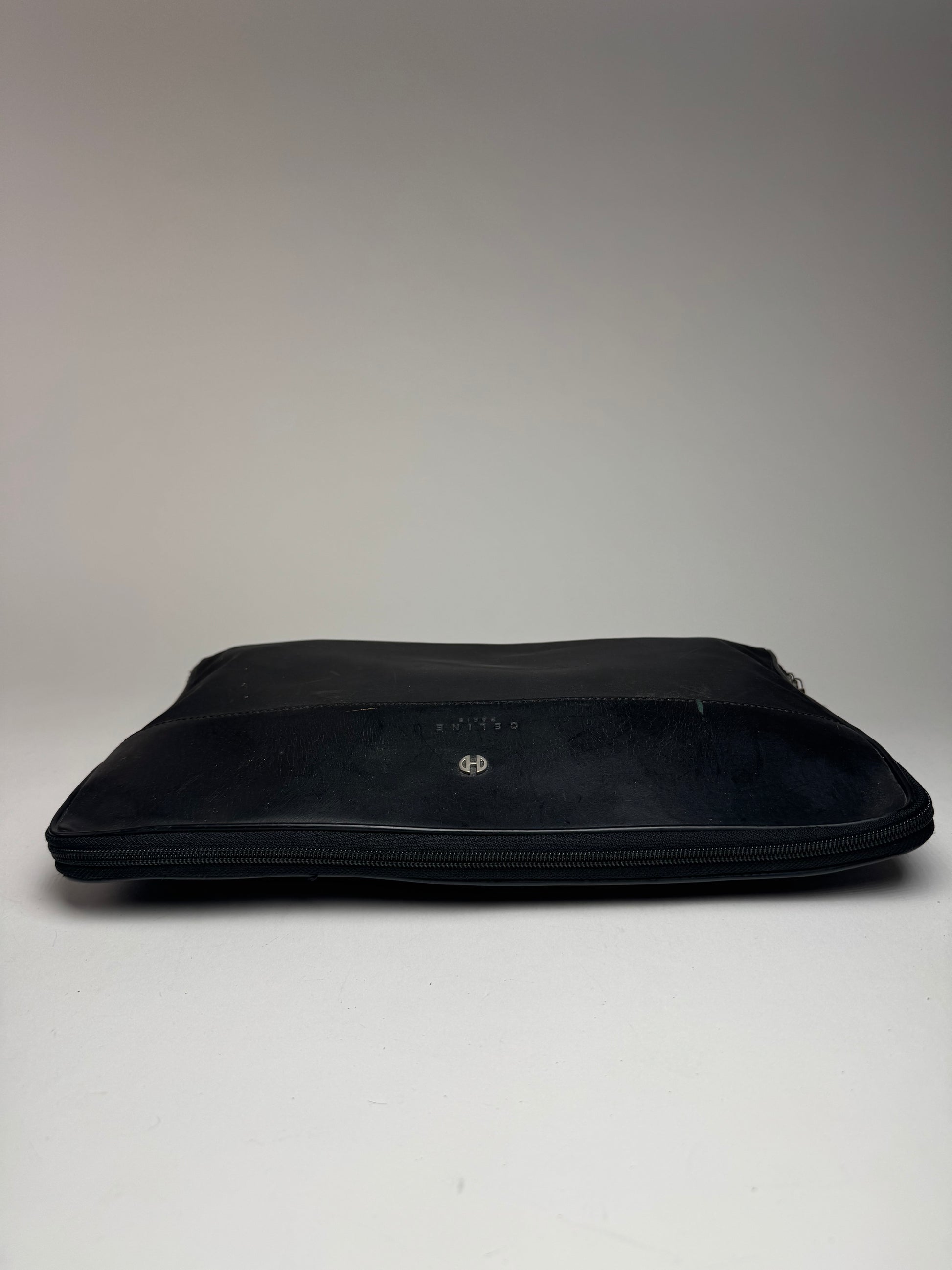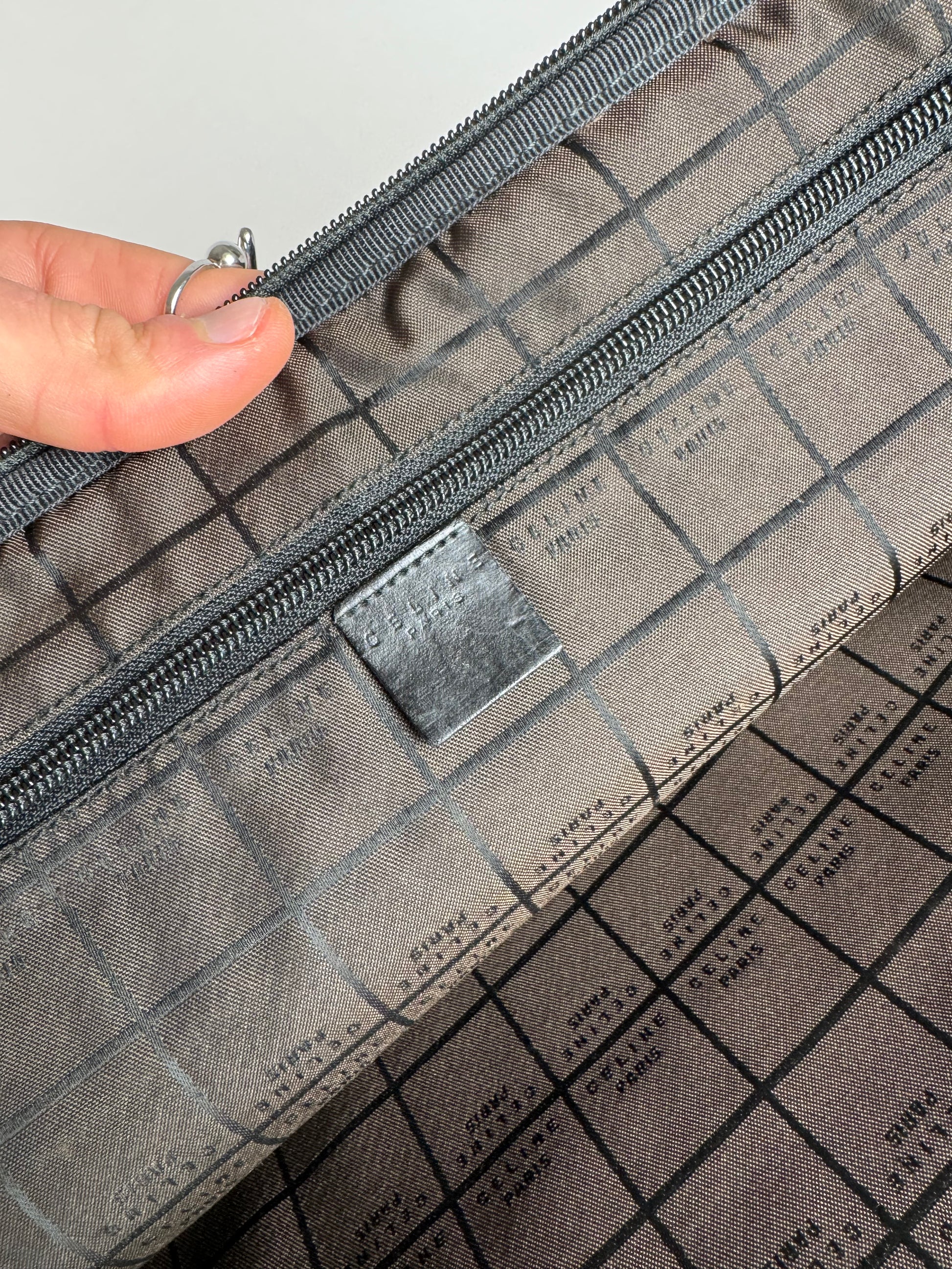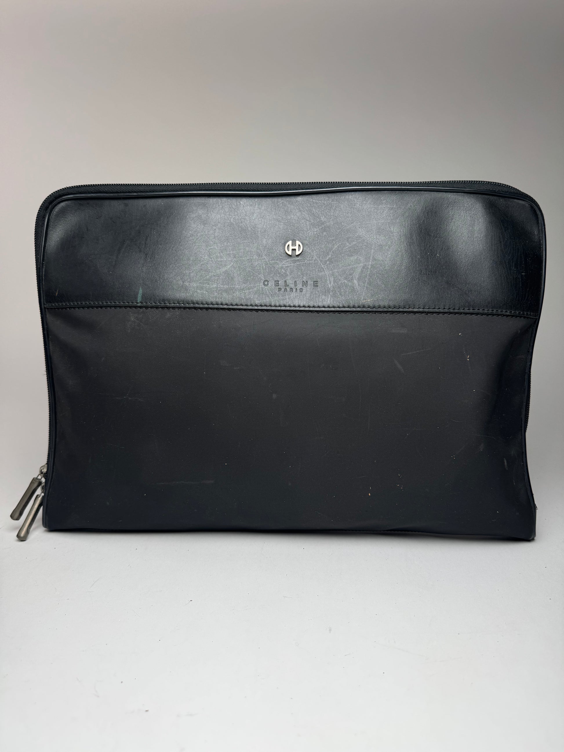 CELINE PARIS Vintage Triomphe Clutch. This elegant vintage Triomphe clutch from Celine Paris is crafted from a combination of black leather and black vegan leather, offering a refined and timeless aesthetic. The interior is lined with brown canvas featuring the iconic Celine monogram, adding a classic touch. The clutch is finished with silver-toned steel hardware, enhancing its sleek and modern appeal. Made in Italy, this piece showcases Celine’s signature craftsmanship.