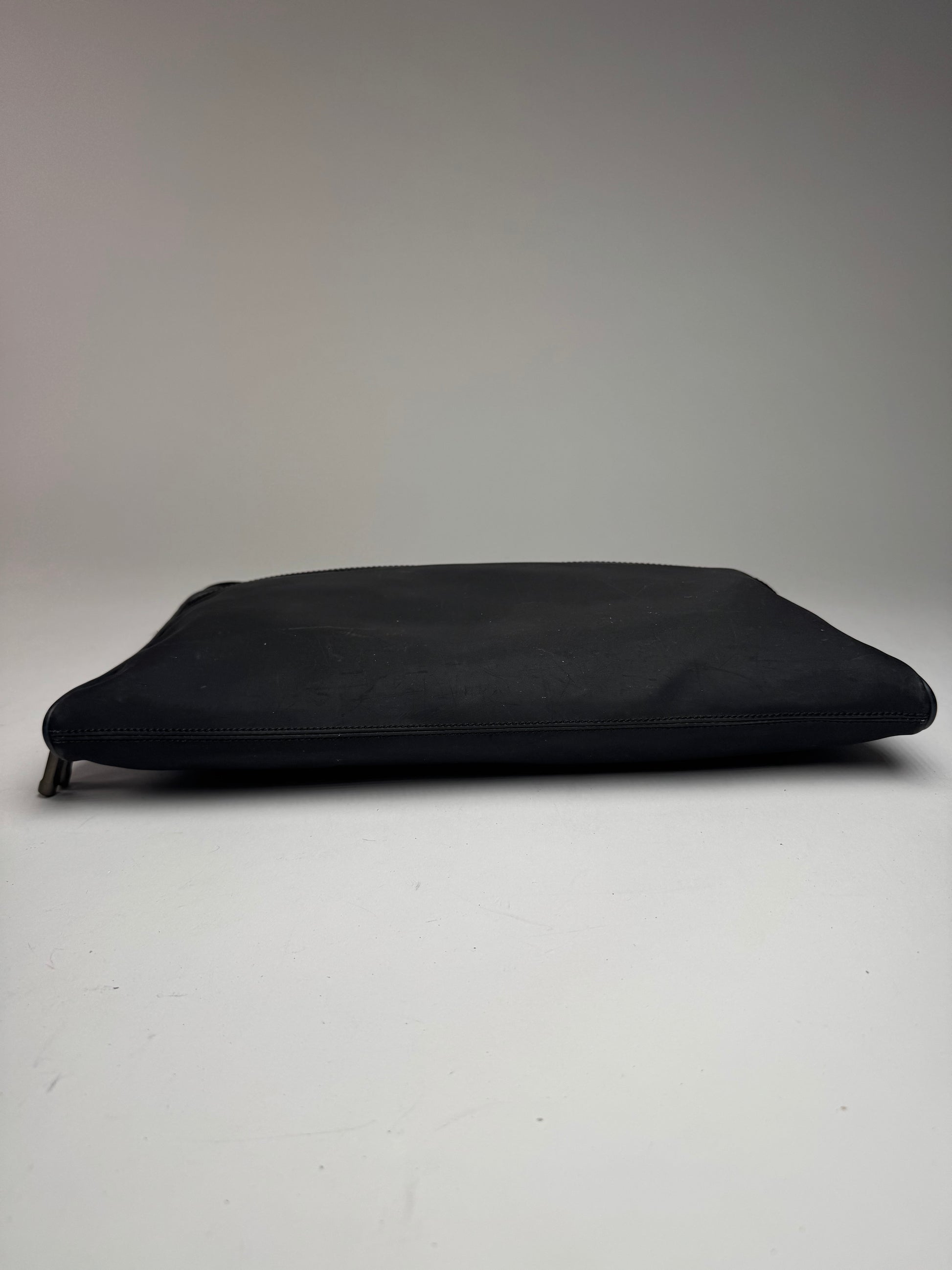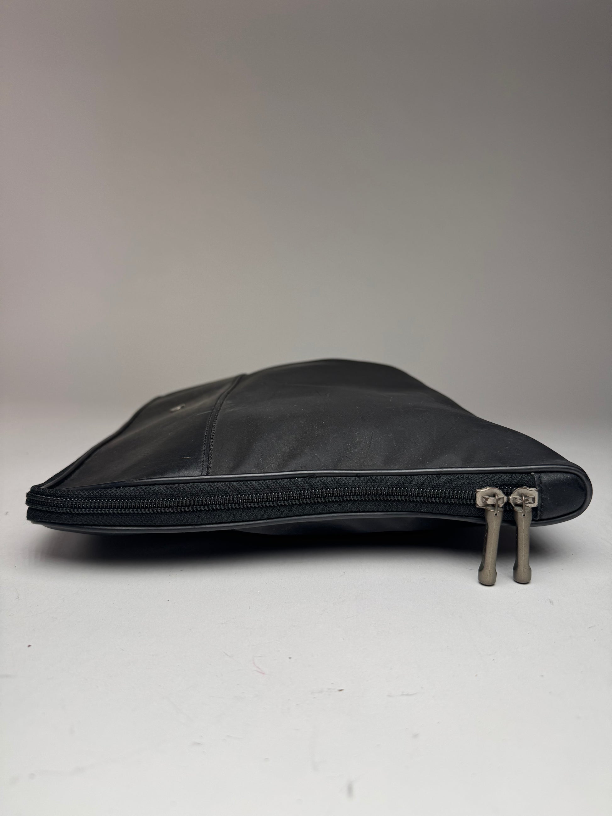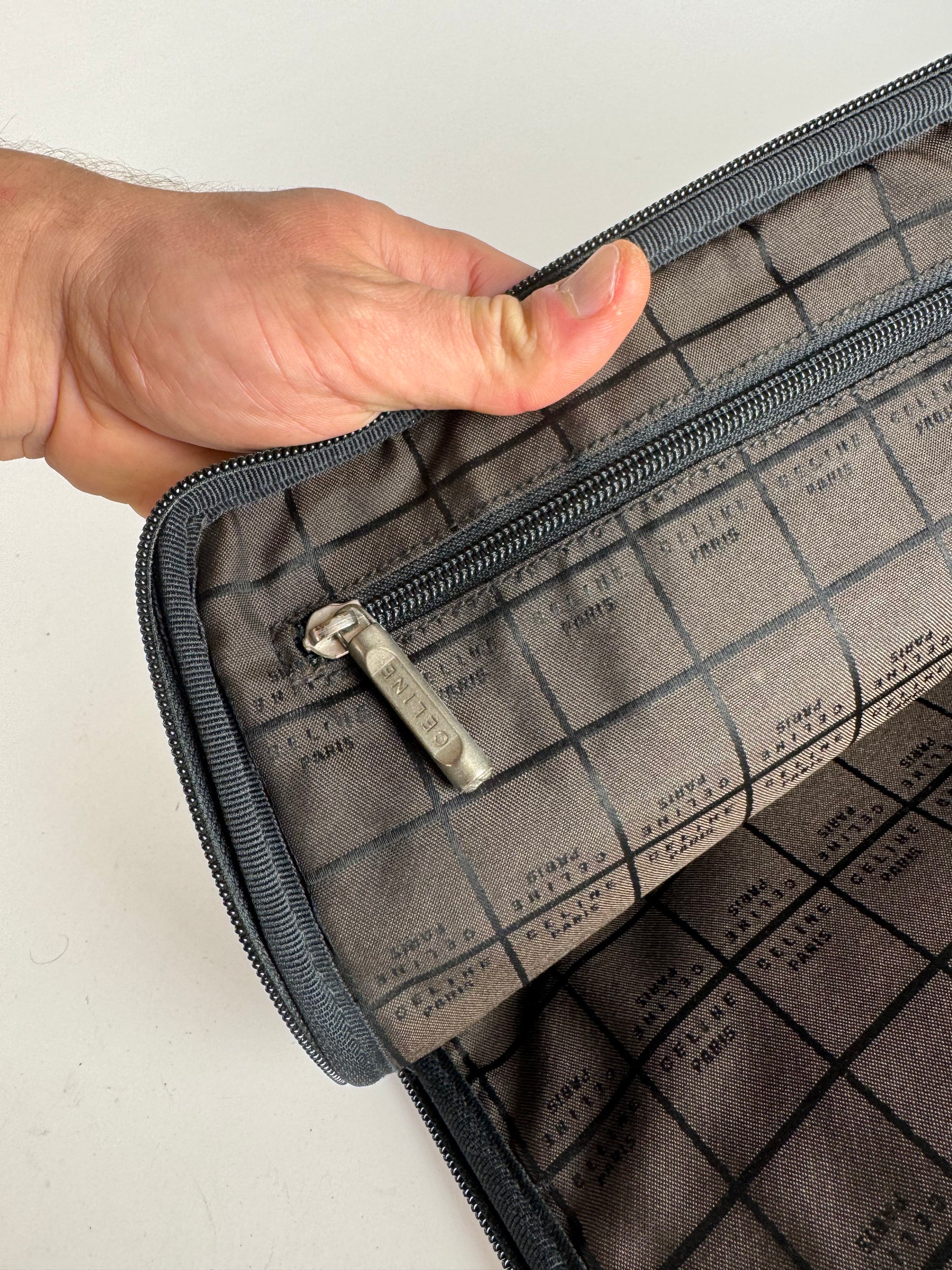 CELINE PARIS Vintage Triomphe Clutch. This elegant vintage Triomphe clutch from Celine Paris is crafted from a combination of black leather and black vegan leather, offering a refined and timeless aesthetic. The interior is lined with brown canvas featuring the iconic Celine monogram, adding a classic touch. The clutch is finished with silver-toned steel hardware, enhancing its sleek and modern appeal. Made in Italy, this piece showcases Celine’s signature craftsmanship.