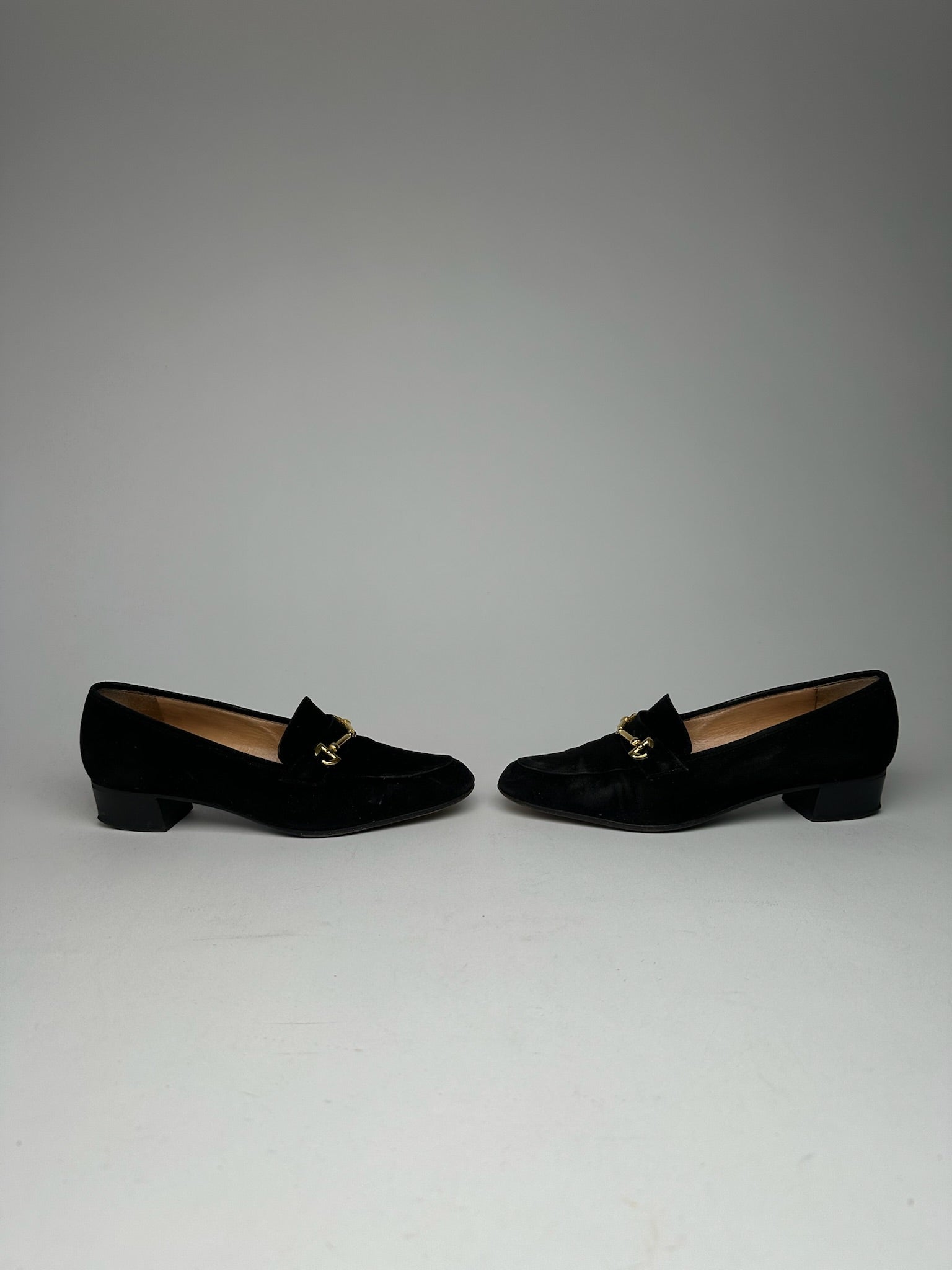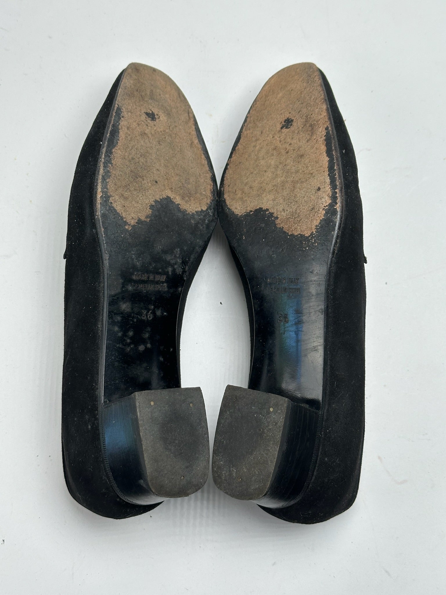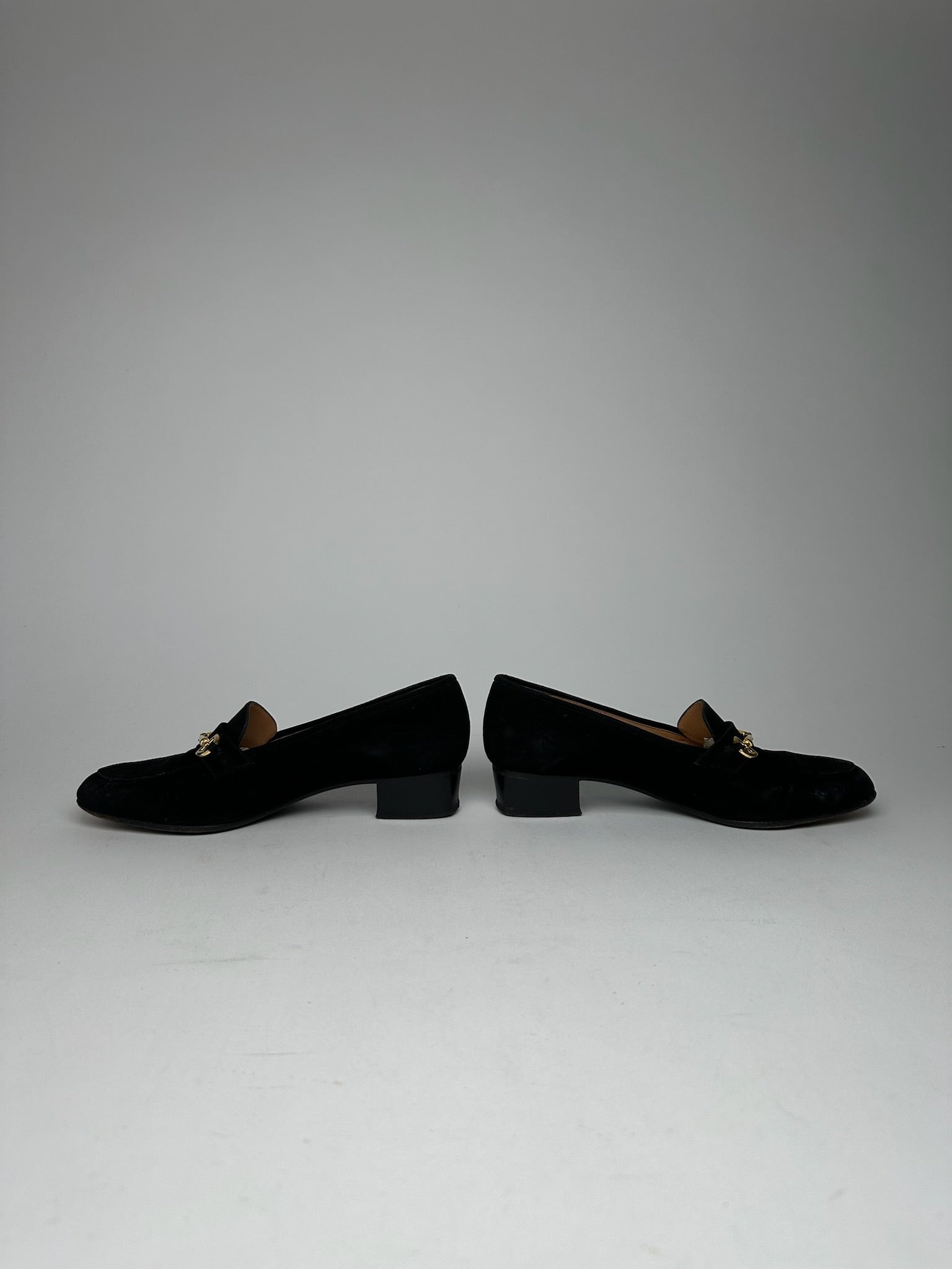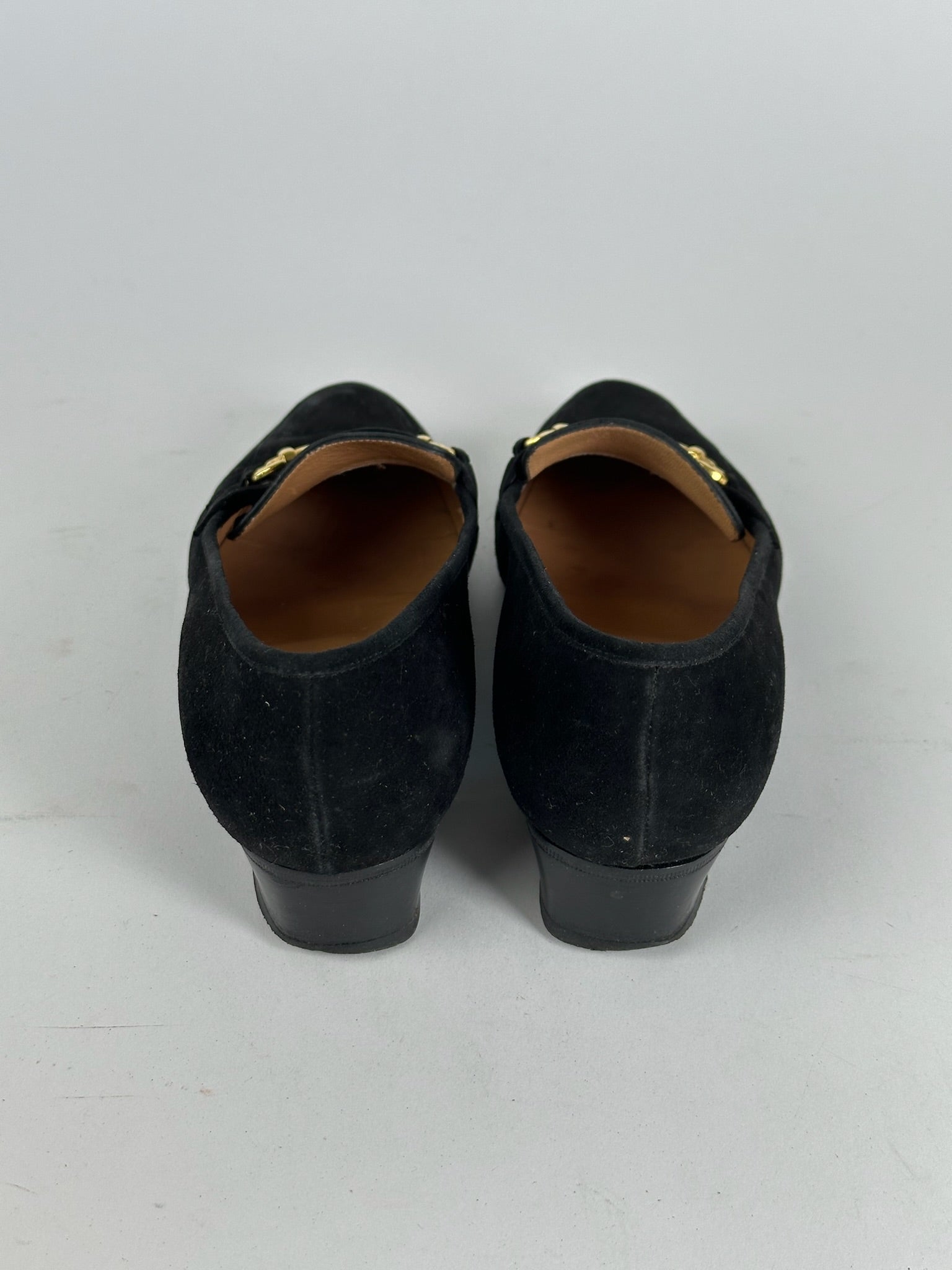These chic loafers are crafted from black suede and feature a 4 cm heel and a distinctive gold-toned steel horseshoe appliqué across the vamp. A refined silhouette with timeless Céline elegance. Made in France.