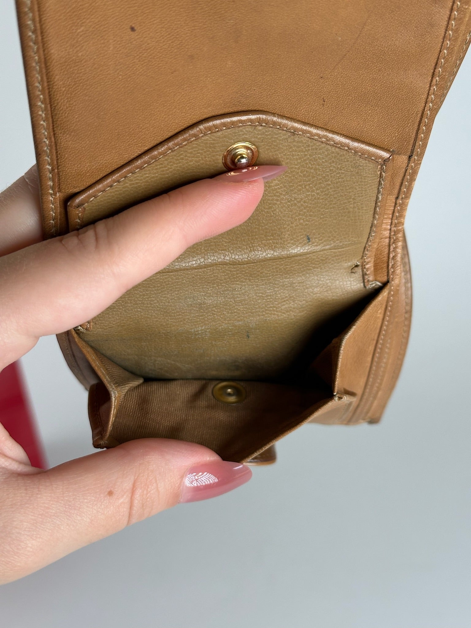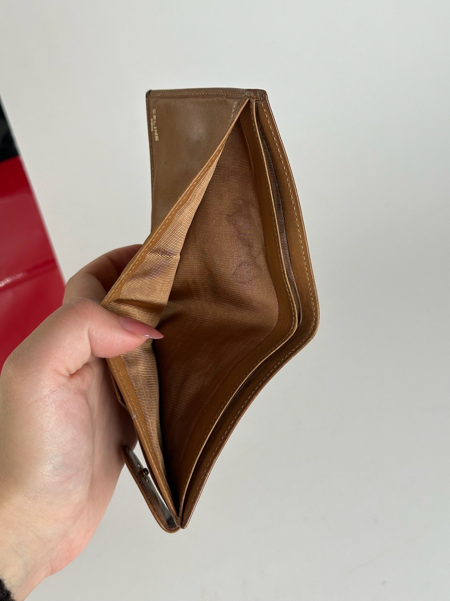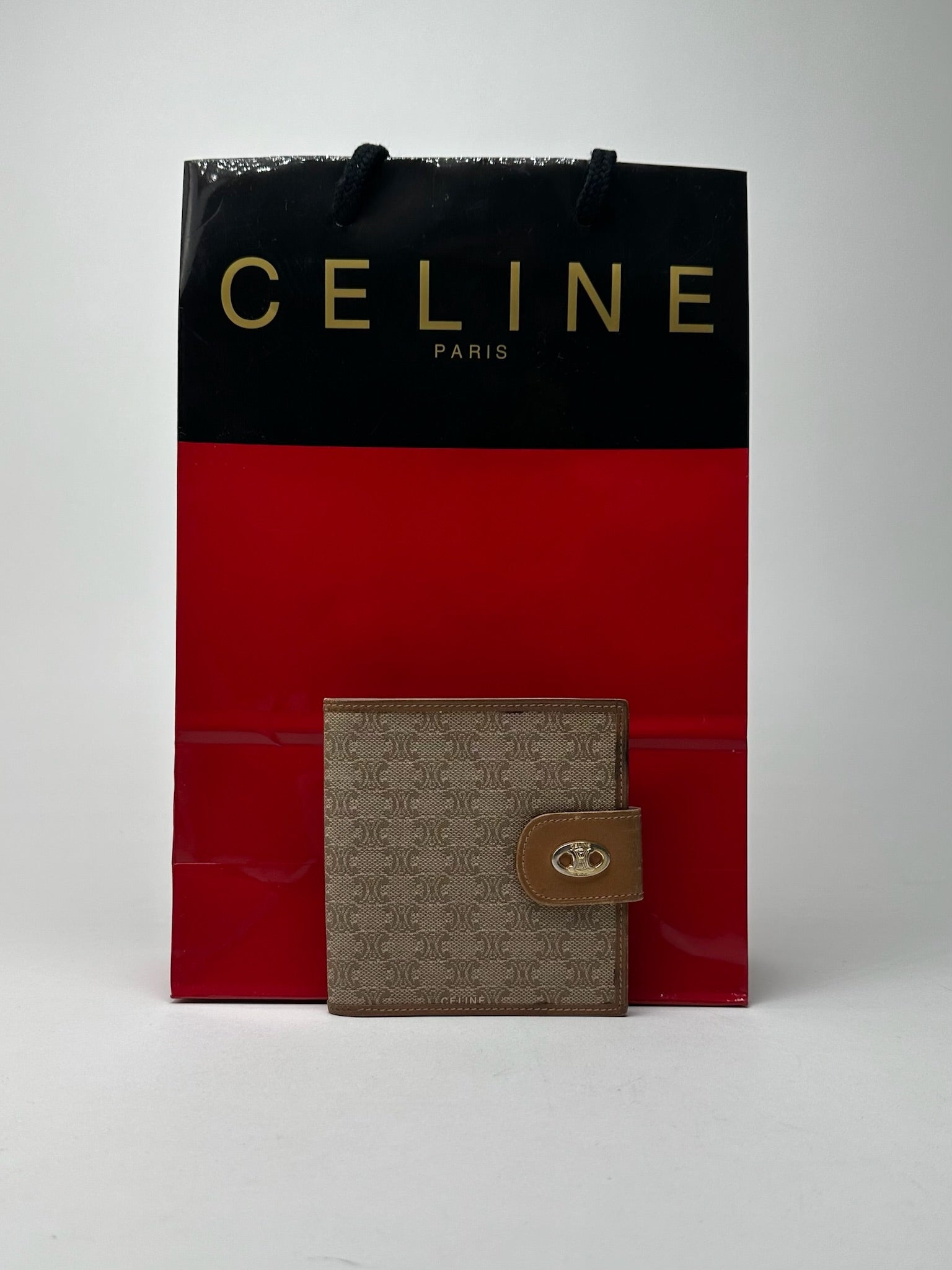 CELINE Vintage Monogram Leather Wallet. This chic wallet is finely crafted of beige CELINE logo monogram leather with light brown leather trim. The front features a gold-tone CELINE logo accent, and the wallet closes with a snap button. The interior is lined with matching light brown leather.
