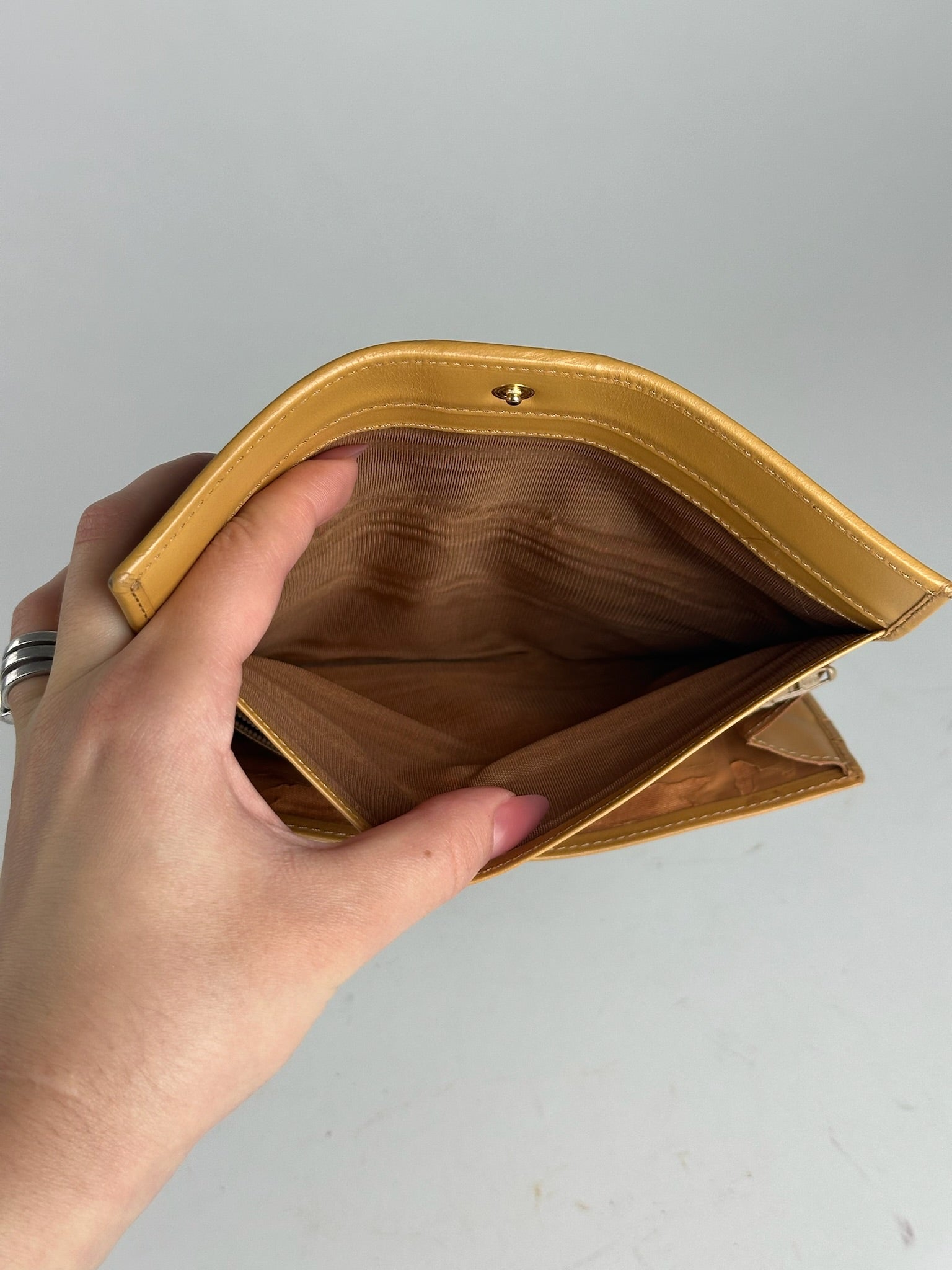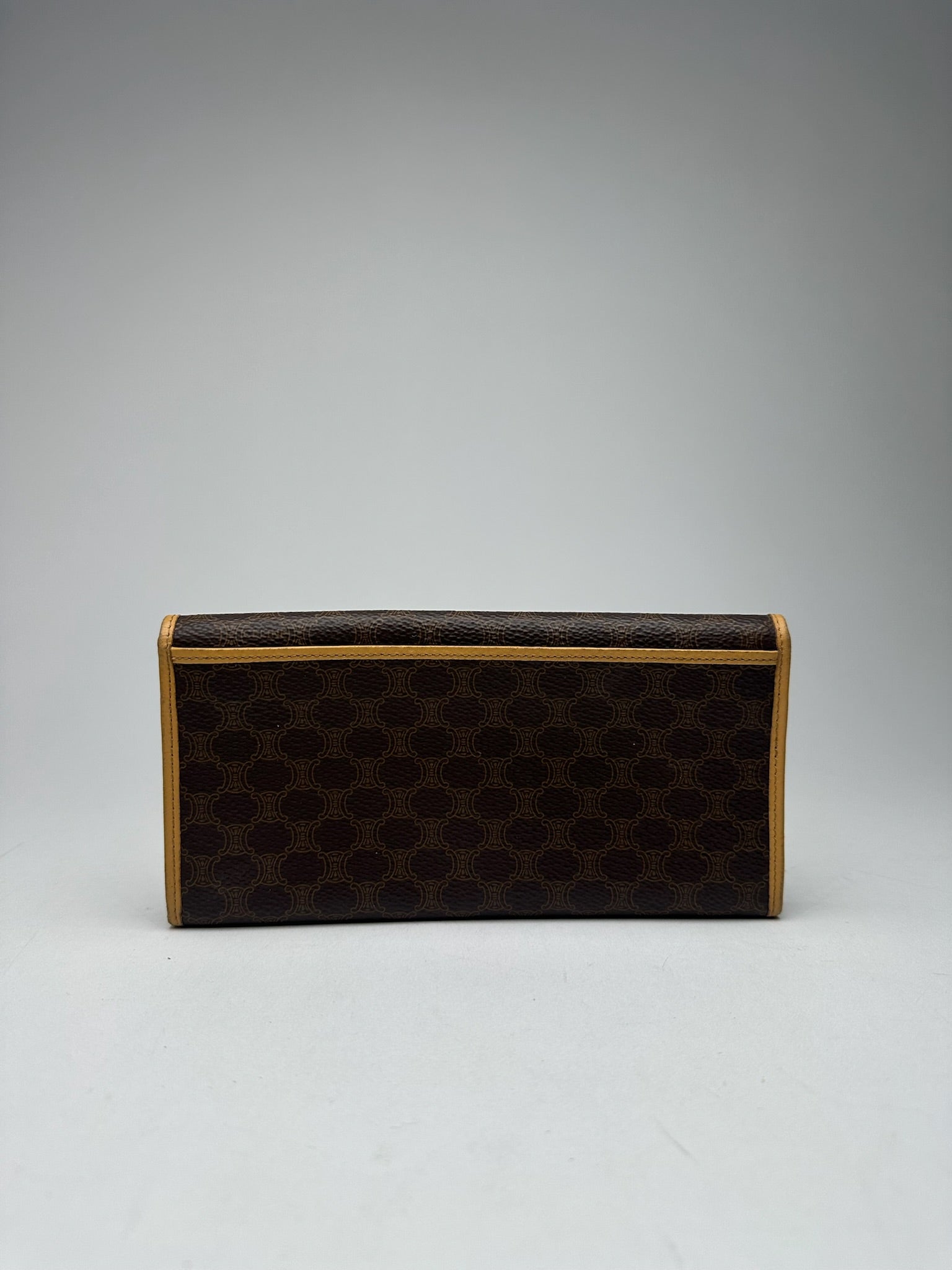 CELINE PARIS Monogram Wallet. This elegant wallet is finely crafted of brown Céline monogram leather with mustard leather accents. The interior is lined with matching mustard leather.