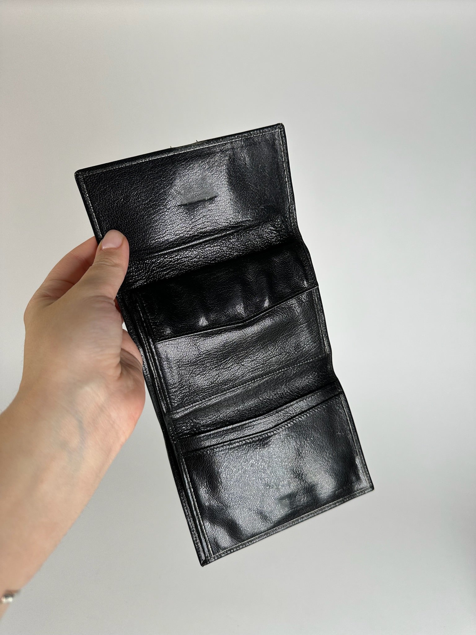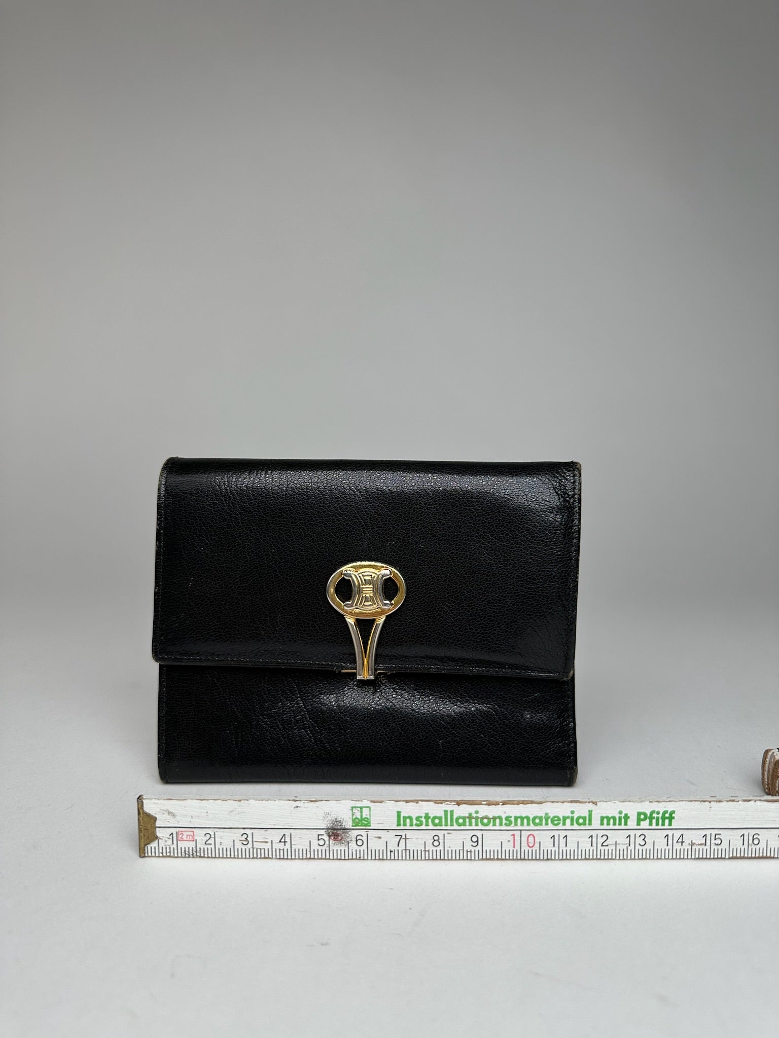 CELINE PARIS Triomphe Vintage Wallet. This chic unisex accessory is finely crafted of black leather and features gold-tone steel hardware. The design reflects the timeless elegance of the Triomphe line.