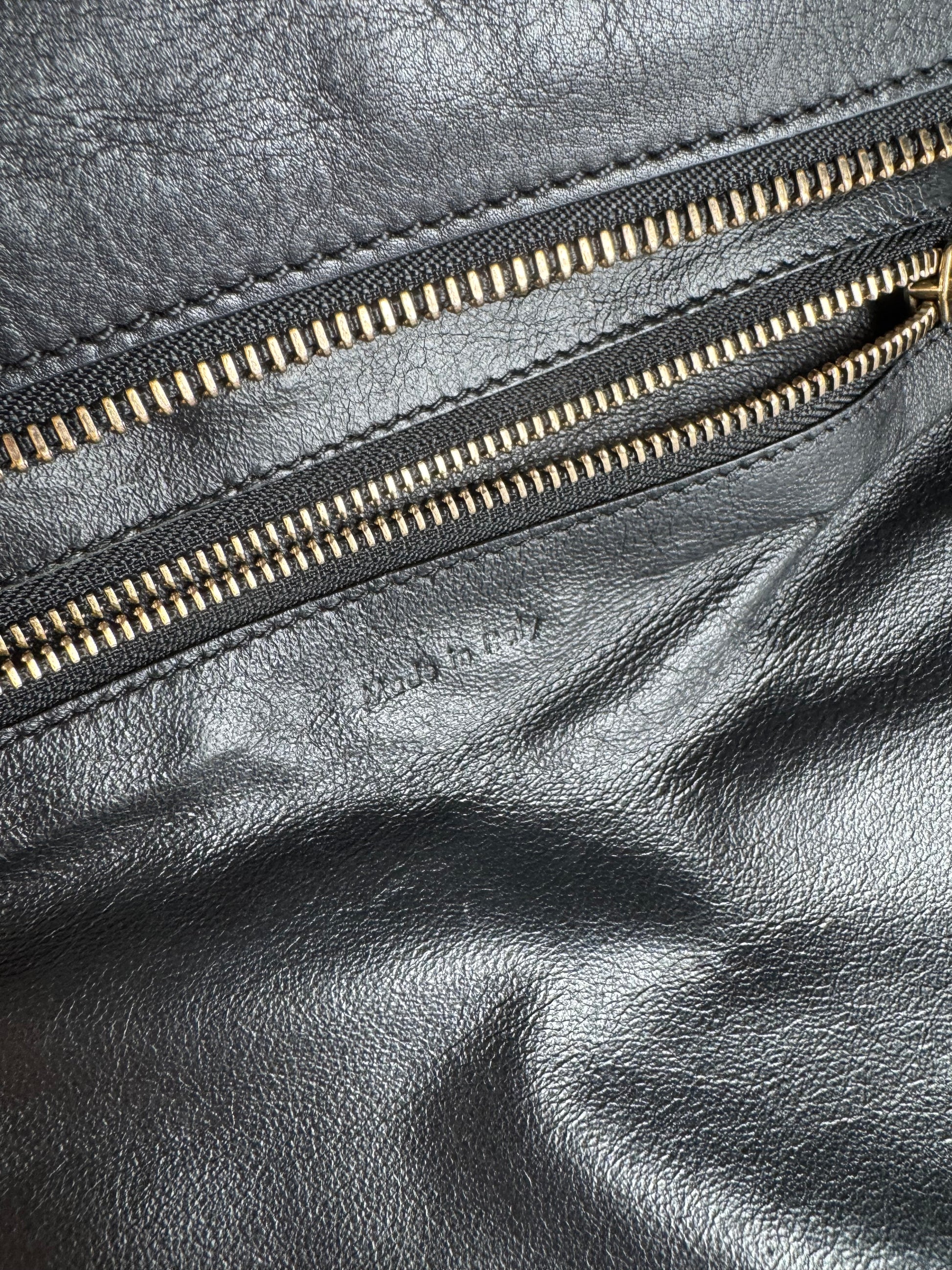 CELINE Luggage. This iconic handbag is known for its sculptural silhouette and distinctive front zip detail, making it one of Céline’s most recognizable and timeless designs. The bag is crafted in beige canvas with black leather accents and features brown leather handles and trimmings. The handbag has a top zipper closure and gold-tone steel hardware. The interior is lined with black leather.
