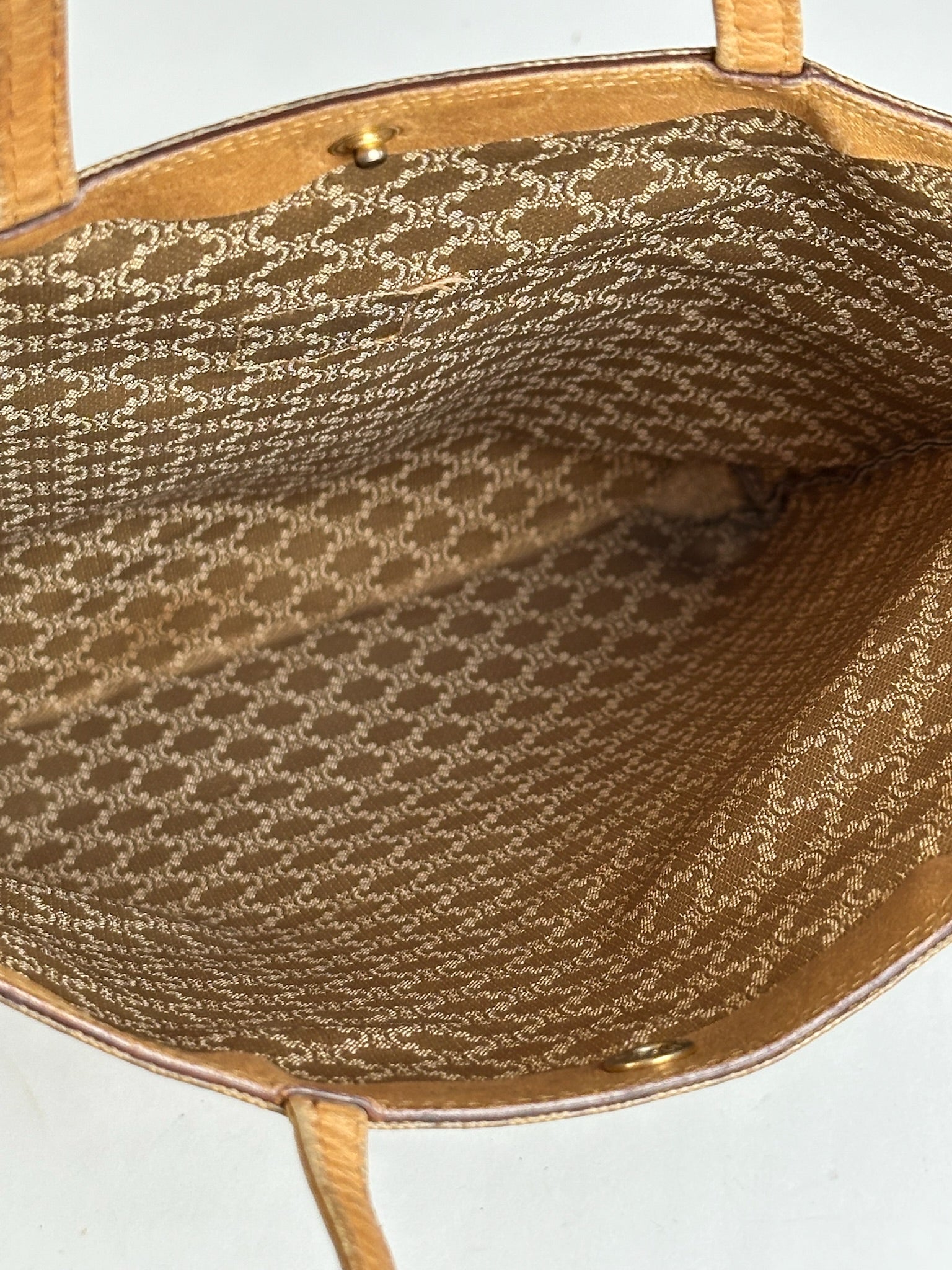 CÉLINE PARIS Vintage Logo Shopper. This chic handbag is finely crafted of gold-brown leather with the signature CELINE logo monogram throughout. The bag features short handles and a snap button closure. Introduced in the 1970s, the CELINE logo was inspired by the chains encircling the Arc de Triomphe in Paris and remains a classic emblem of French elegance. The top opens to a gold-brown canvas interior with beige CELINE logo monogram.