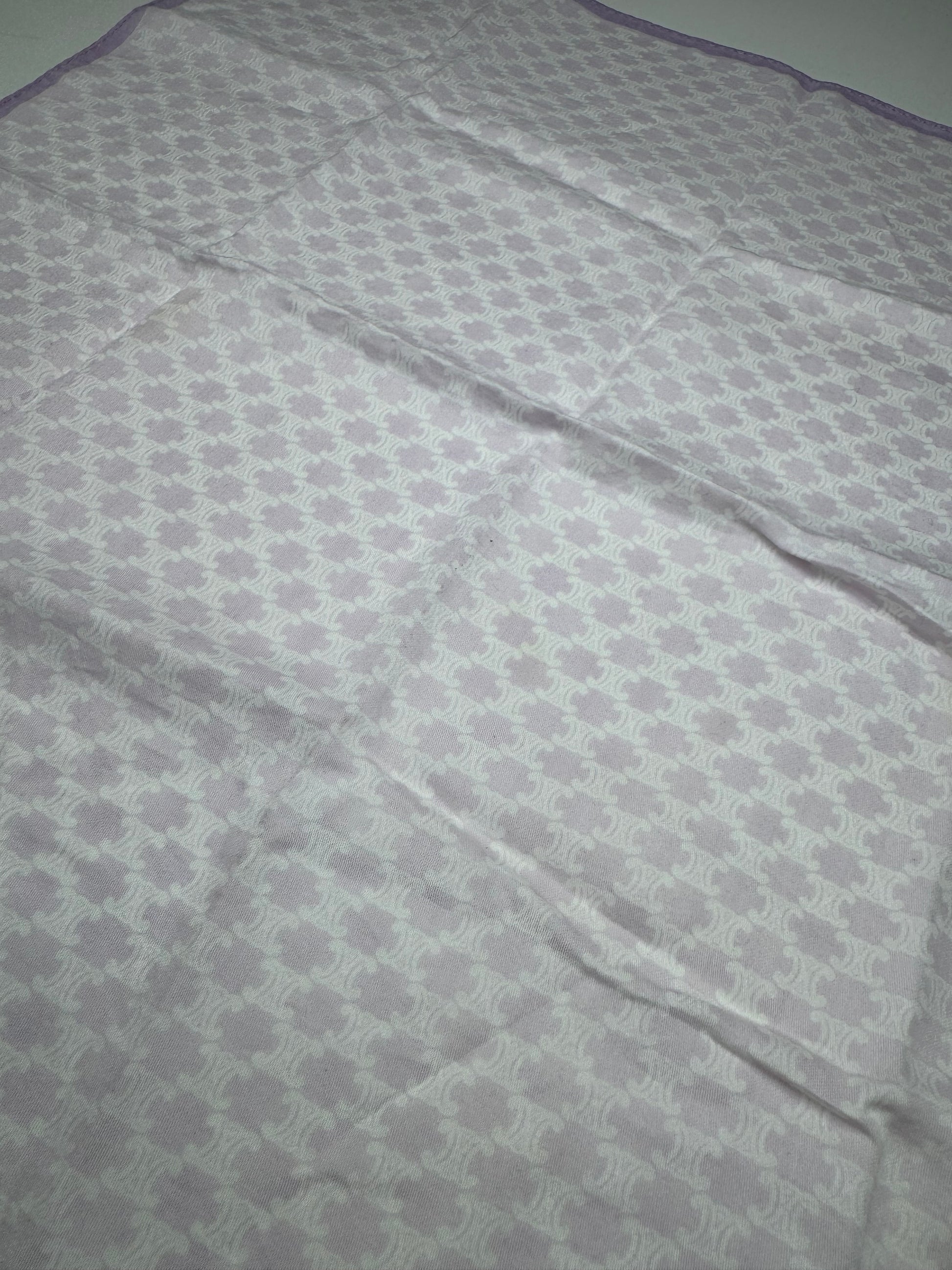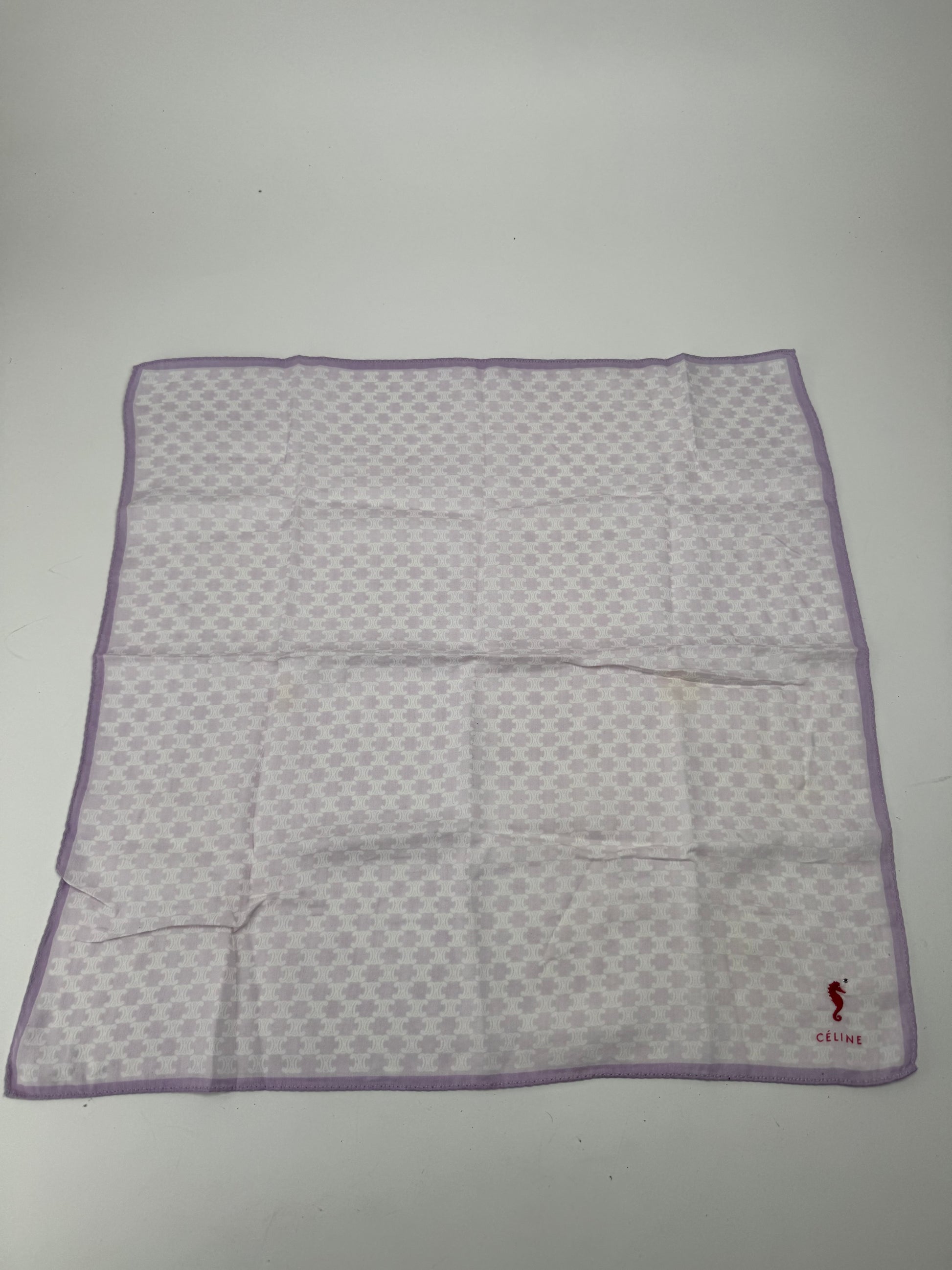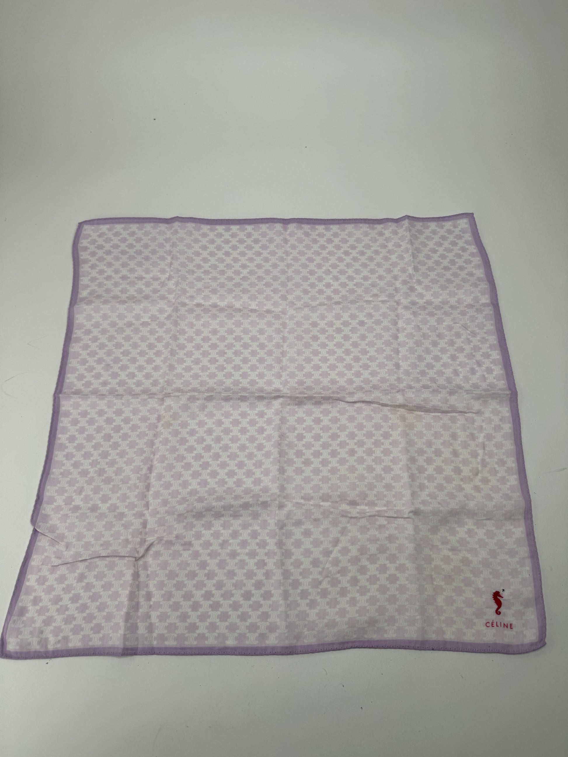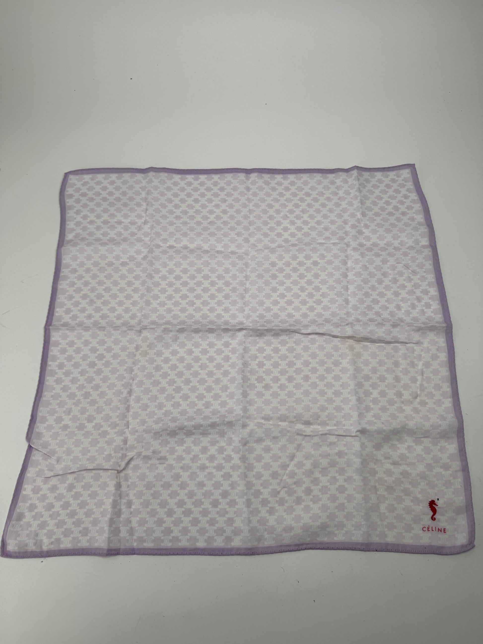 This elegant vintage scarf is finely crafted with a white base and lilac Triumph monogram pattern, framed by a lilac border. The lower right corner features a red seahorse logo with a CELINE signature adorned by a mini Swarovski crystal. The seahorse motif was introduced as part of CELINE’s nautical-inspired designs in the mid-20th century, symbolizing both elegance and strength within the brand’s heritage.