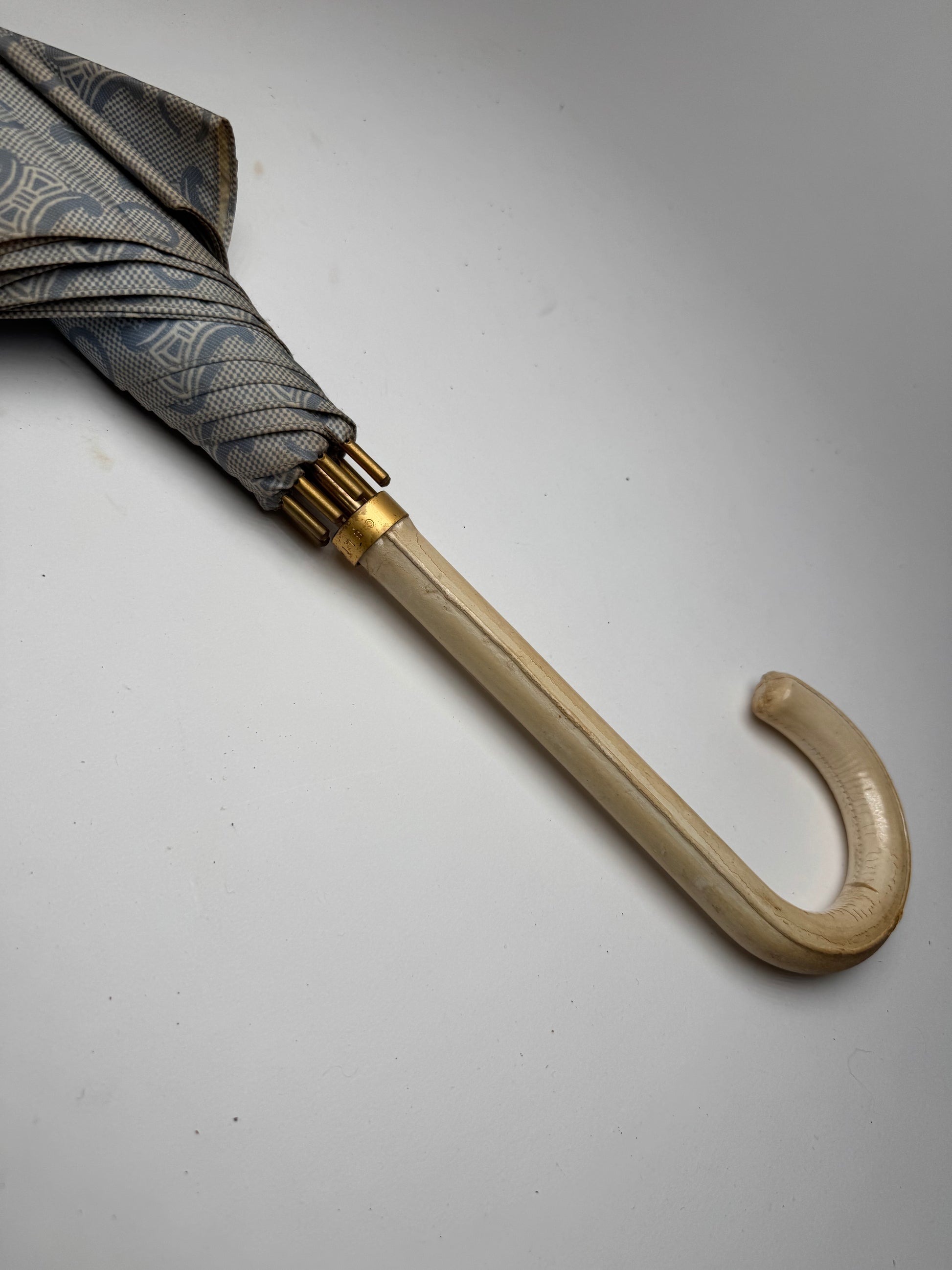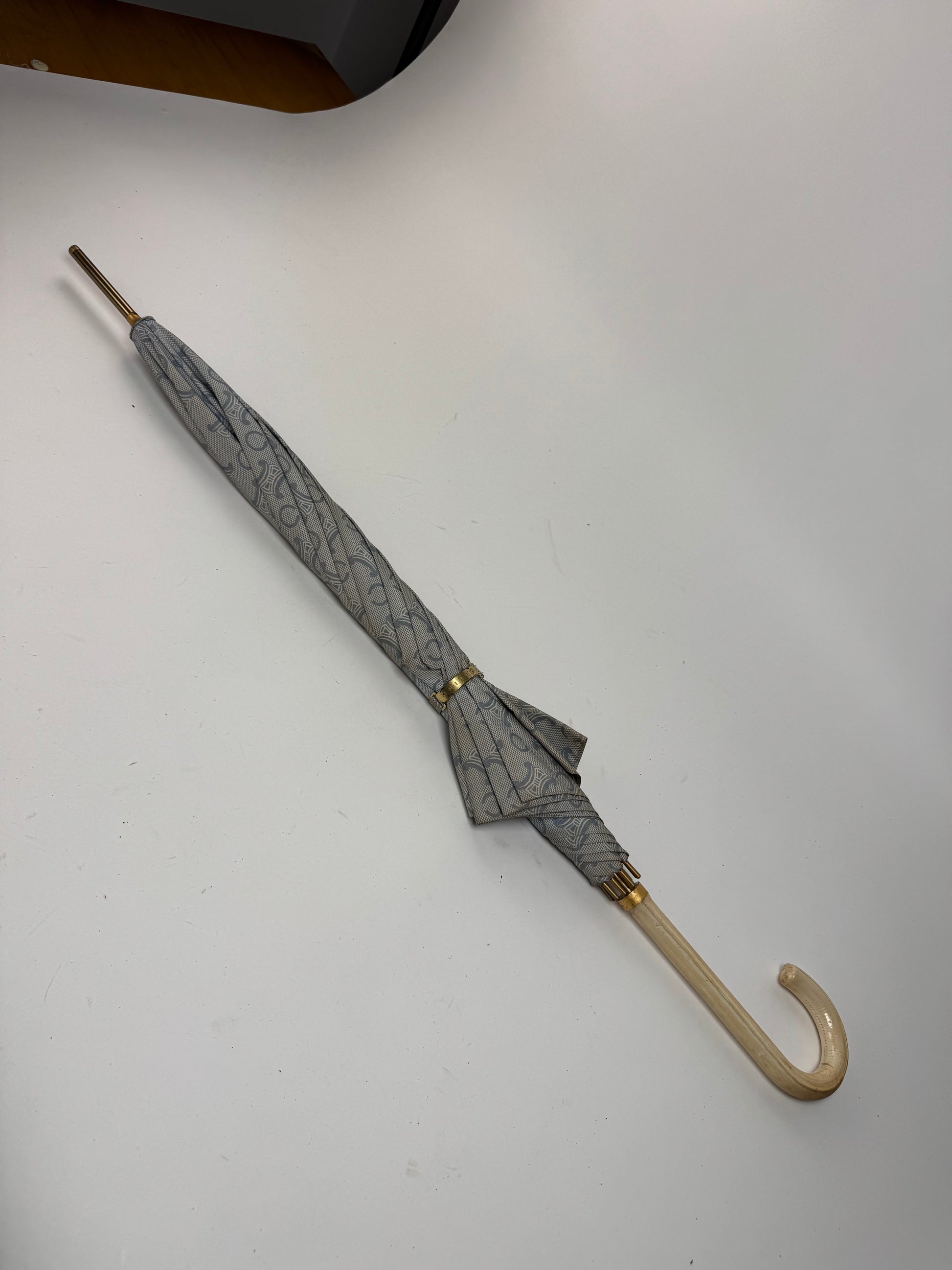 CELINE PARIS Vintage Light Blue Macadam Monogram Umbrella. This unisex vintage umbrella is crafted from light blue canvas featuring the iconic Céline Macadam monogram. It has a curved white plastic handle and gold-tone steel hardware, with a total length of 90 cm. The umbrella shows some brown staining but remains in good vintage condition.