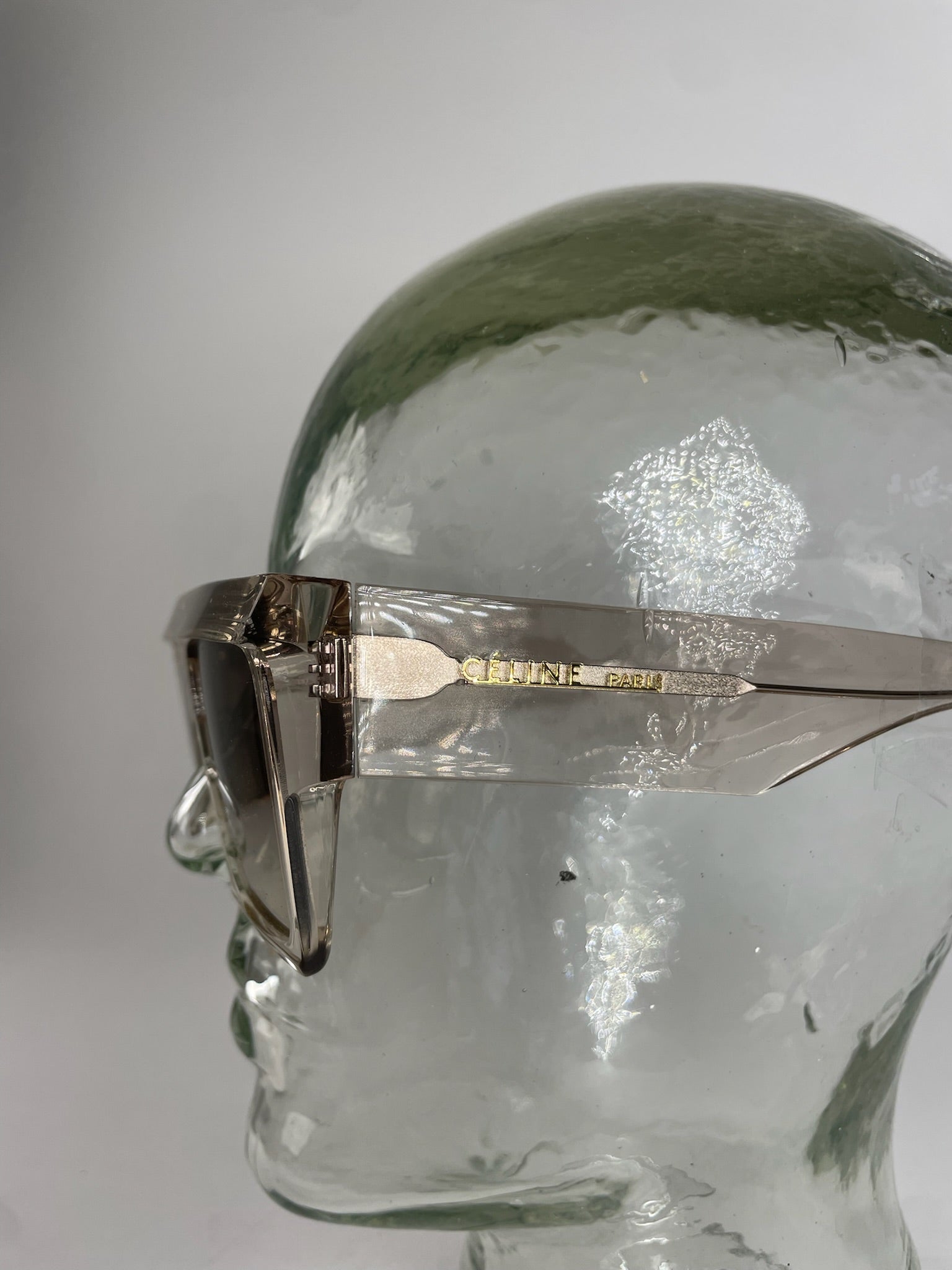 CELINE PARIS Futuristic Oversized Sunglasses. These statement sunglasses feature a futuristic, oversized silhouette crafted of silver-transparent plastic with grey tinted lenses. The temples are detailed with a gold-tone CELINE PARIS signature, adding a sleek luxury finish.