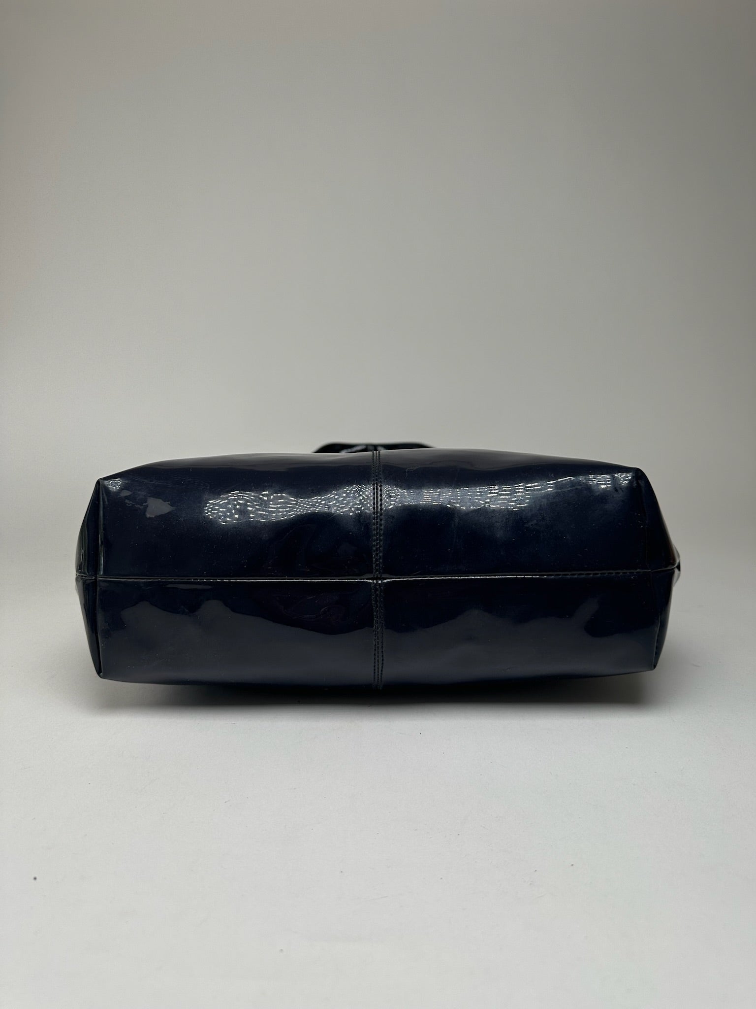 This sophisticated handbag is finely crafted of navy blue patent leather. The bag features a shoulder strap, silver-tone stainless steel hardware, and two magnetic closures.