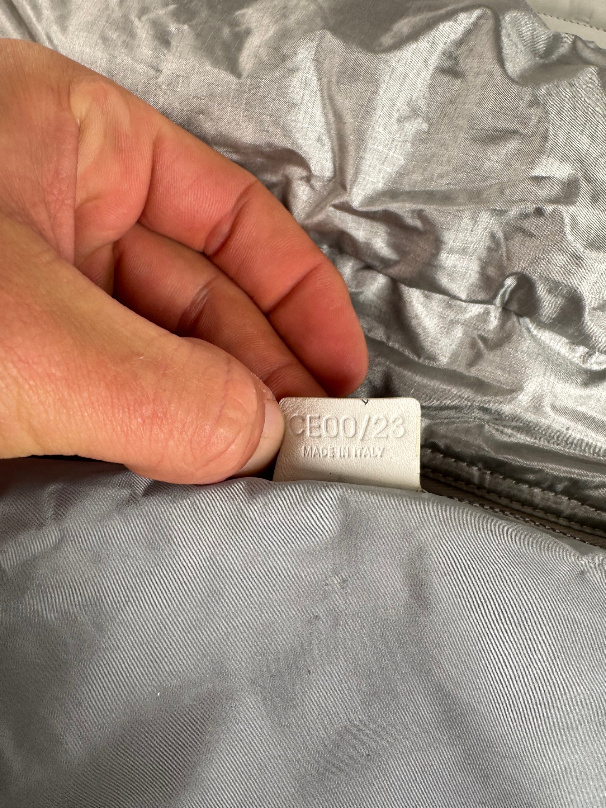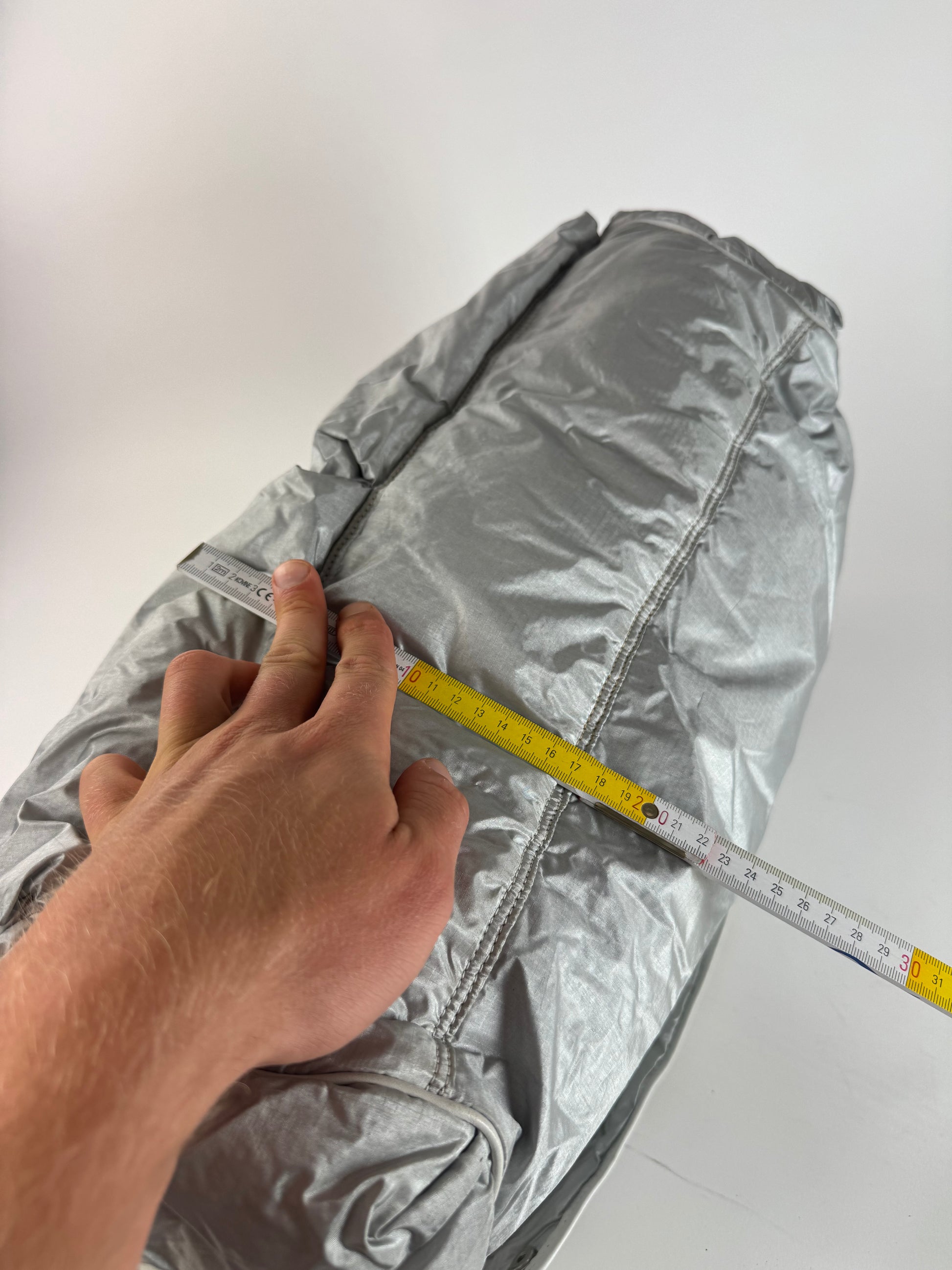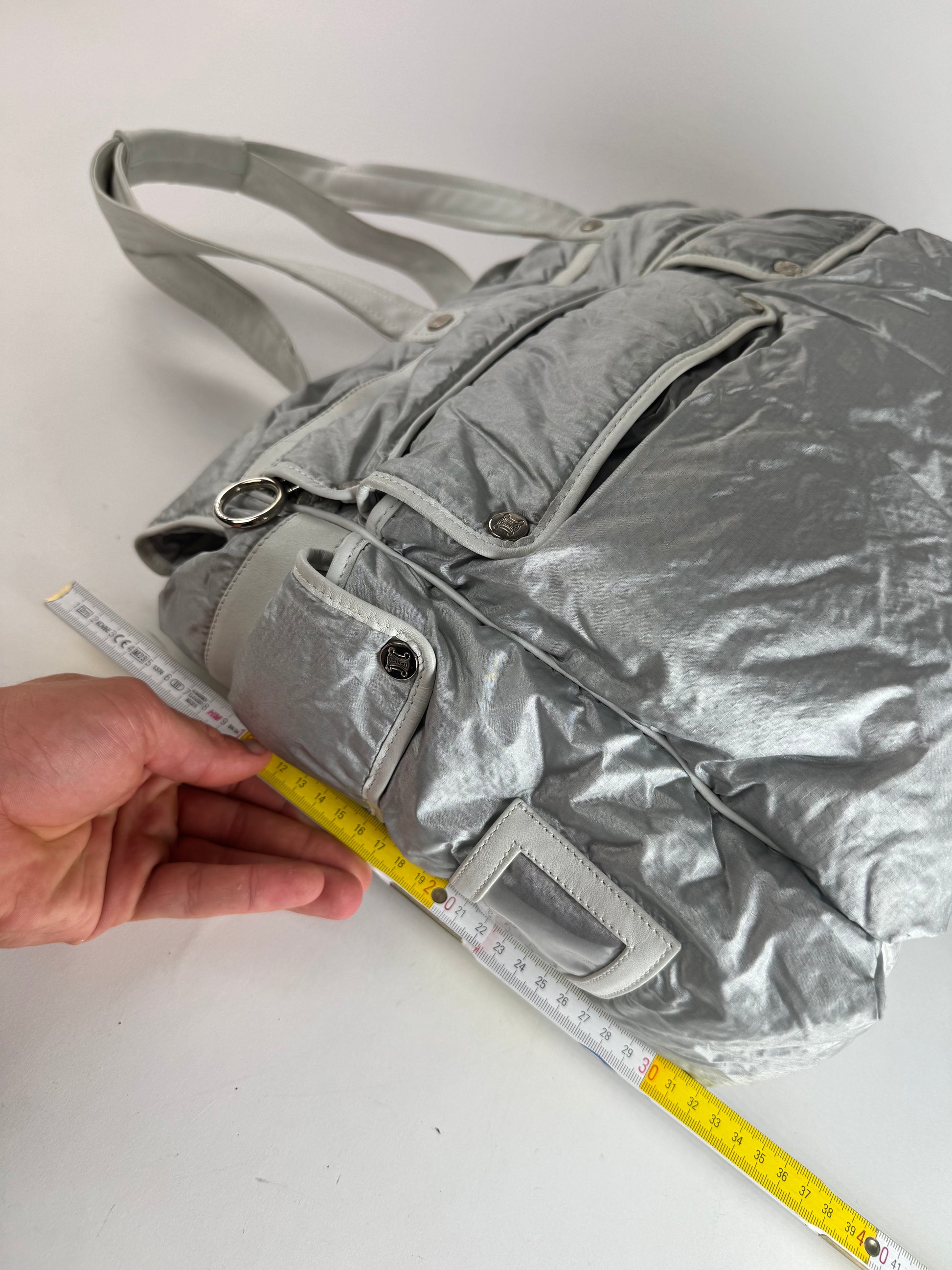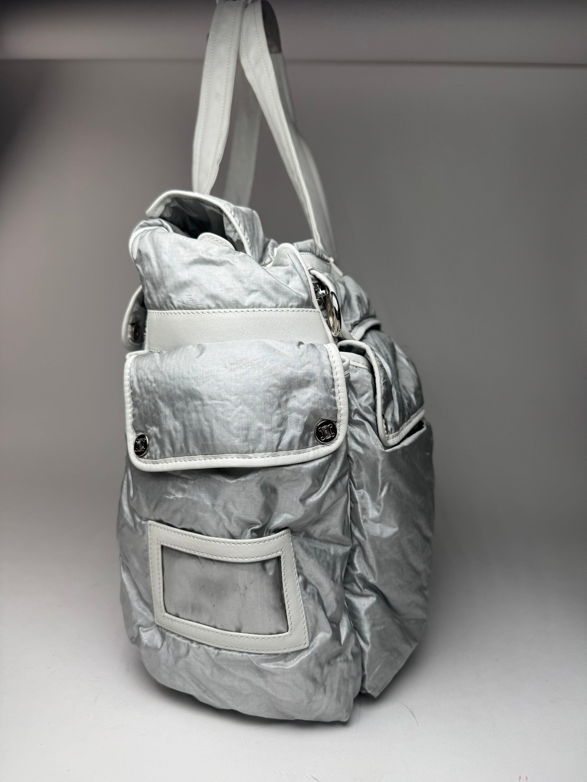 CÉLINE PARIS Vintage Travel Bag. This chic handbag is finely crafted of silver puffer-style material with white leather handles and trim. The bag features numerous compartments and zippered pockets throughout.