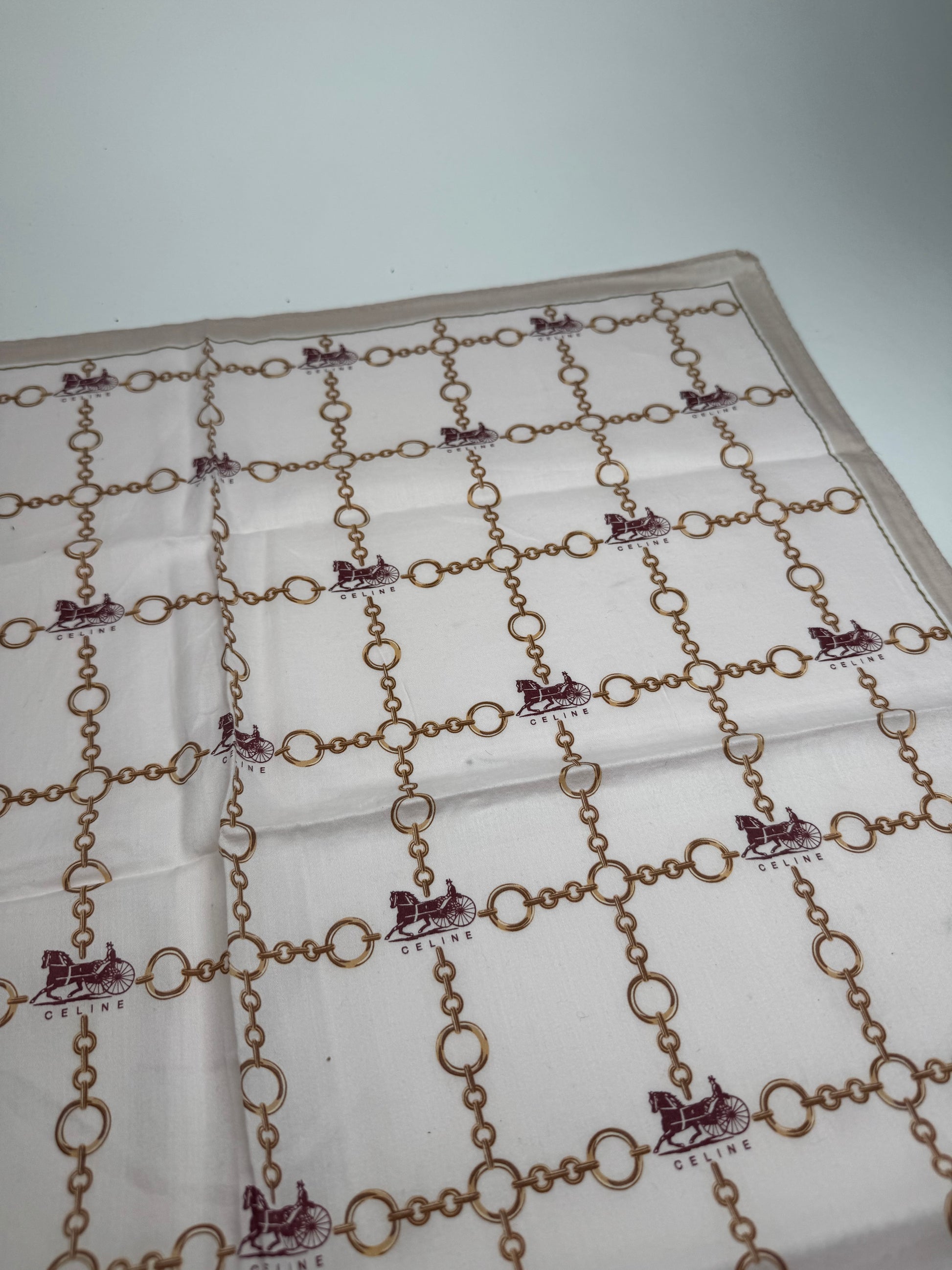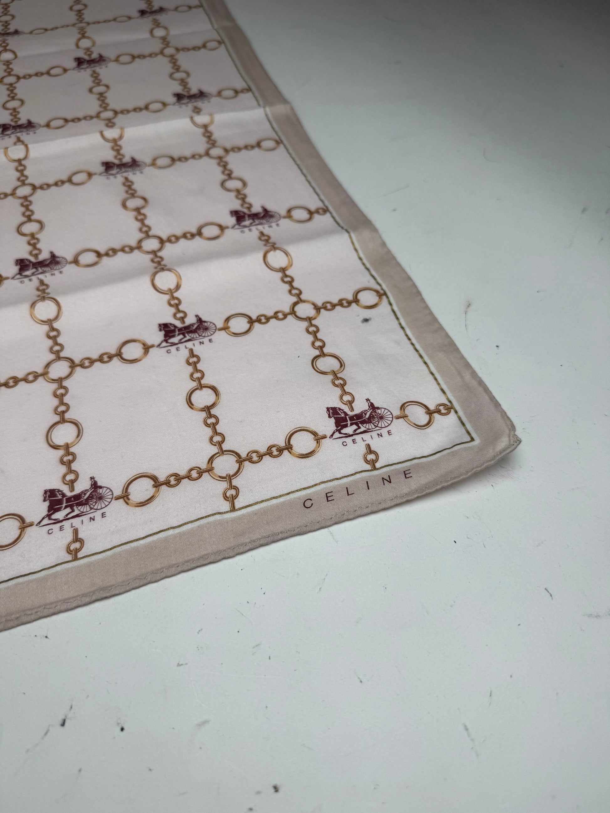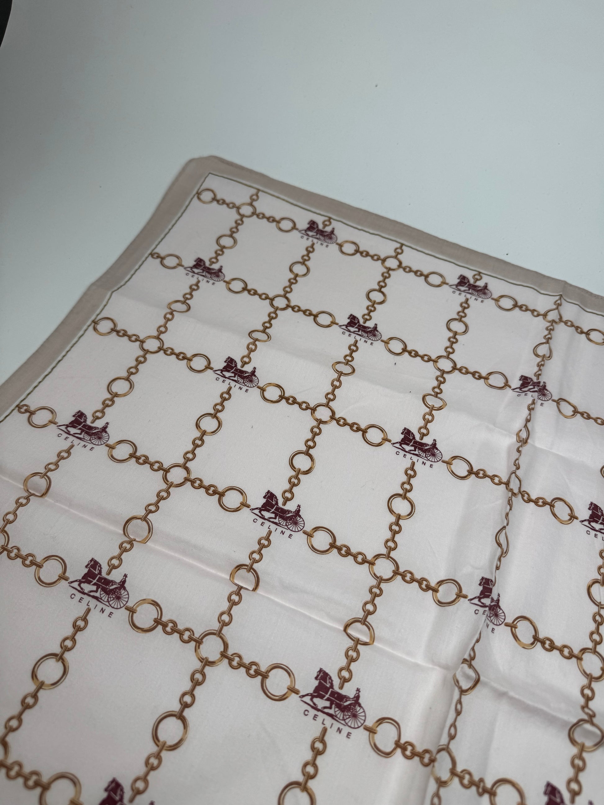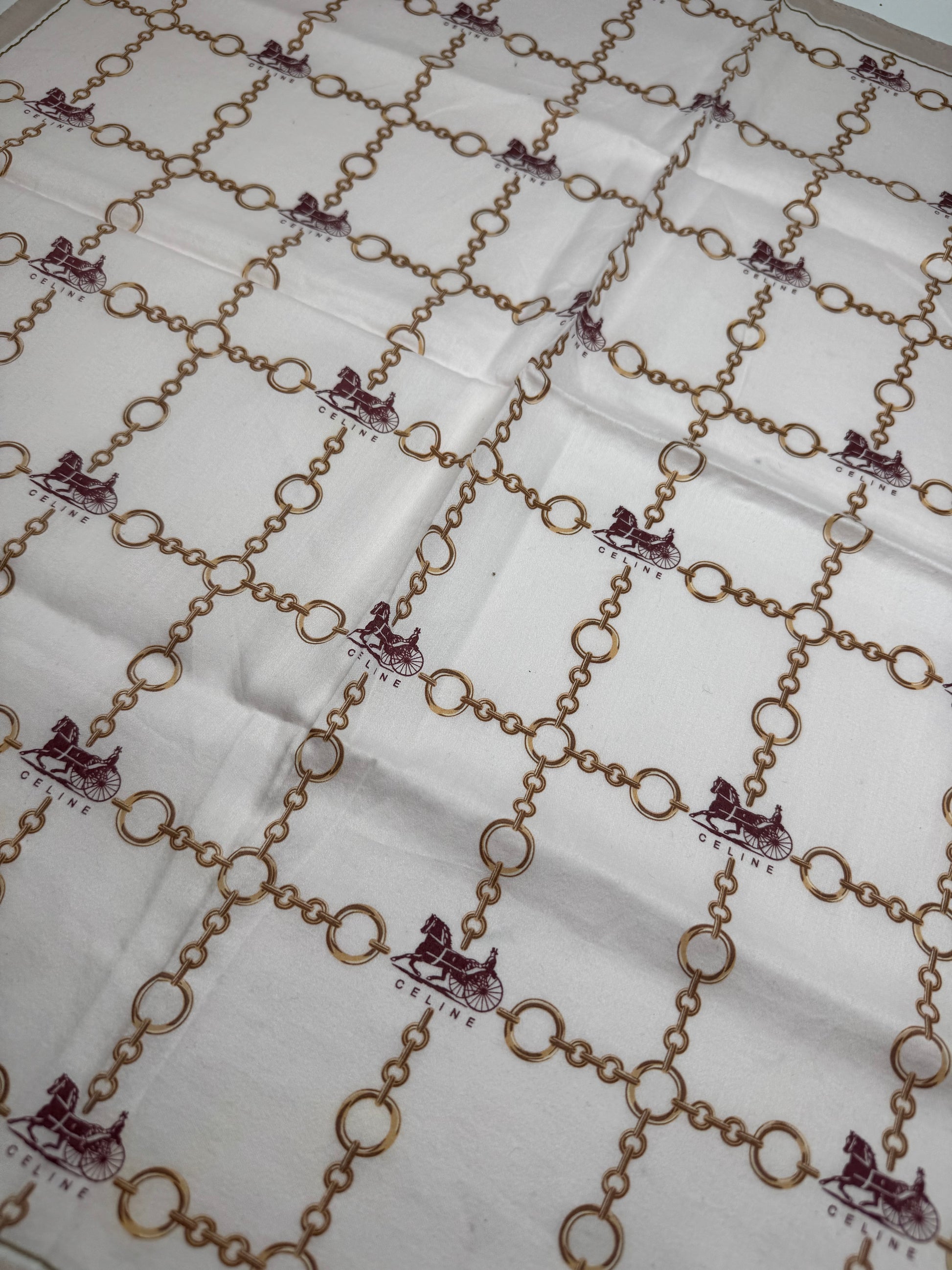 CELINE PARIS Chain & Carriage Print Scarf. This vintage scarf is crafted from a soft blend of silk and cotton with a cream-colored base and a taupe-brown border. The design features golden chain motifs and purple-brown carriage elements, reflecting the brand’s classic equestrian influences.
