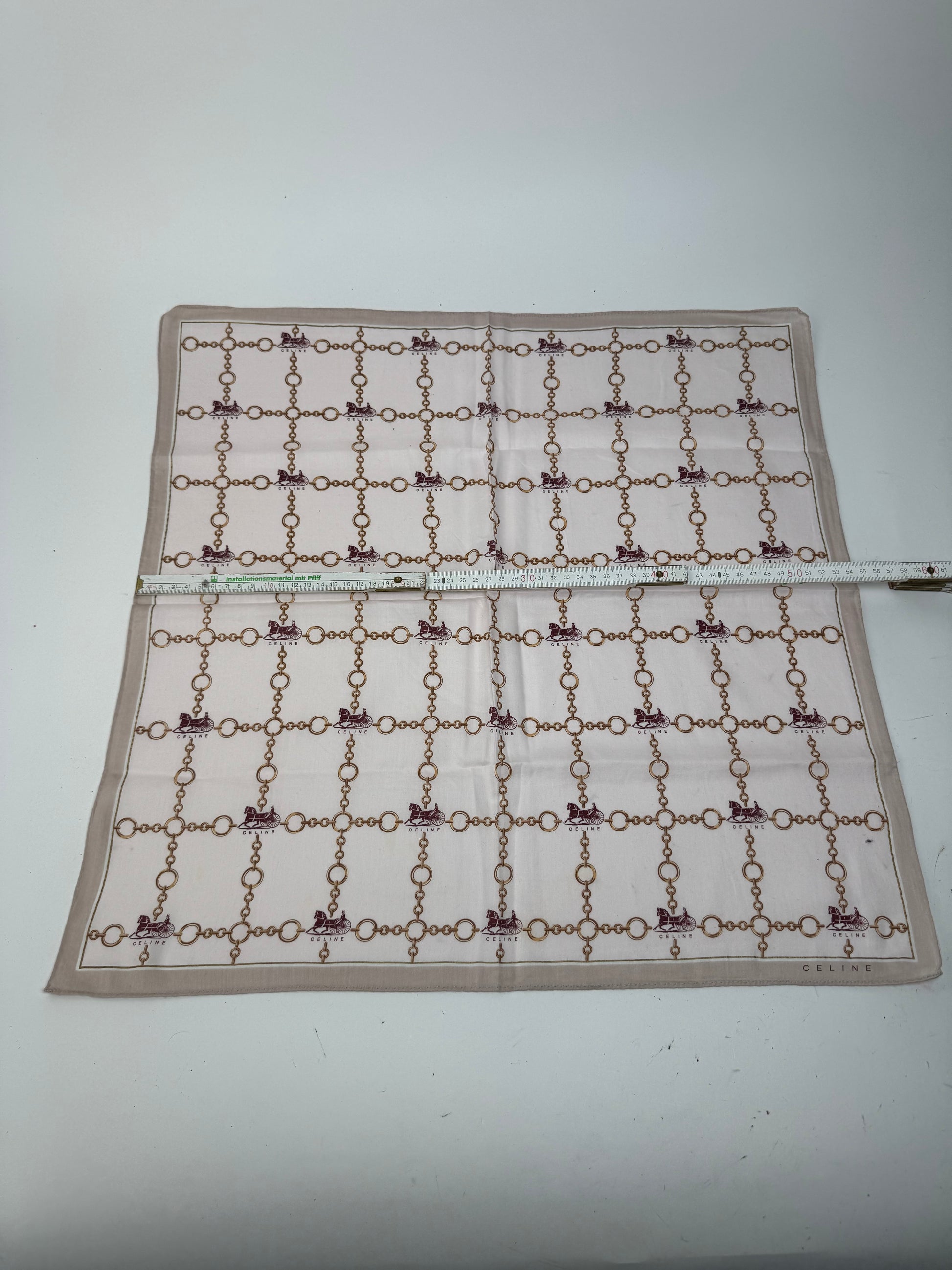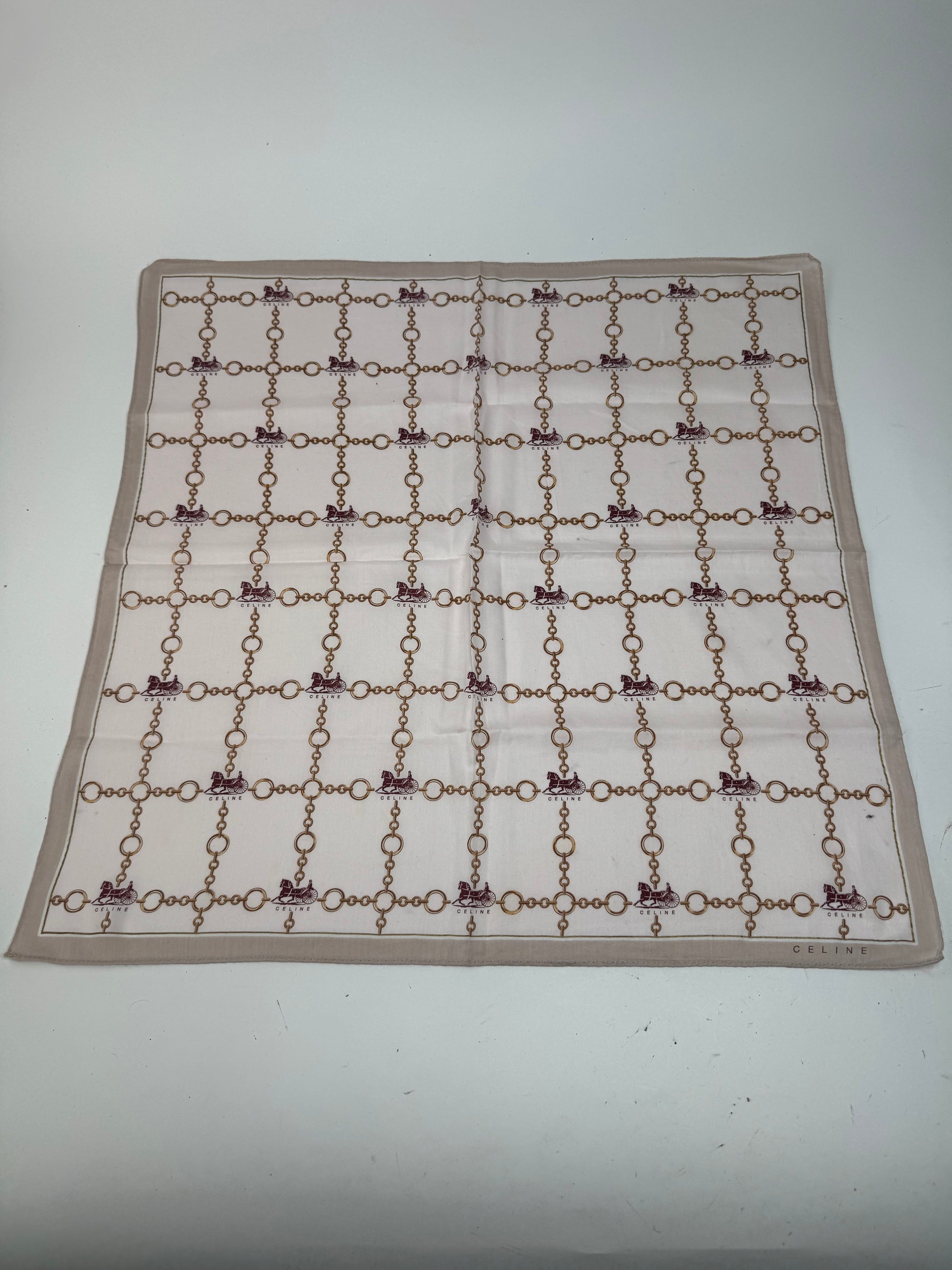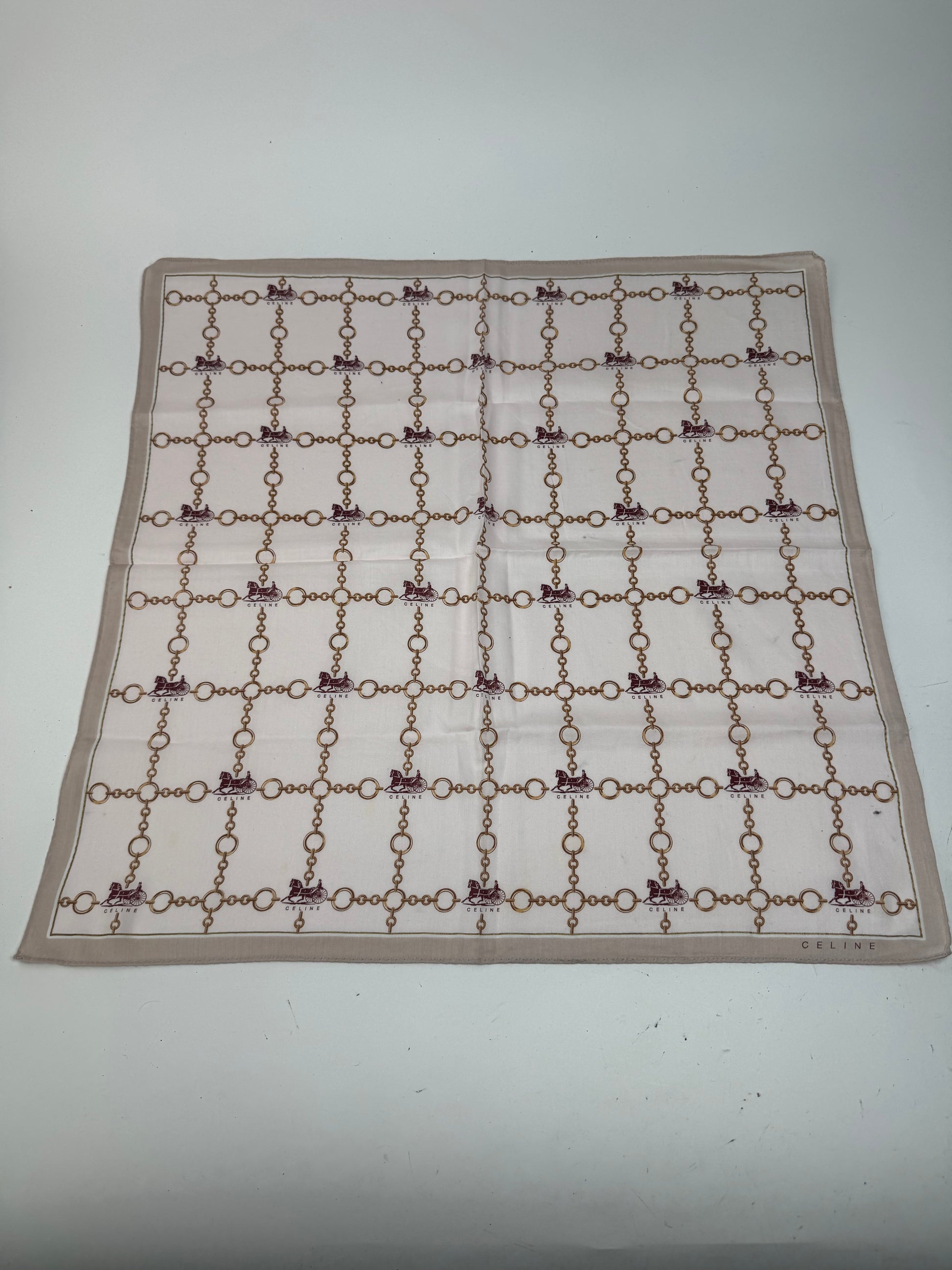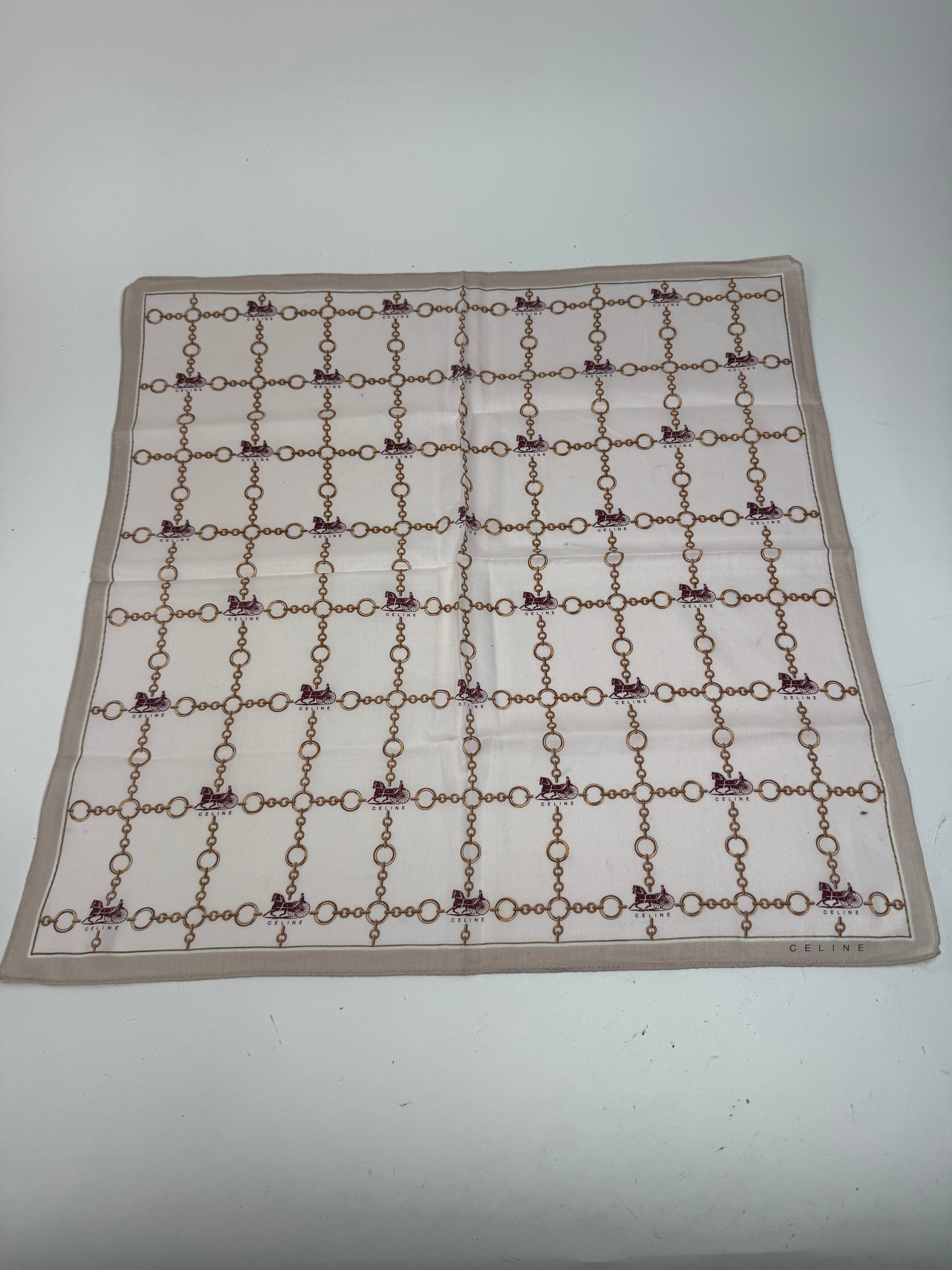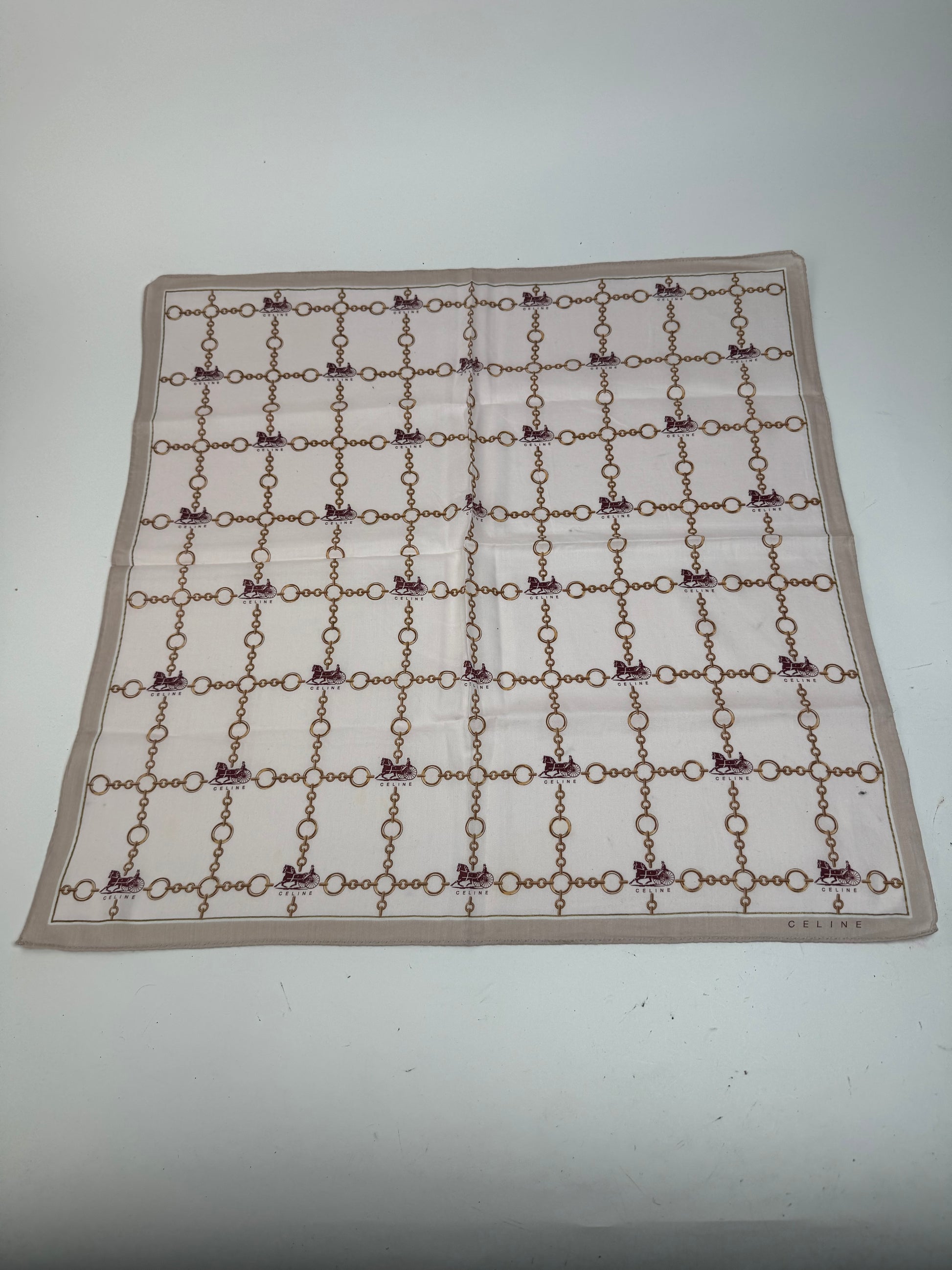 CELINE PARIS Chain & Carriage Print Scarf. This vintage scarf is crafted from a soft blend of silk and cotton with a cream-colored base and a taupe-brown border. The design features golden chain motifs and purple-brown carriage elements, reflecting the brand’s classic equestrian influences.