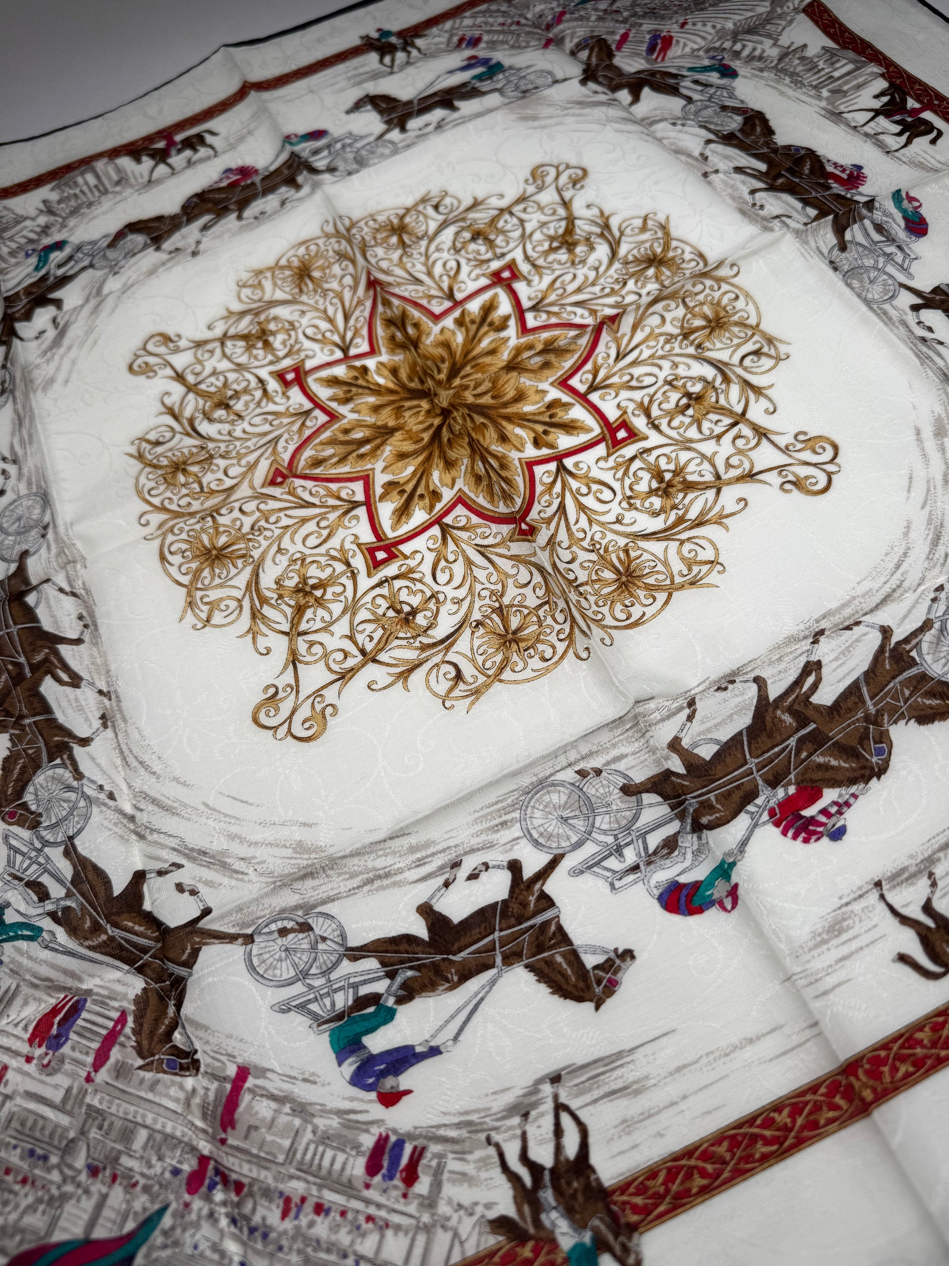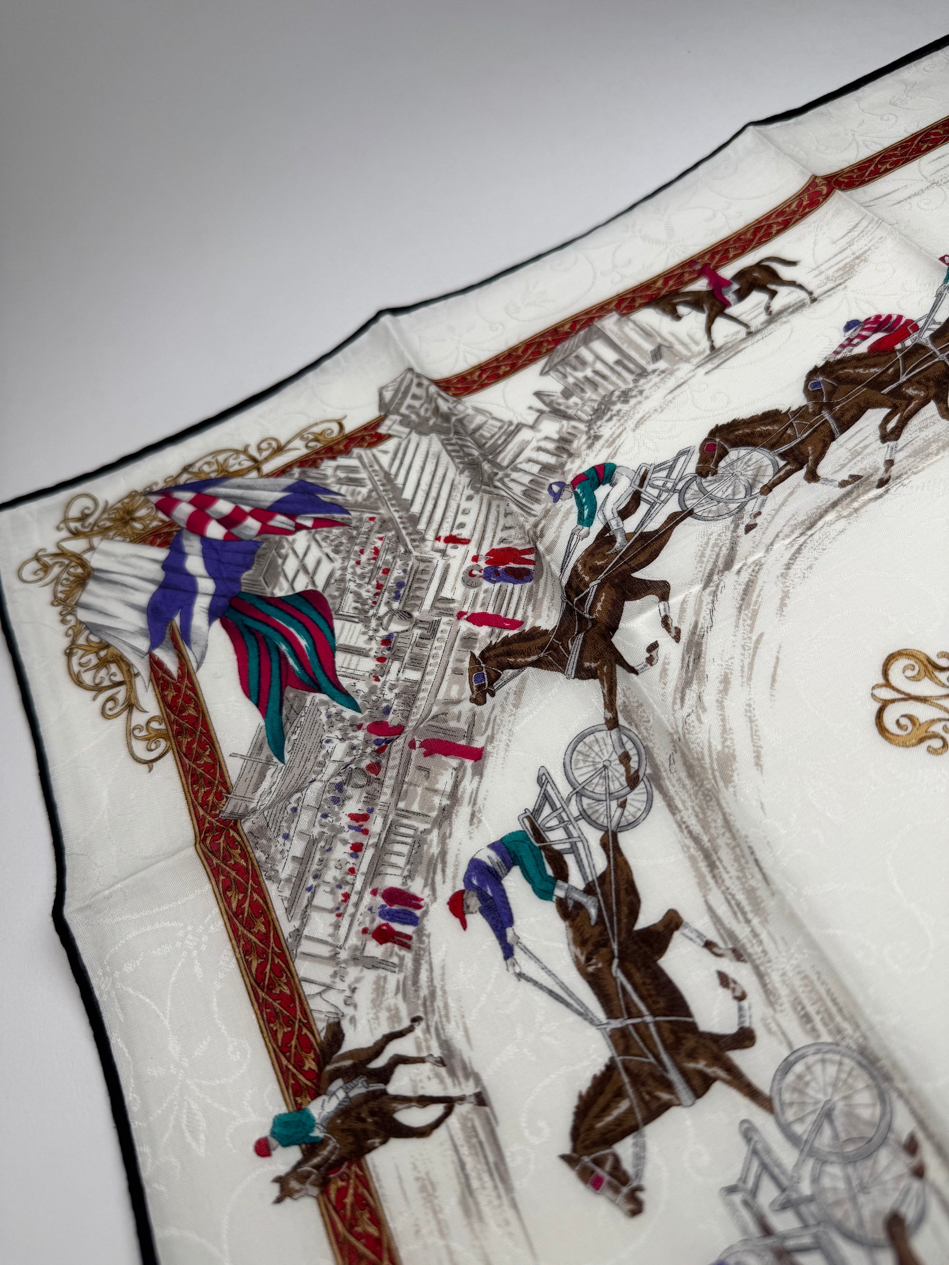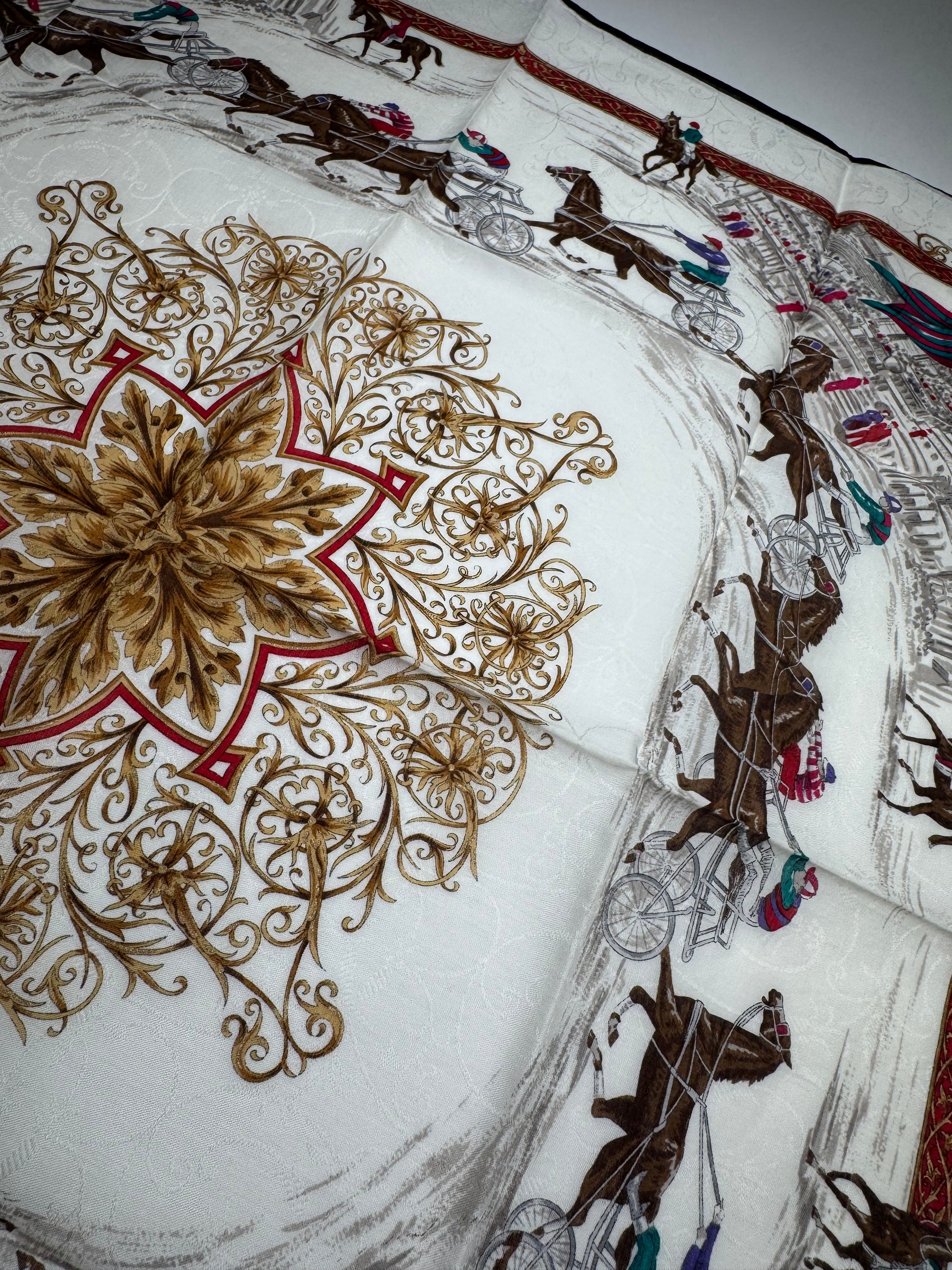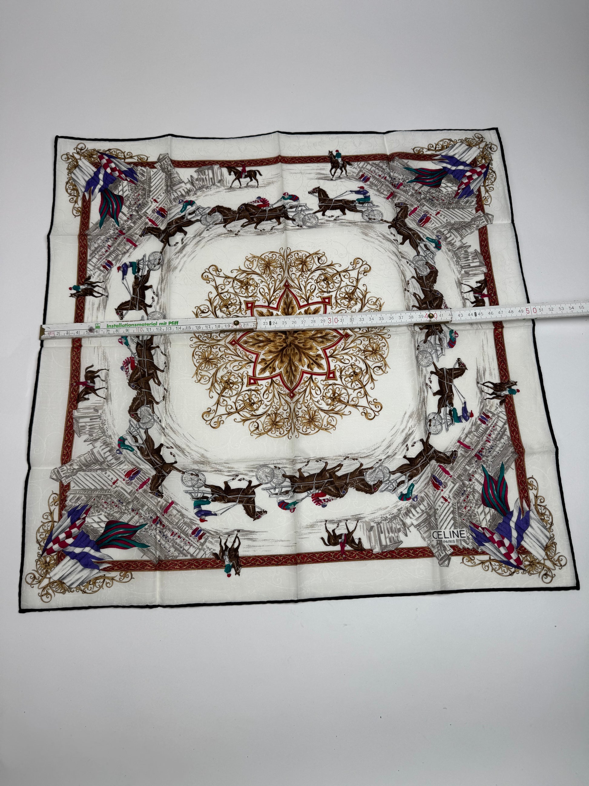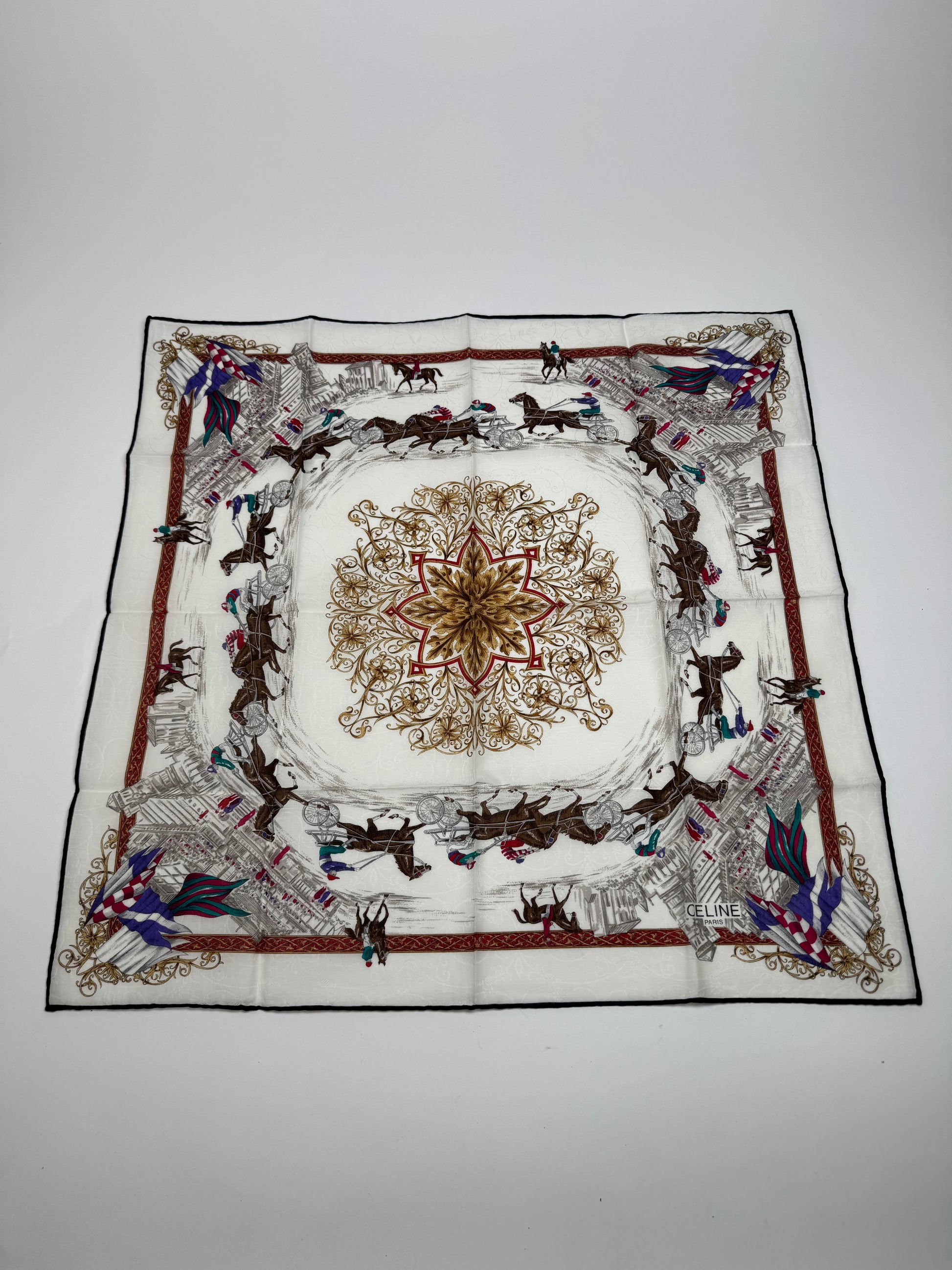 CELINE PARIS Vintage Scarf. This elegant vintage scarf from Celine Paris features a white base adorned with a detailed illustrated cityscape and multiple brown horses, creating a unique and artistic design. Crafted from a blend of silk and canvas, it offers a luxurious yet durable texture.