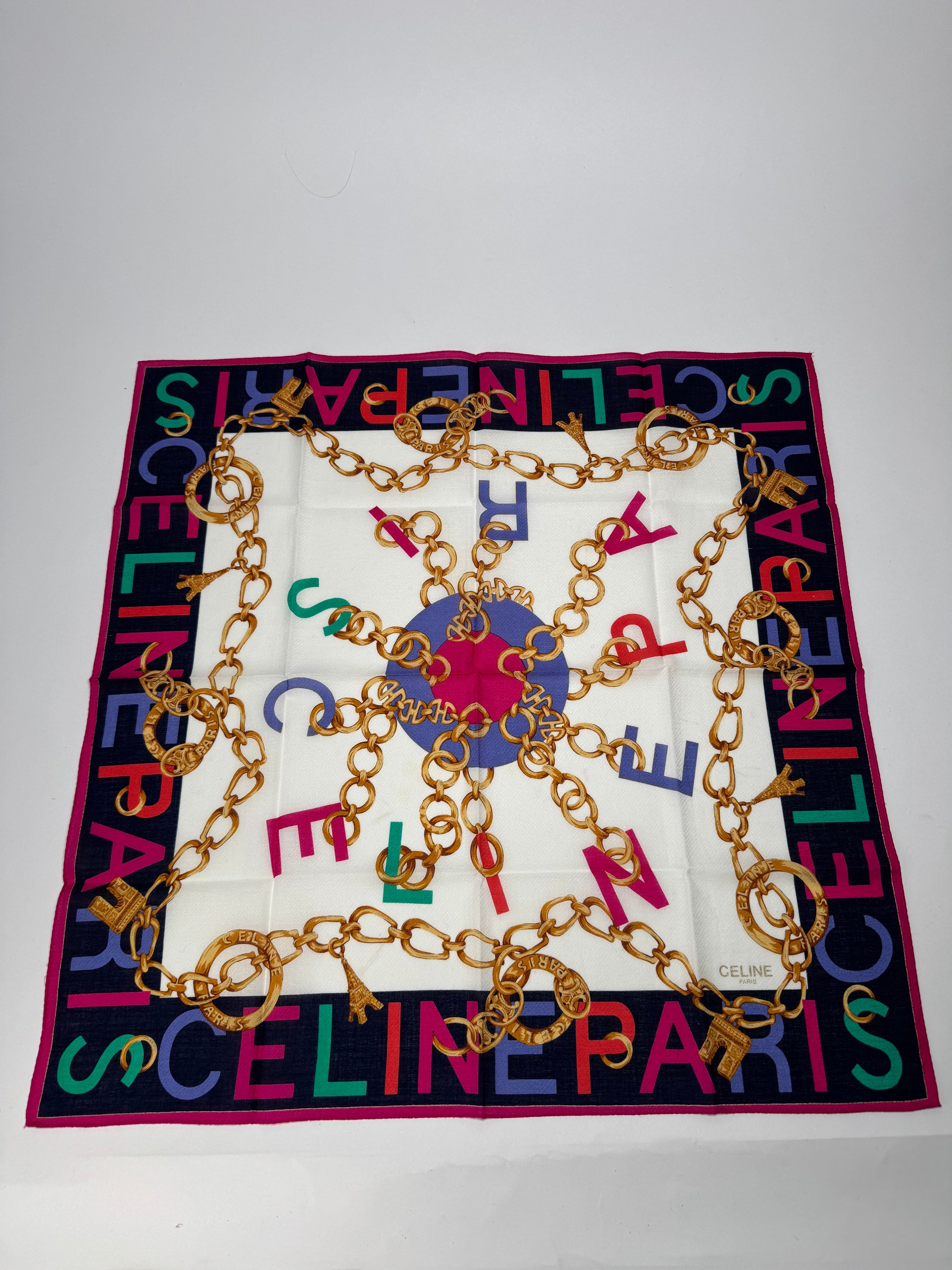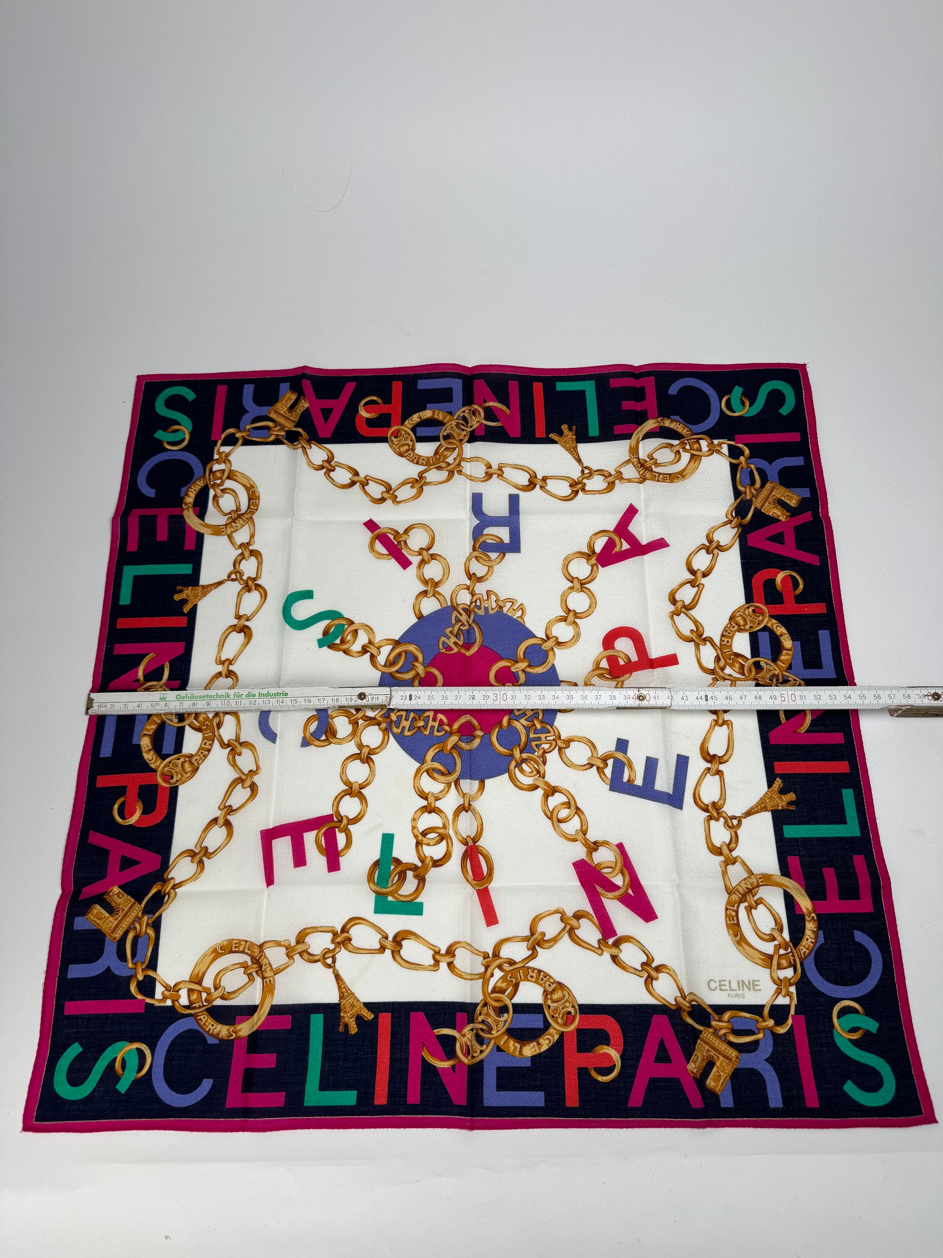 This vintage scarf is finely crafted from a luxurious blend of canvas and silk. The design features colorful Celine lettering, golden chain motifs, and a bold black border. A timeless unisex accessory.