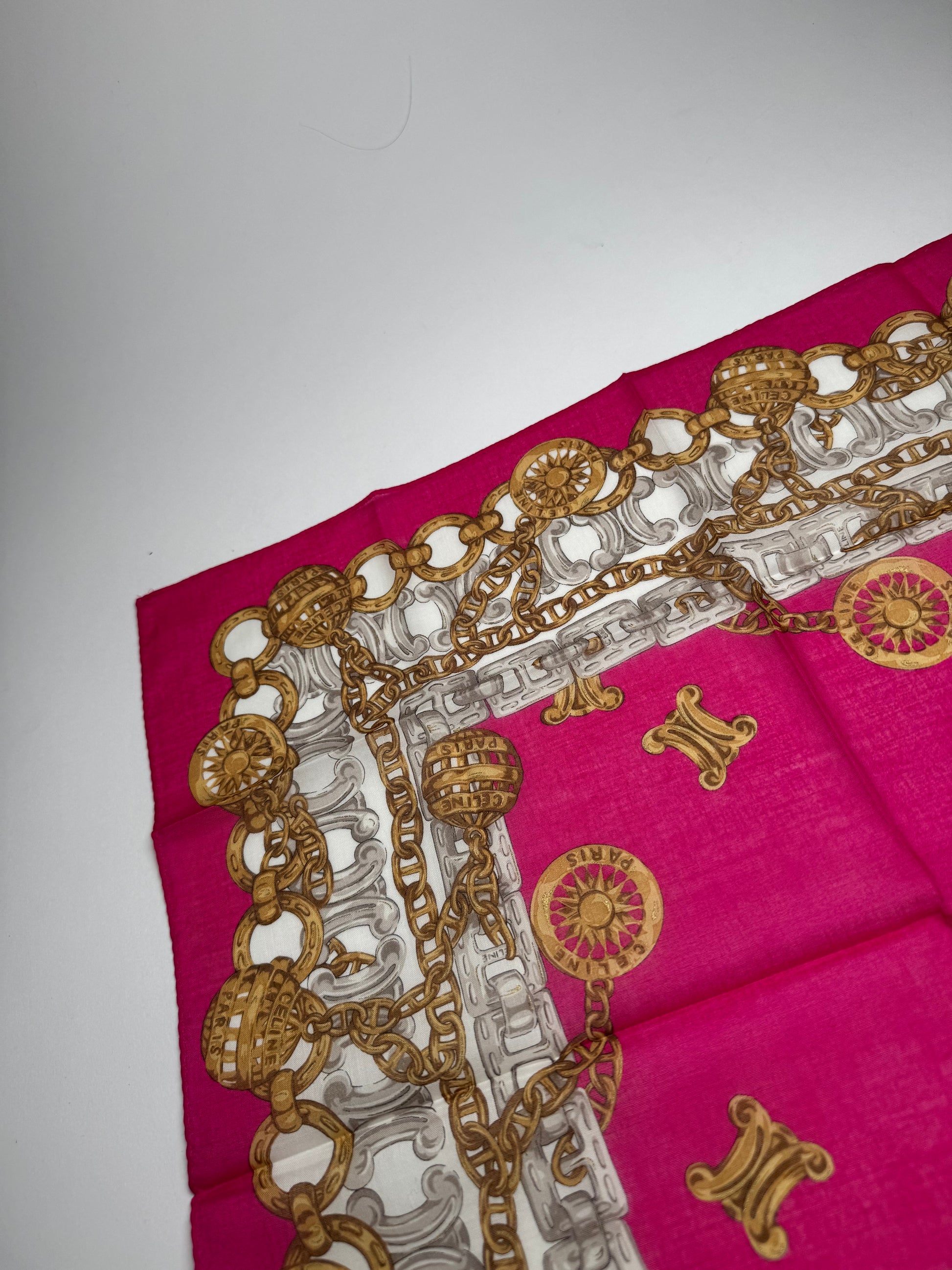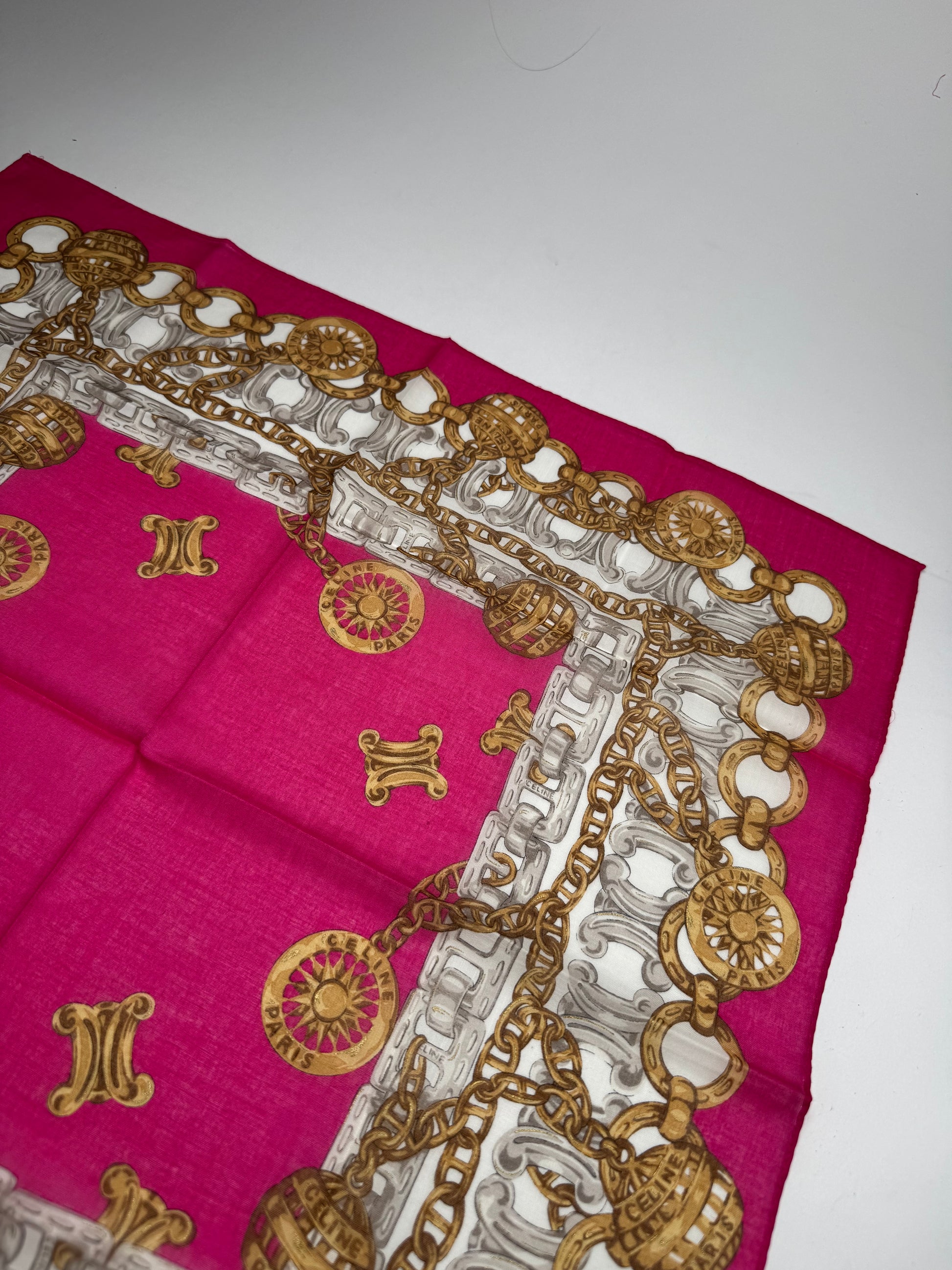 This vintage scarf is finely crafted from a luxurious blend of silk and canvas. The design features a rich purple-red base adorned with golden baroque-style chains, Celine symbols, and intricate gray and white elements, creating a sophisticated and timeless look.