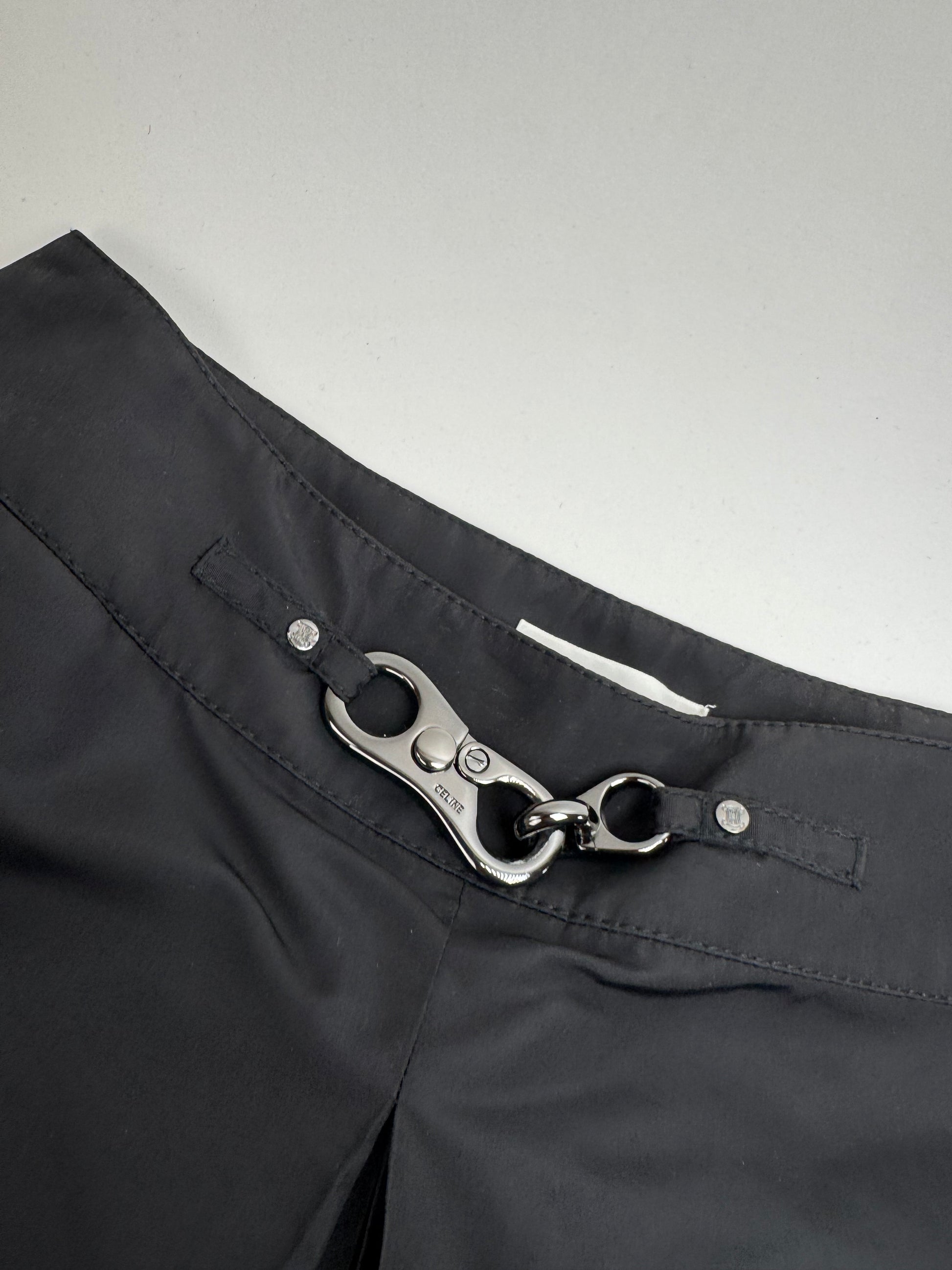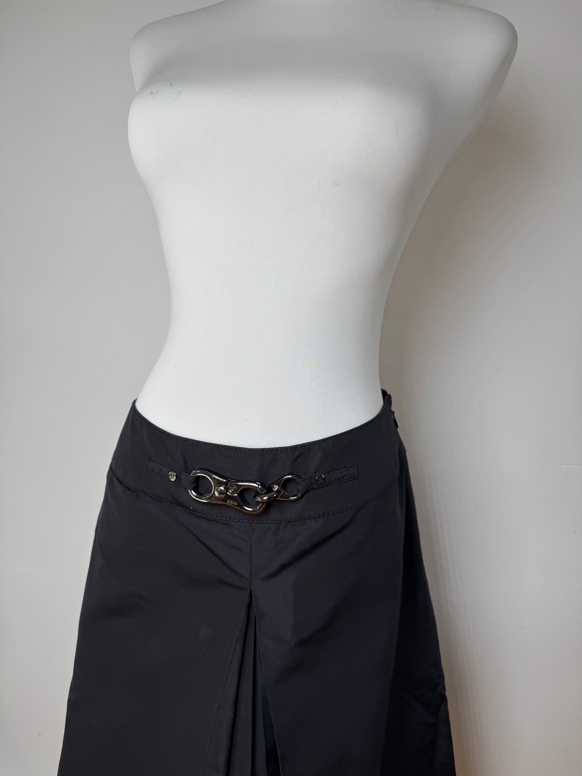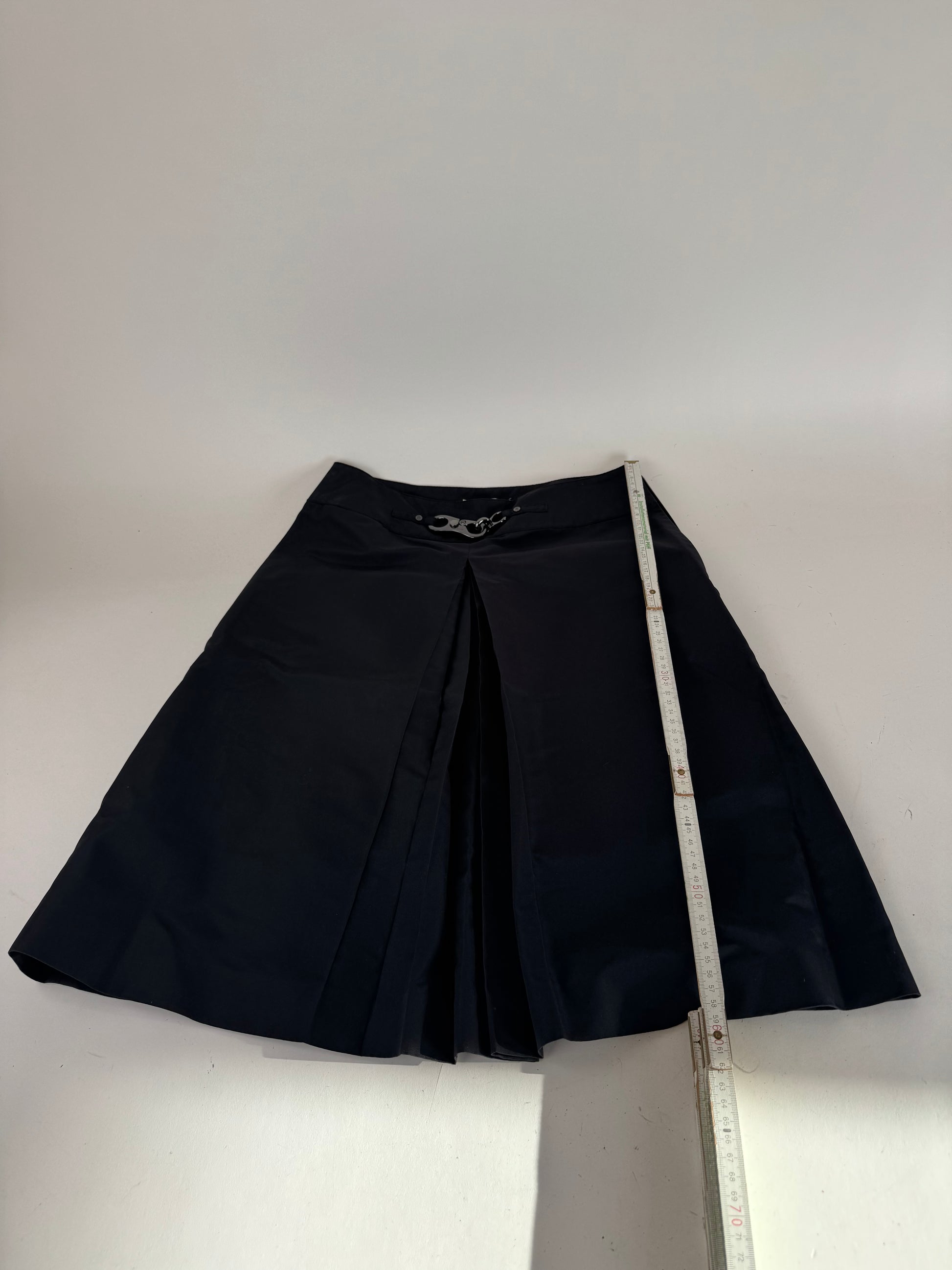 This elegant vintage skirt is finely crafted of 100% black silk. The skirt features an integrated silver and steel hardware detail in the form of a carabiner, adding a refined modern touch to the classic silhouette. The mannequin on the photo is wearing size 38 / M.