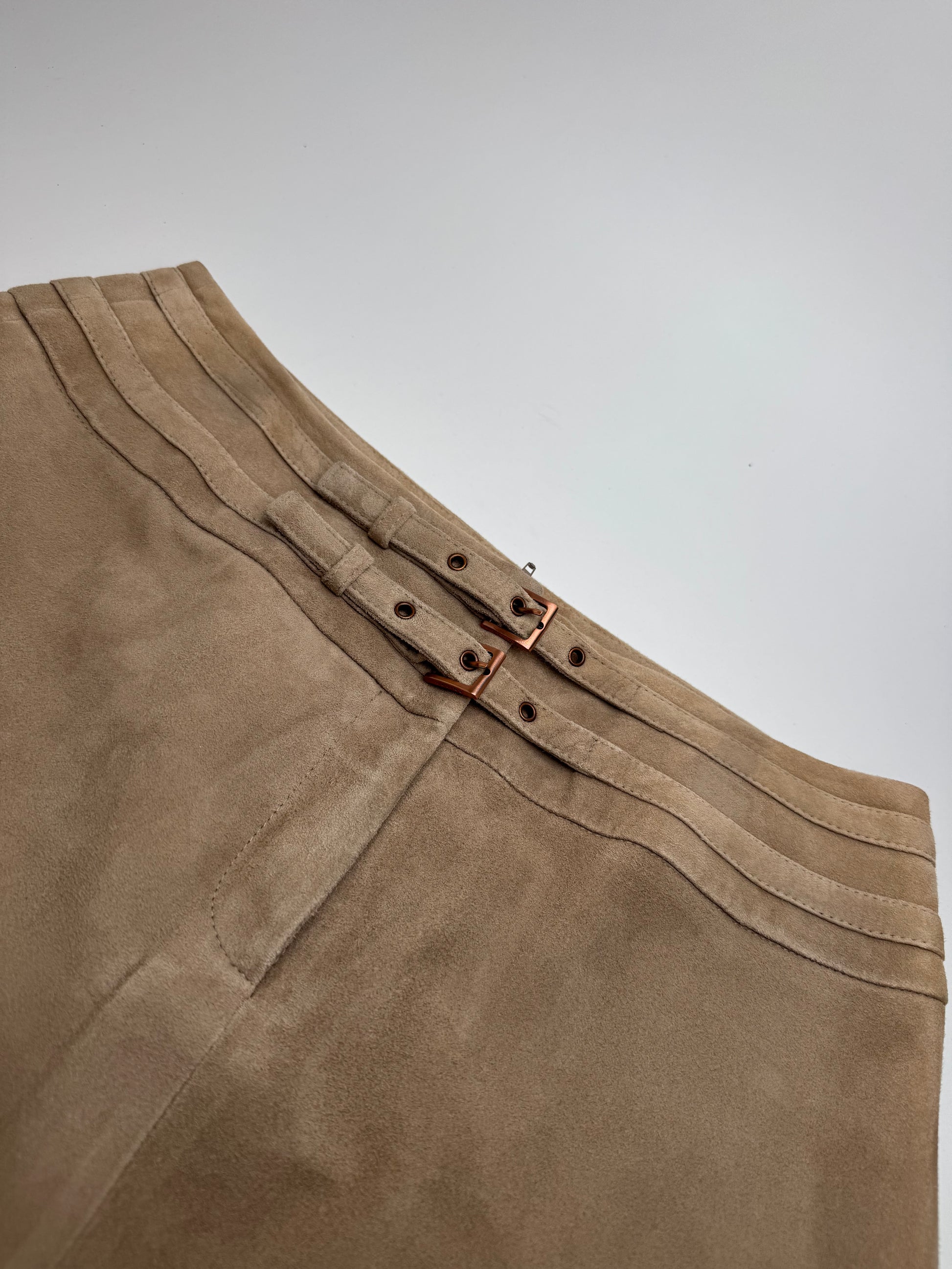 CÉLINE PARIS Vintage Suede Skirt. This sophisticated vintage skirt is crafted from soft light brown suede leather. It features brown-toned steel hardware and a flattering high-waist cut. The interior is lined with viscose for comfort. Made in France.