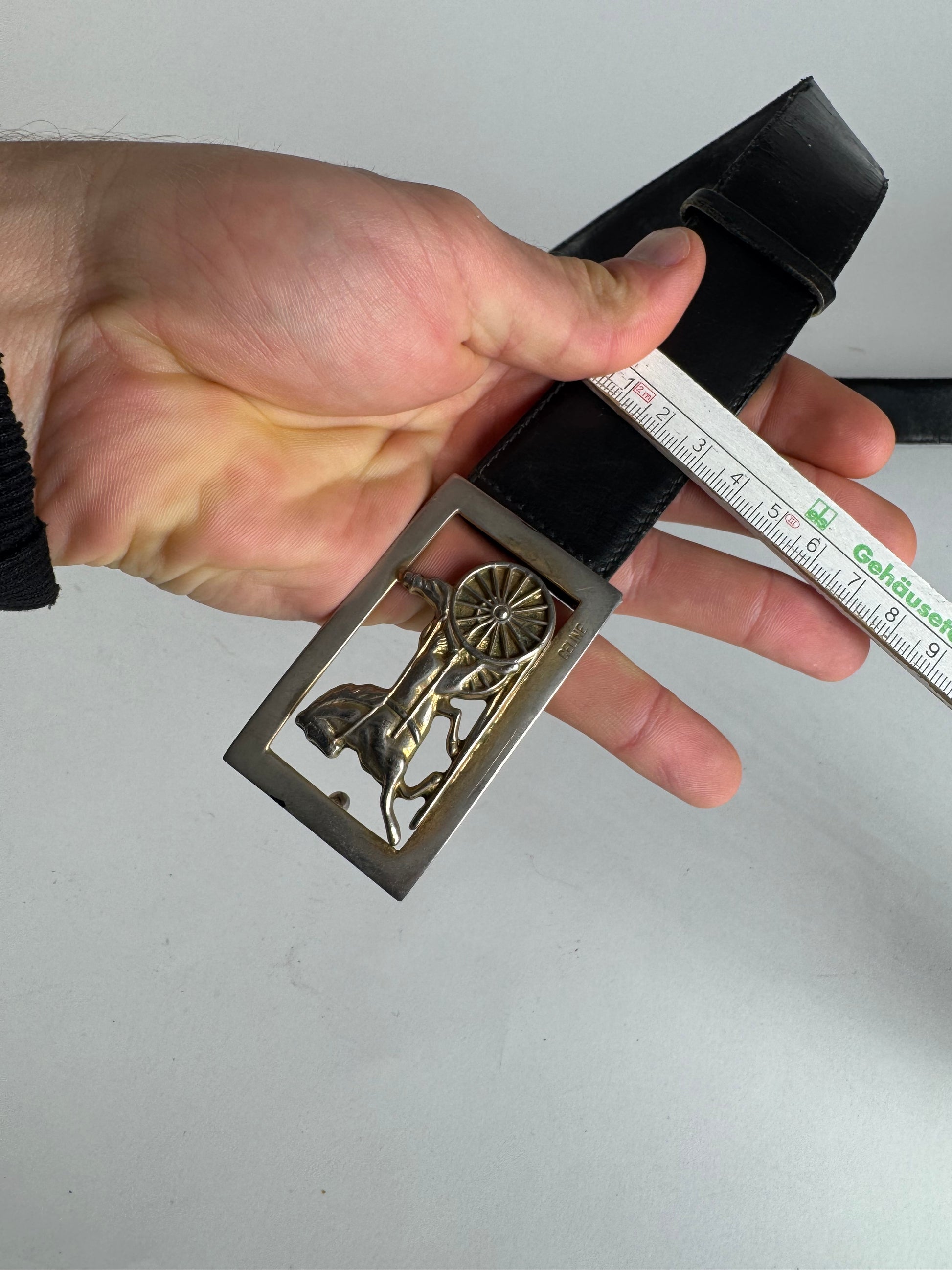 Condition Details: The leather shows signs of wear, including scratches and scuffs. The belt has been professionally repaired by a cobbler. The buckle remains bright with minor signs of use.