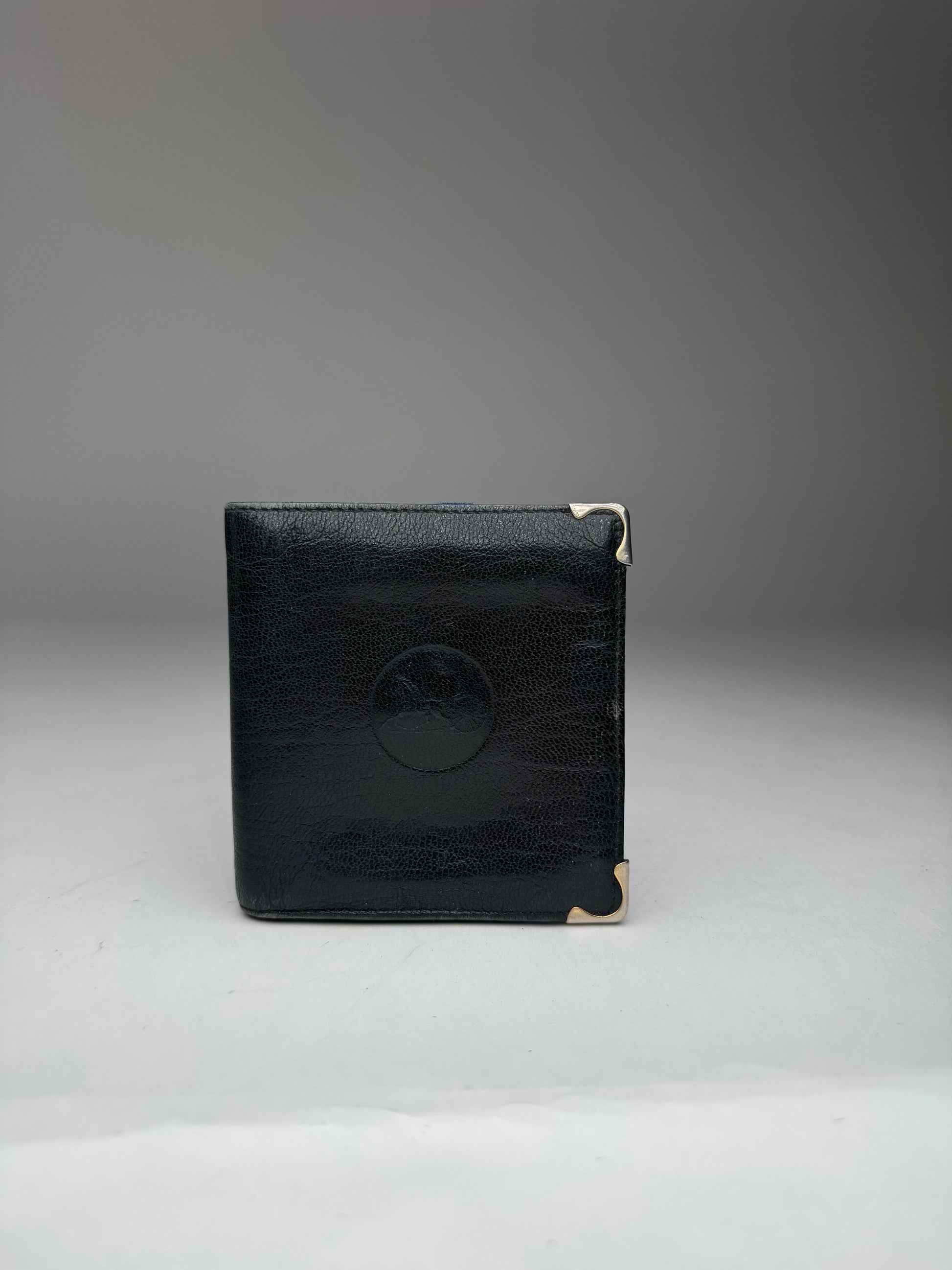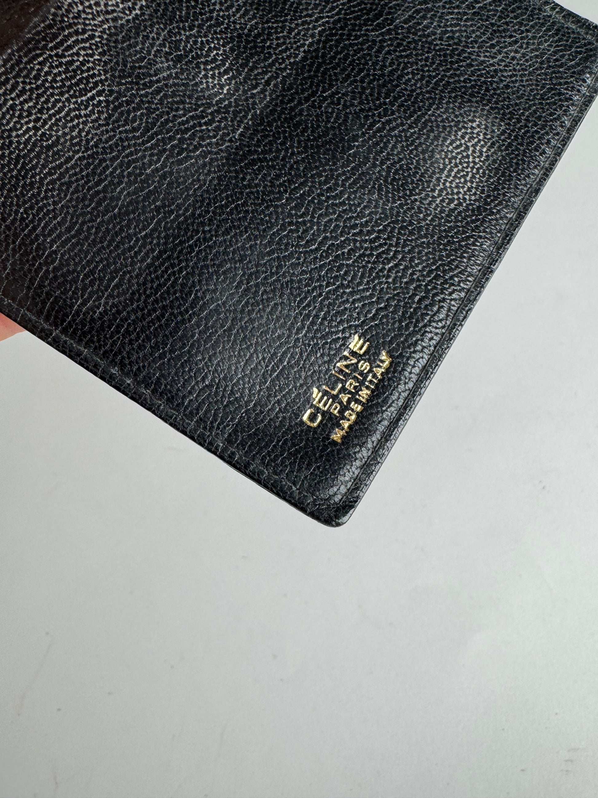 This vintage Celine Paris Triomphe wallet is crafted from sleek black leather, featuring the iconic embossed carriage logo on the front. The timeless flap design offers both style and functionality. The wallet is accented with silver-toned steel hardware, making it a refined unisex accessory.