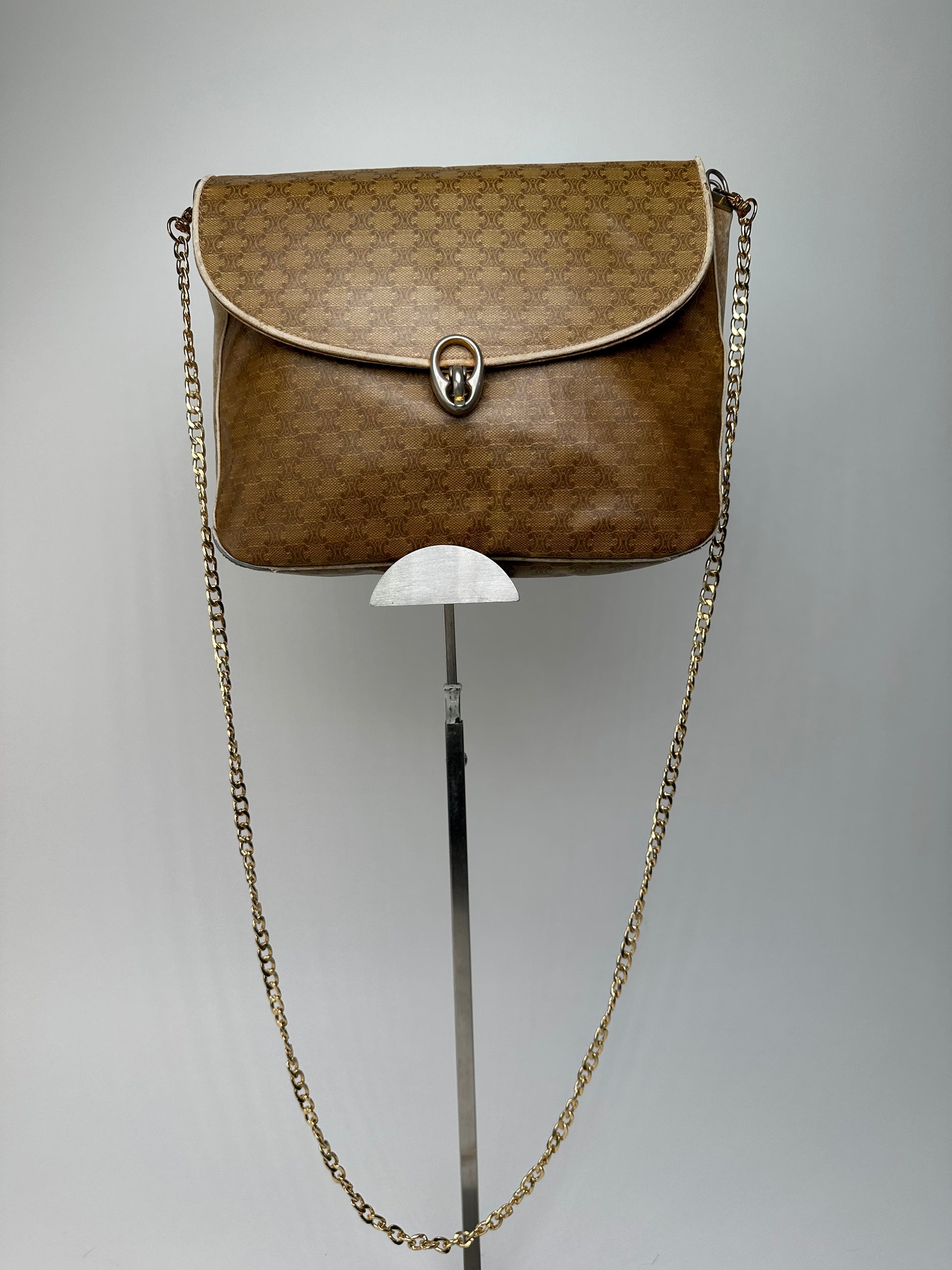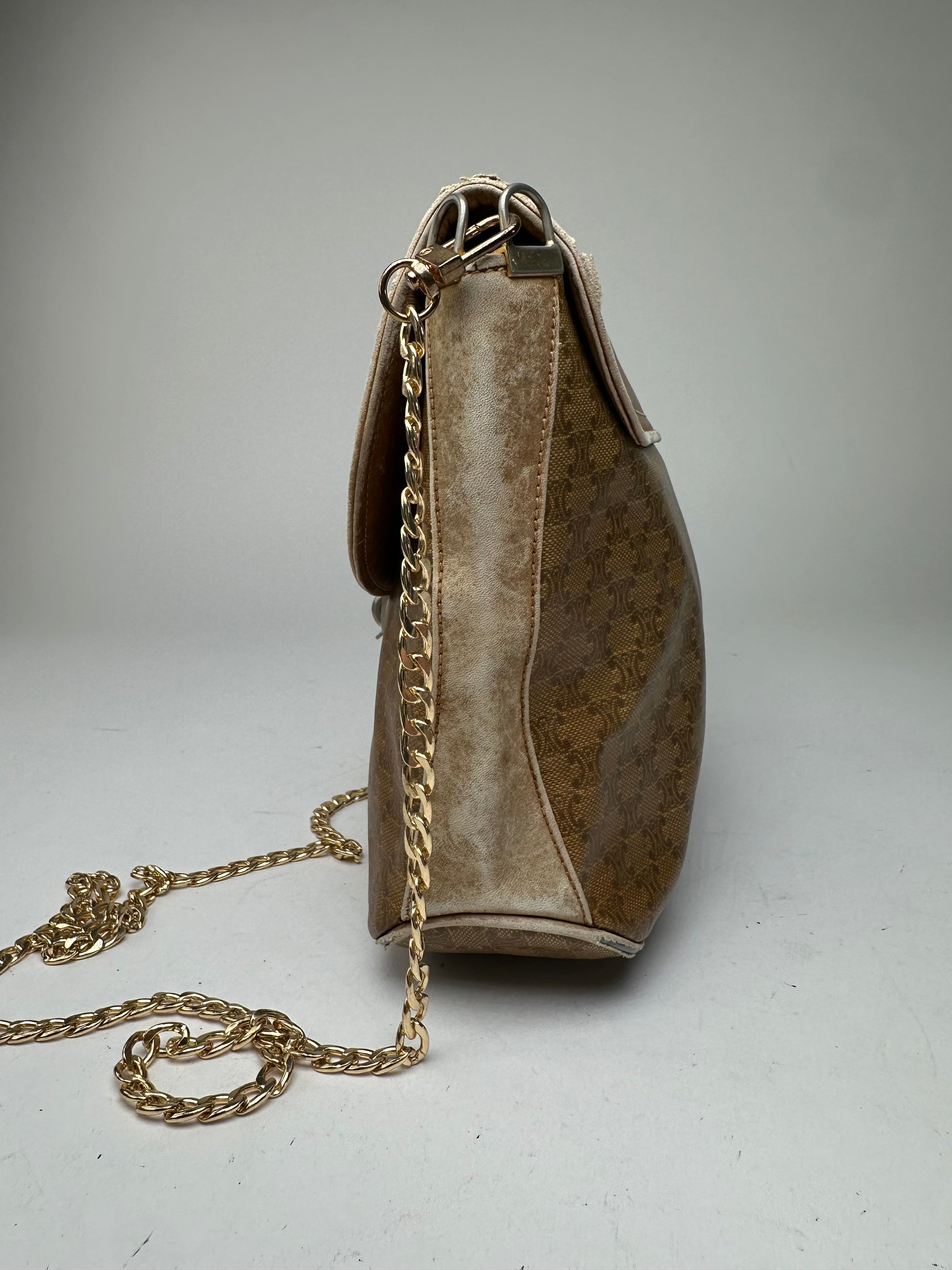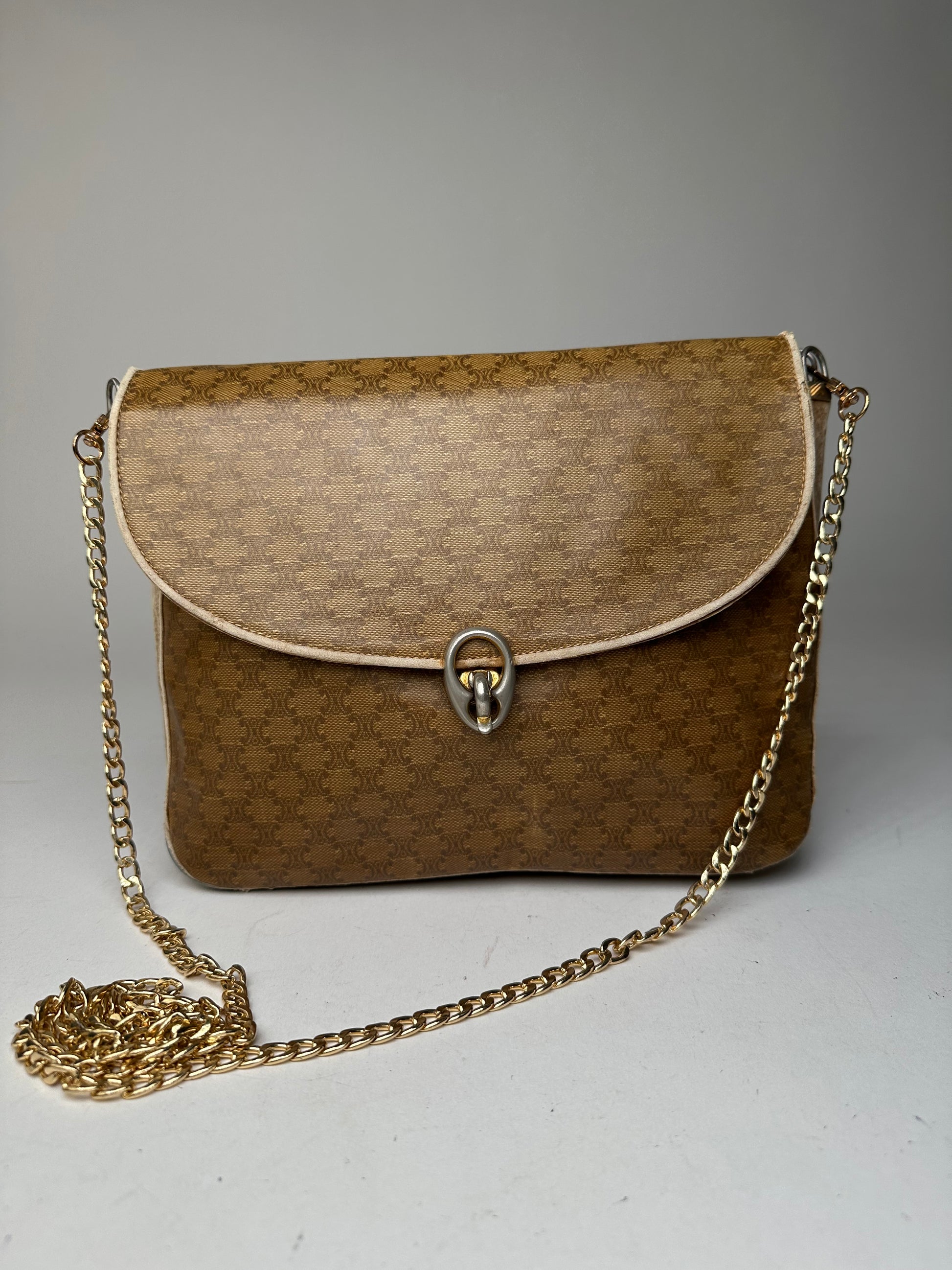 Vintage Celine Paris Triomphe Monogram Chain Leather Bag Brown