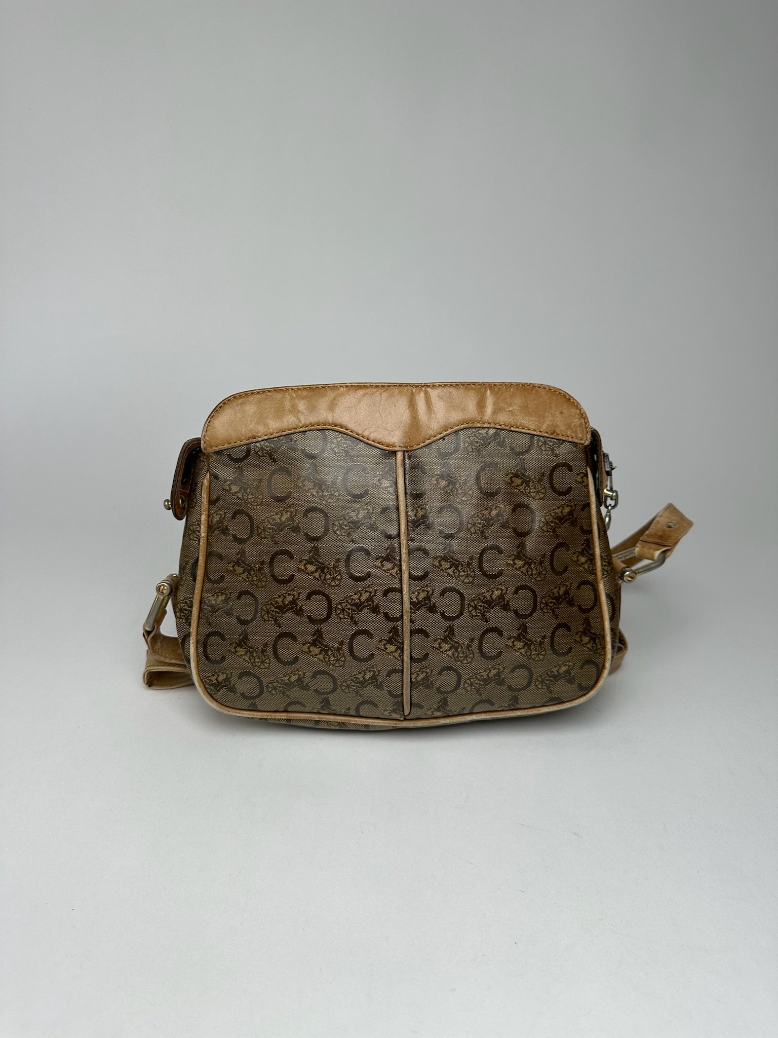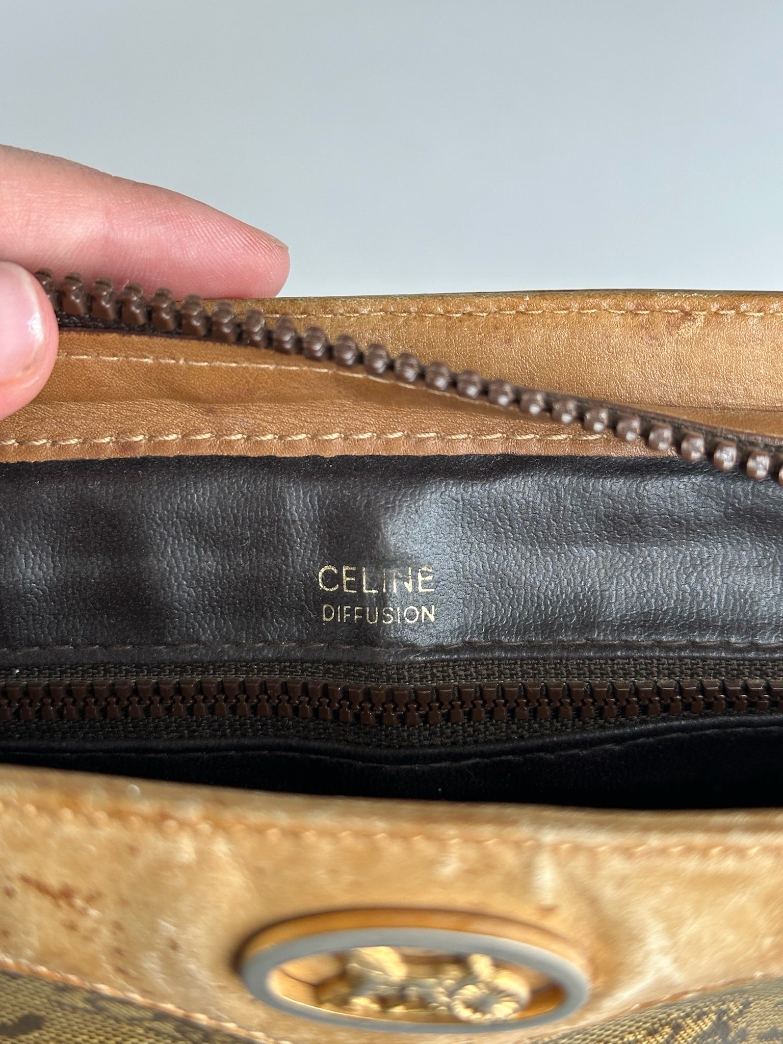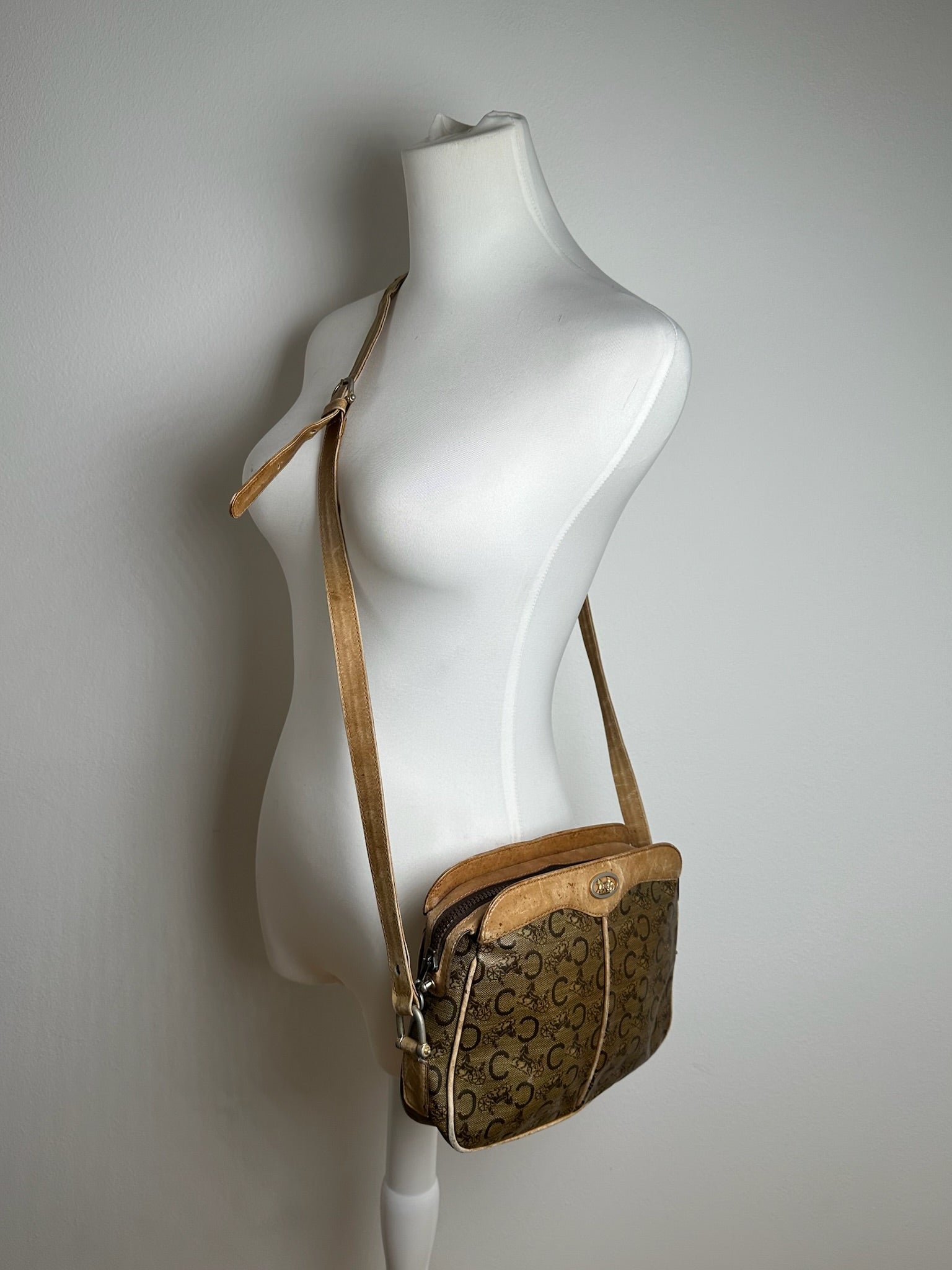 CELINE PARIS Vintage Shoulder Bag. This chic unisex bag is finely crafted of gold-brown leather in the classic Macadam monogram and features gold-tone steel hardware. It comes with an adjustable shoulder strap for versatile wear.