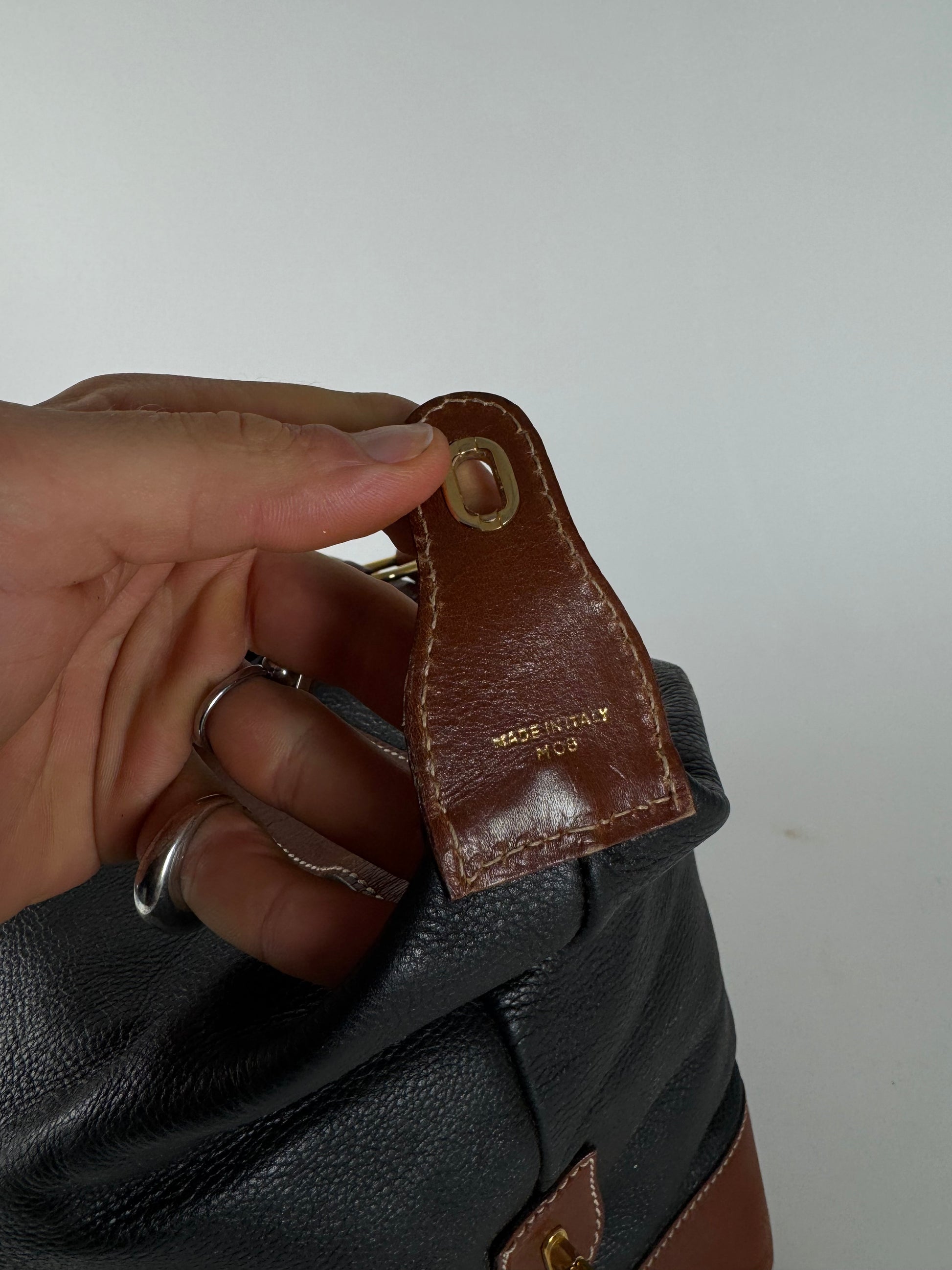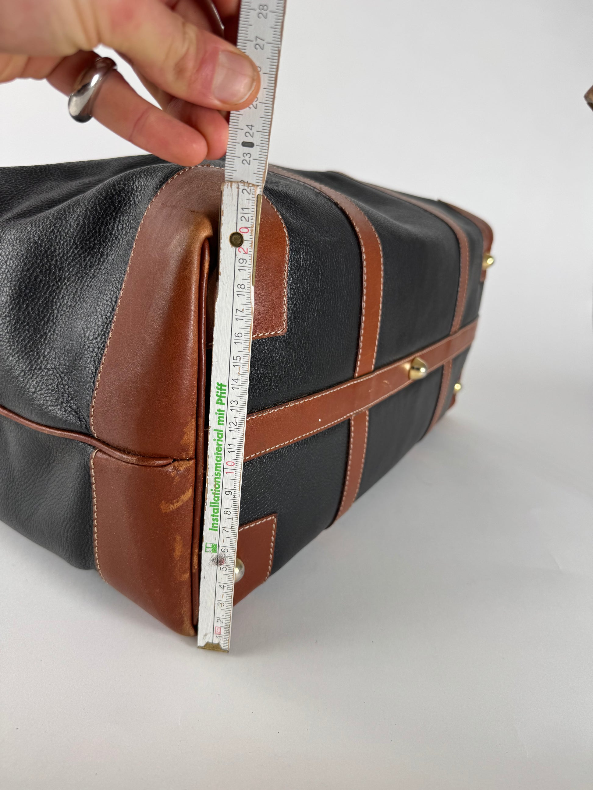 CELINE PARIS Vintage Triomphe Duffle Bag. This vintage Celine Triomphe duffle bag is crafted from black and brown leather, combining elegance with functionality. The gold-tone steel hardware adds a luxurious touch. Despite minor scratches, the bag remains in very good condition. Made in Italy in 2008, this unisex travel bag is a timeless classic.