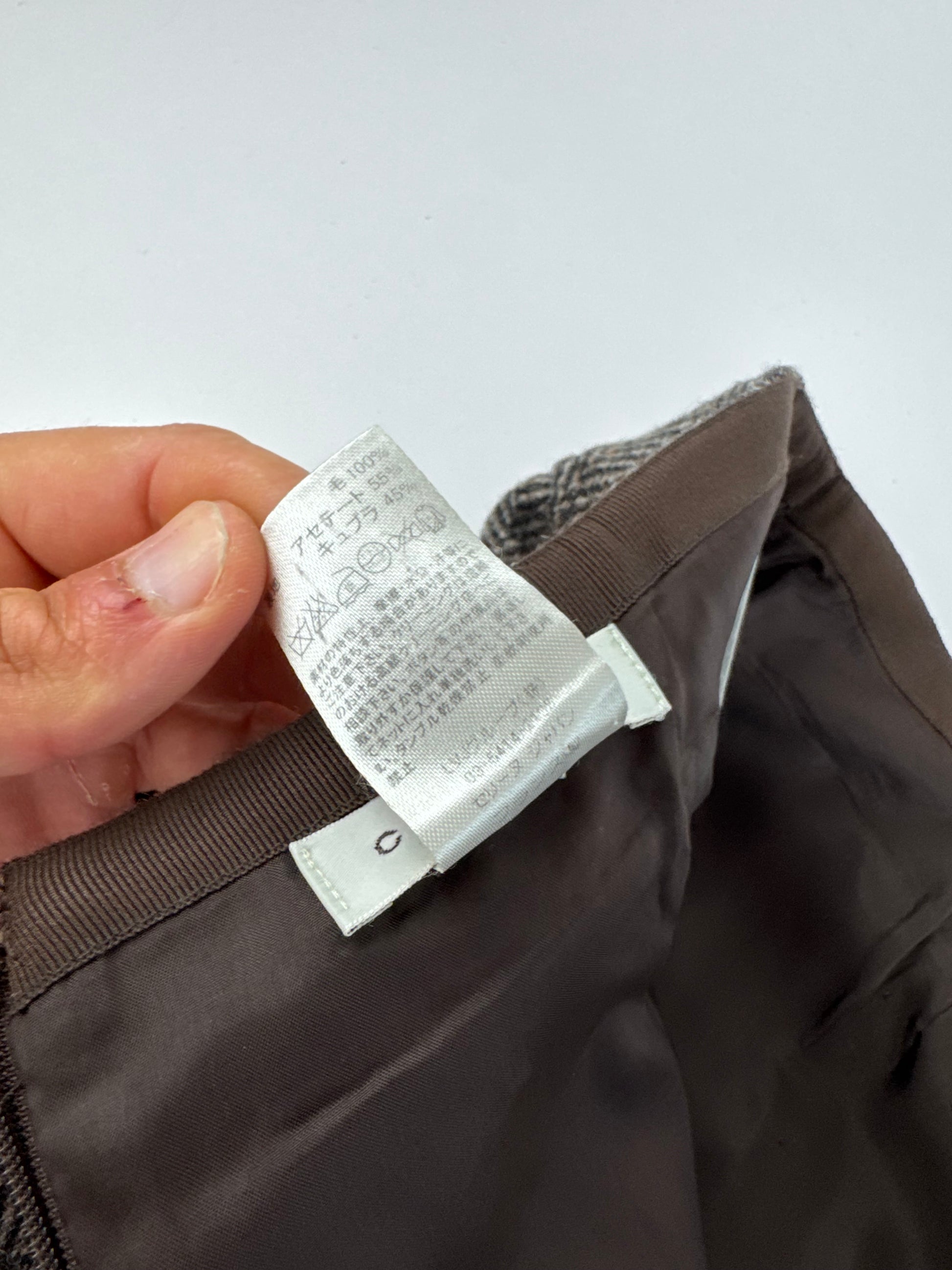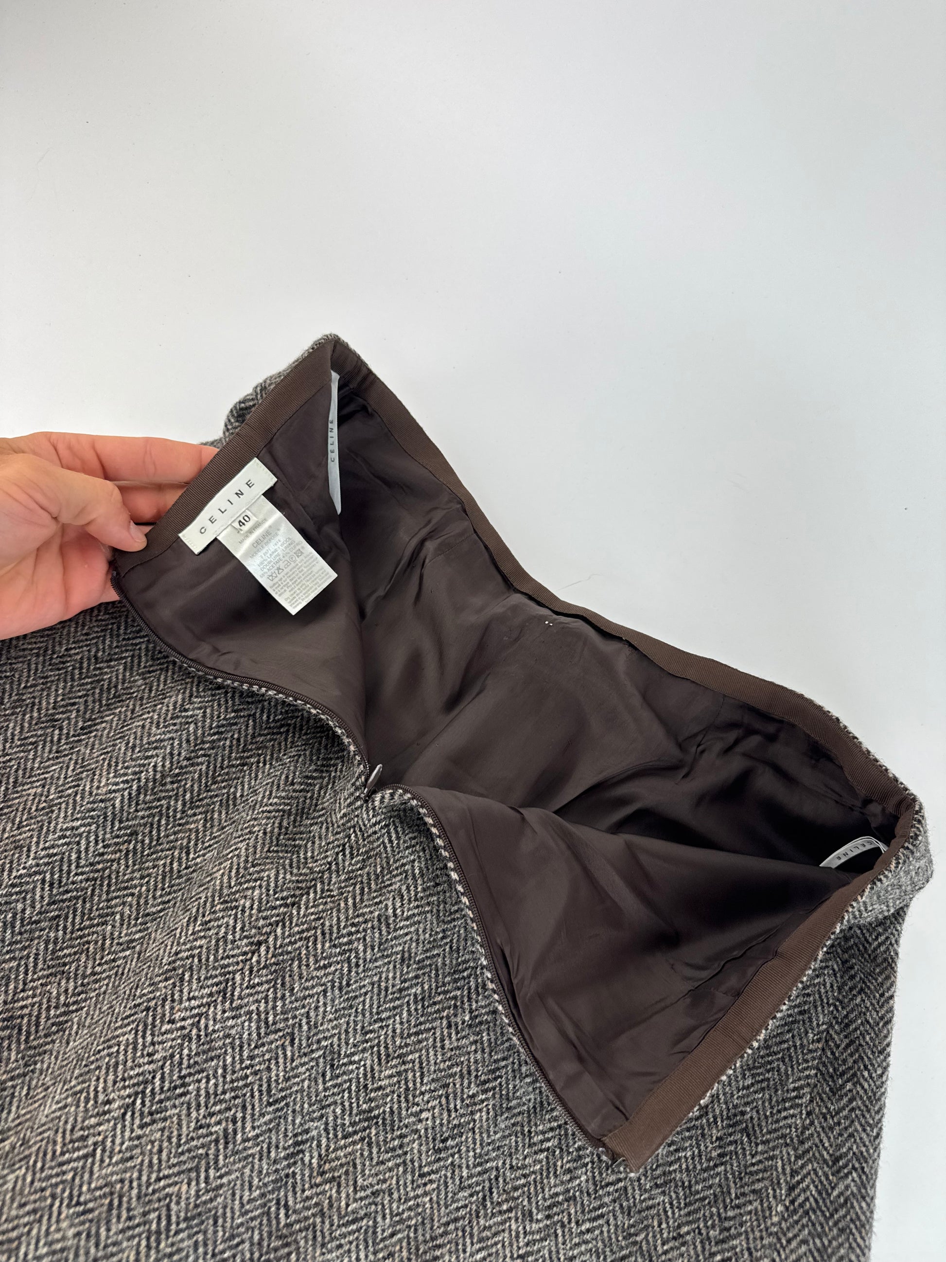 CÉLINE Vintage Wool Skirt. This elegant vintage skirt is crafted from patterned wool in a mix of white and brown tones. It features white-gold toned steel hardware and a classic silhouette. Likely from the 1990s, this timeless piece is fully lined with brown viscose for added comfort.