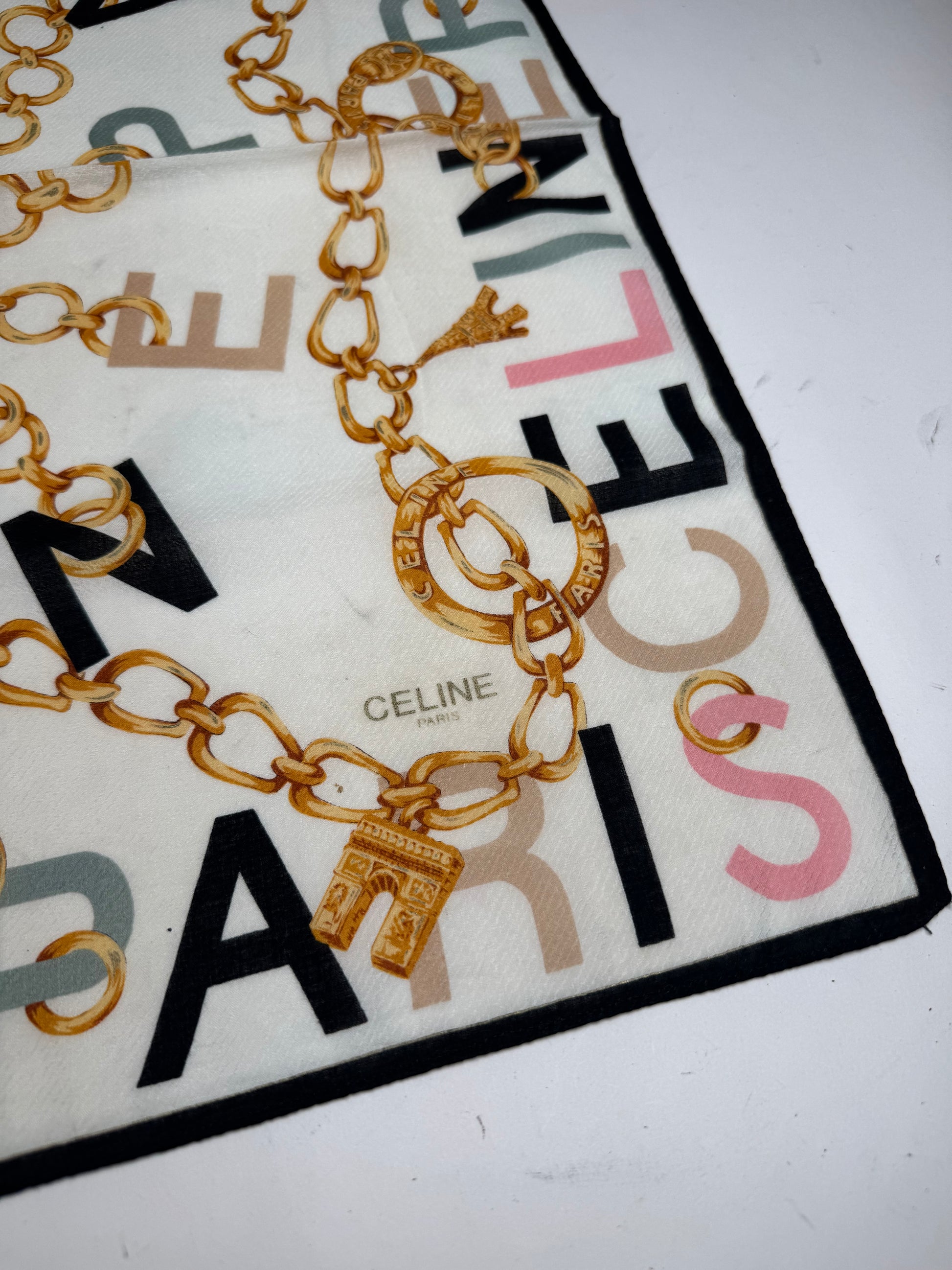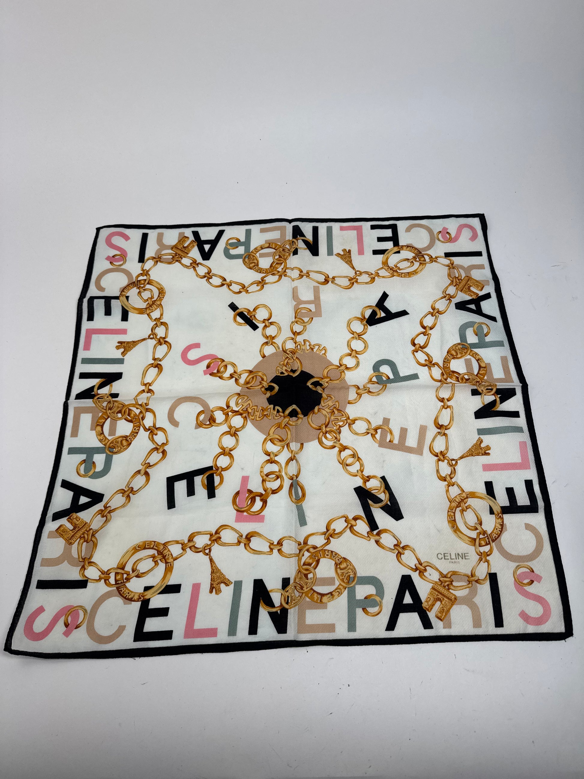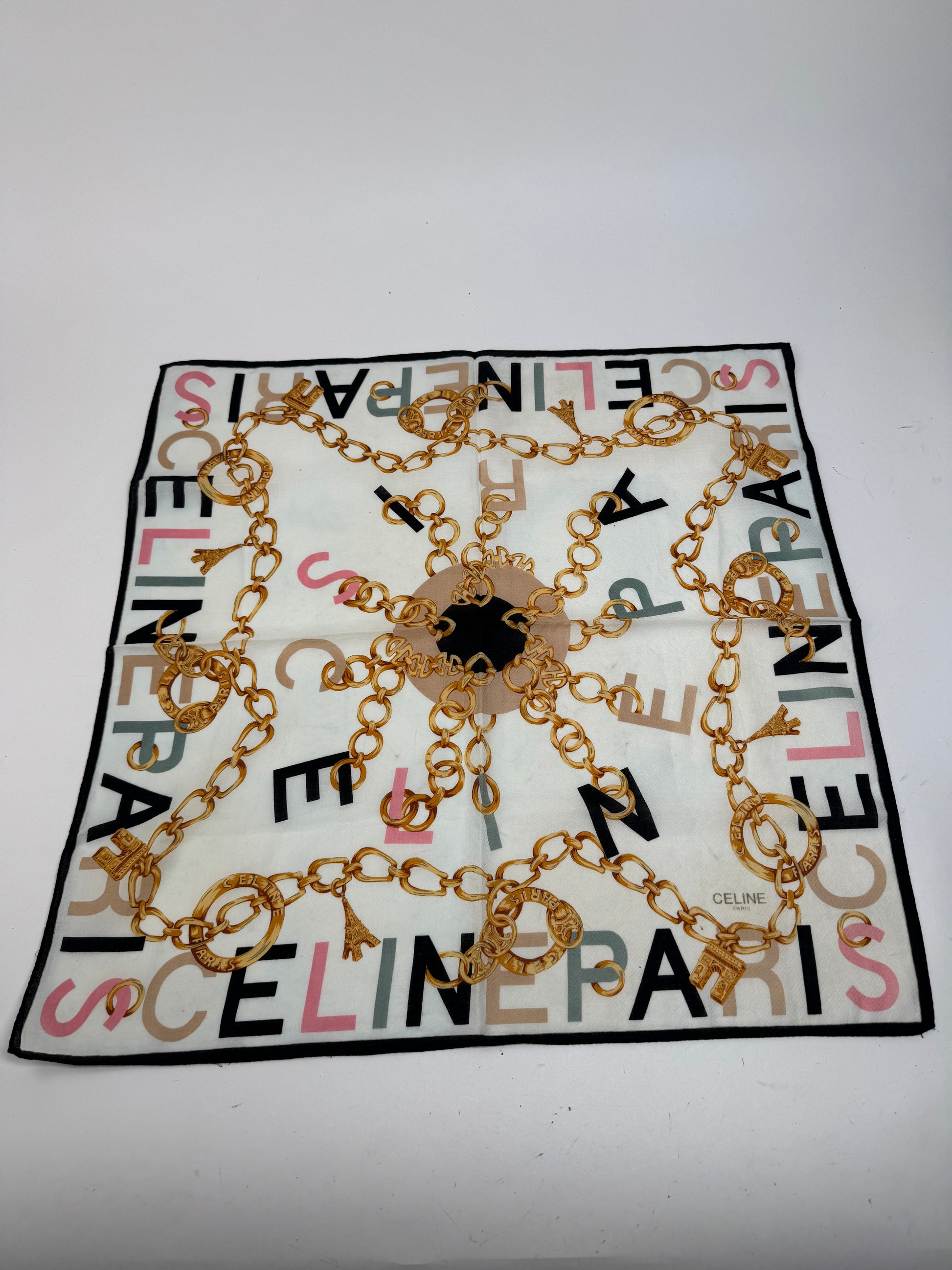 CELINE PARIS Vintage Scarf. This chic scarf is finely crafted of a soft silk and canvas blend fabric with a white base, featuring CELINE Paris logos in grey, black, pink, green, and brown, along with gold chains and the iconic CELINE ring logo in a baroque-style pattern.