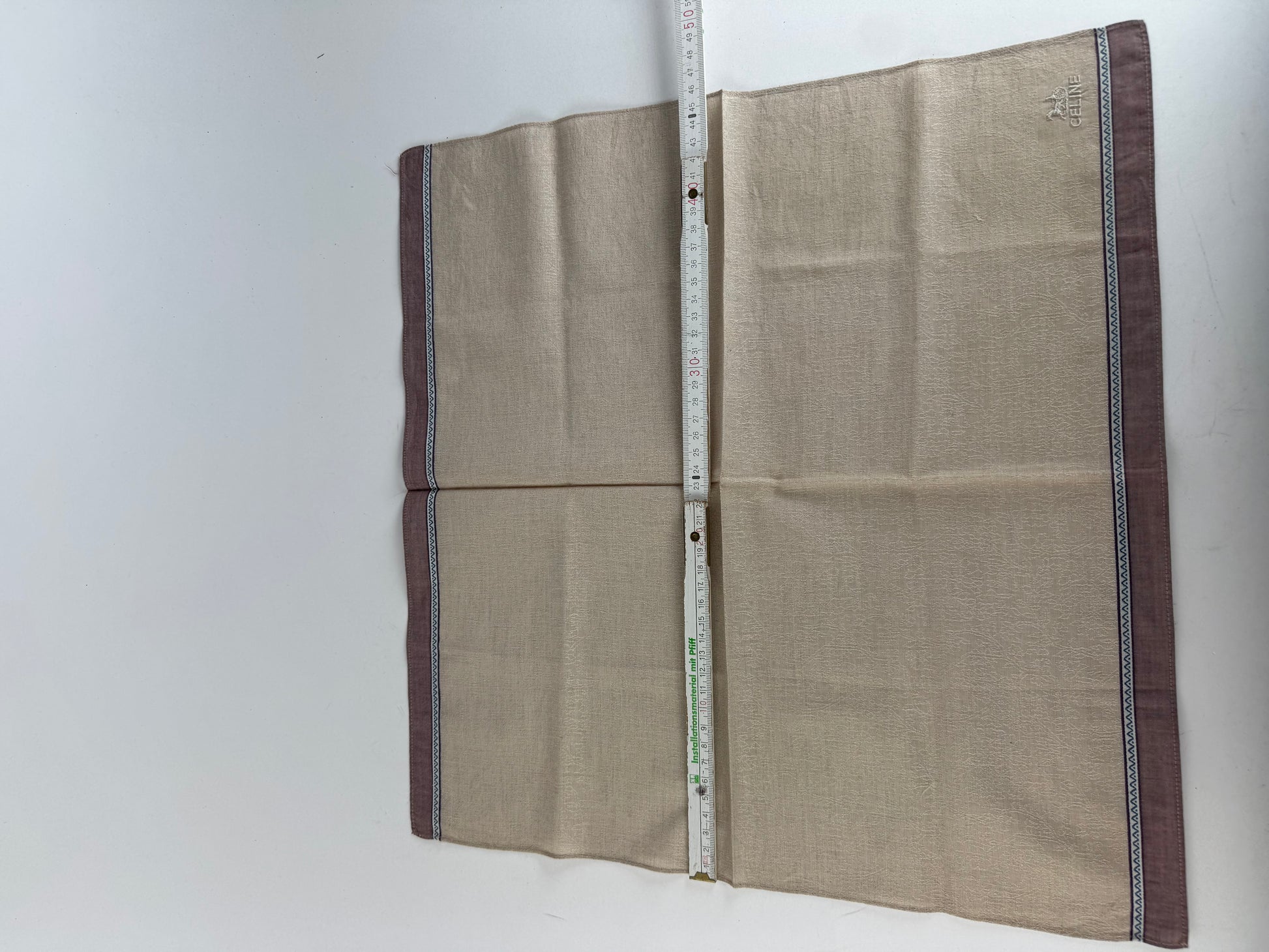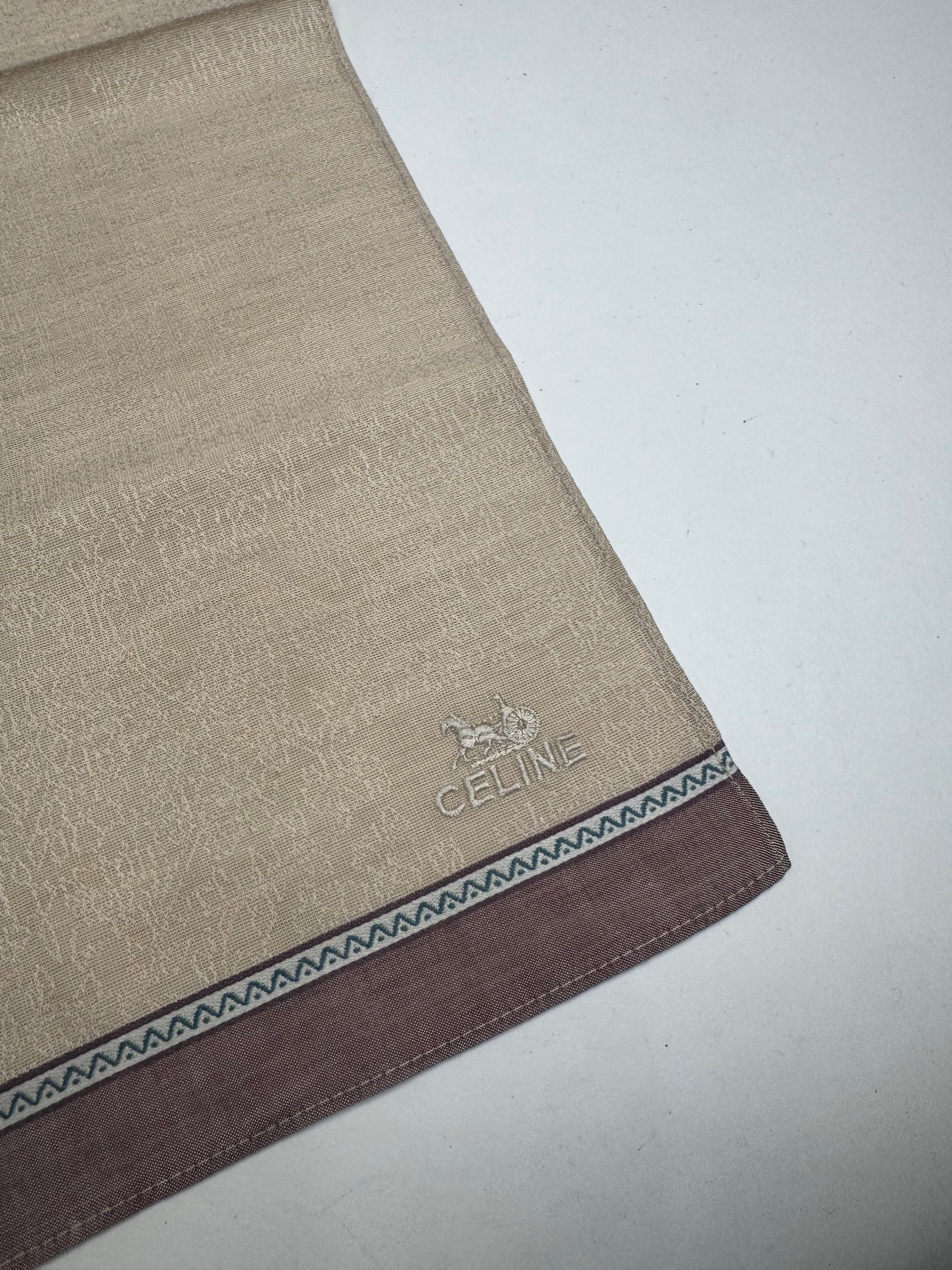 This vintage scarf is finely crafted of canvas and features a beige, sand-toned patterned base with contrasting dark brown borders at the top and bottom. A small CÉLINE coaching logo is subtly embroidered at the lower right corner. A refined and timeless accessory that reflects the brand’s elegant heritage.