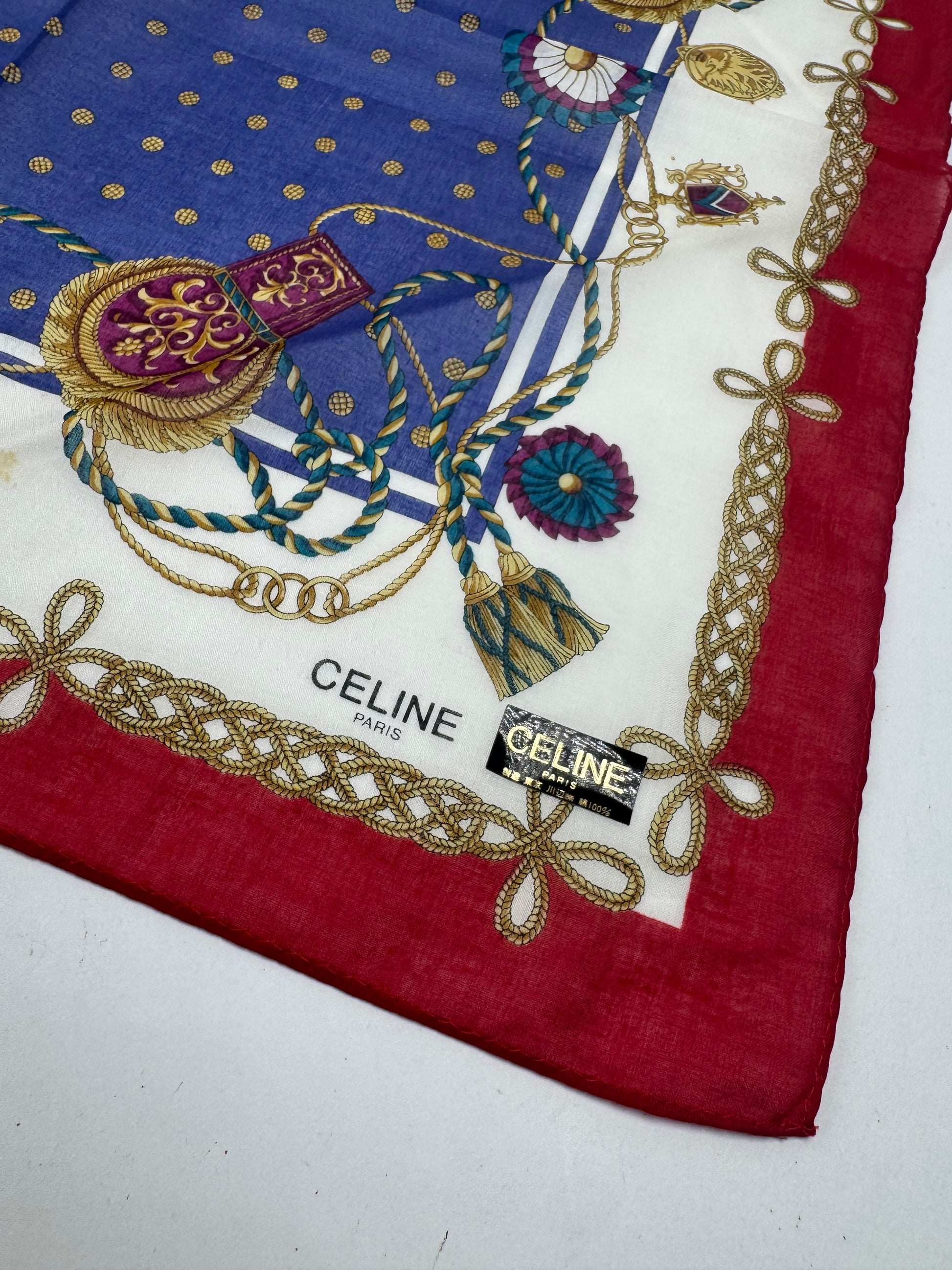 CELINE Vintage Scarf. This elegant scarf features a red border with baroque-inspired ribbon and jewelry motifs. At the center, a blue square with golden dots adds a refined contrast.