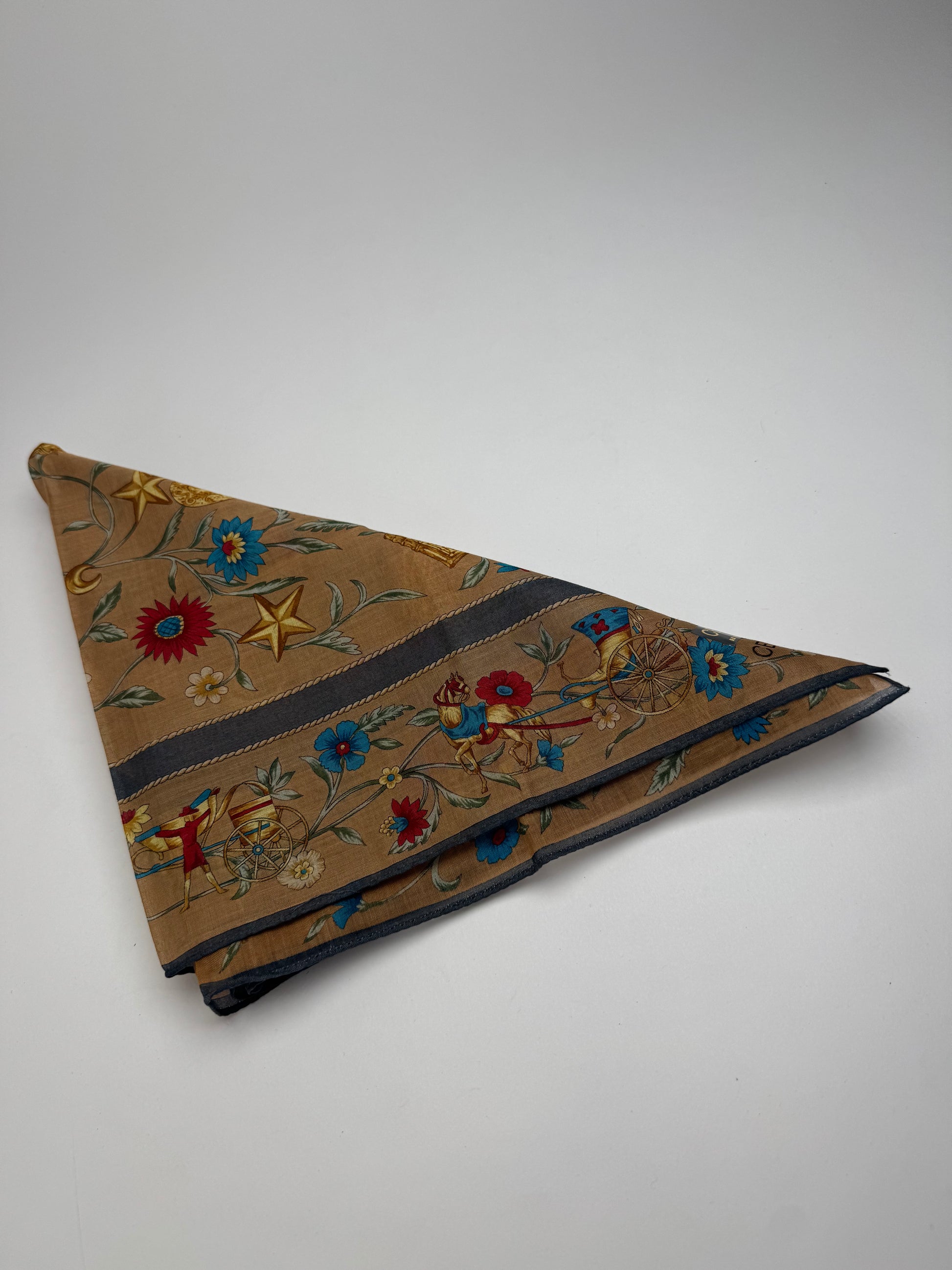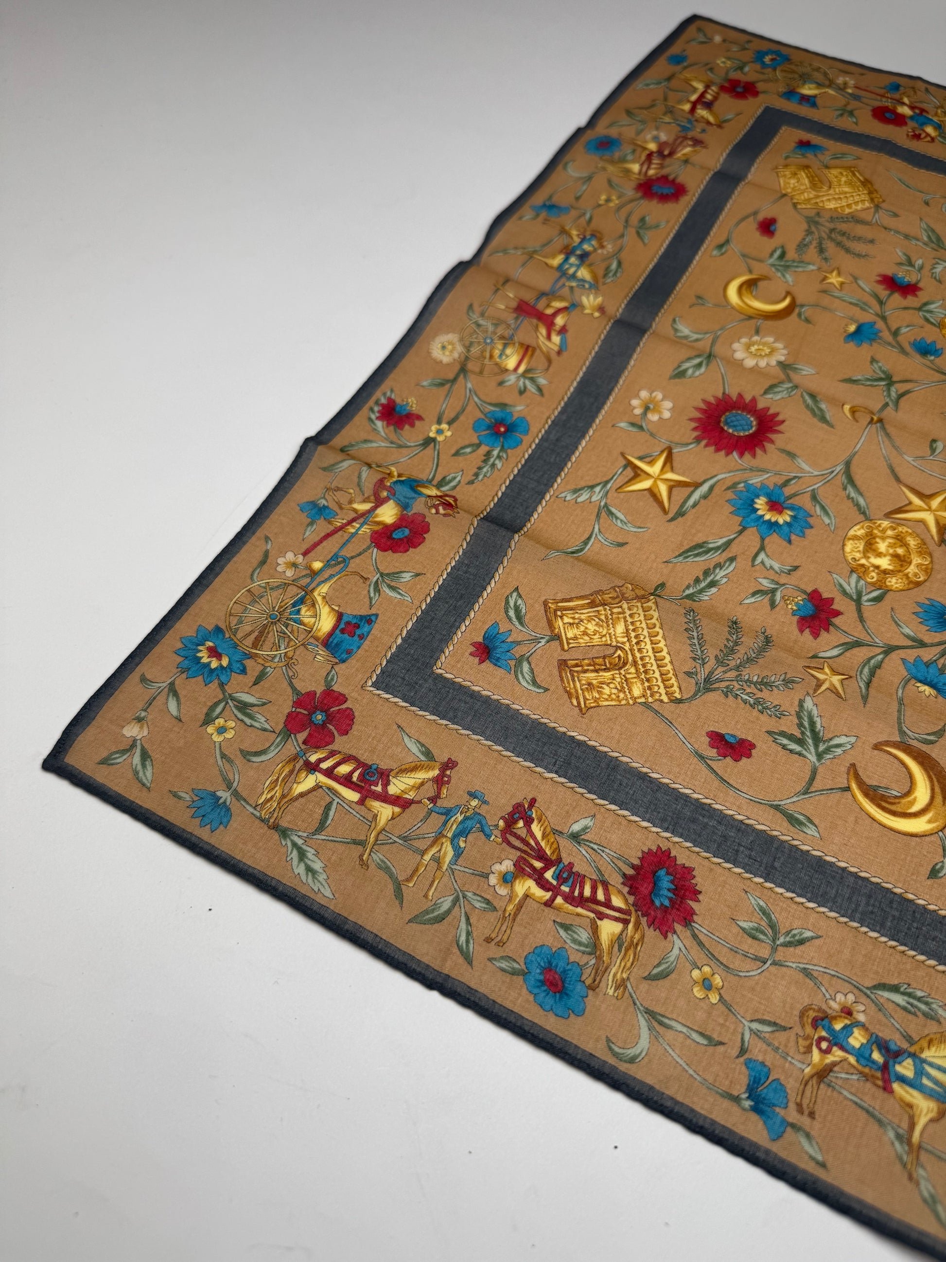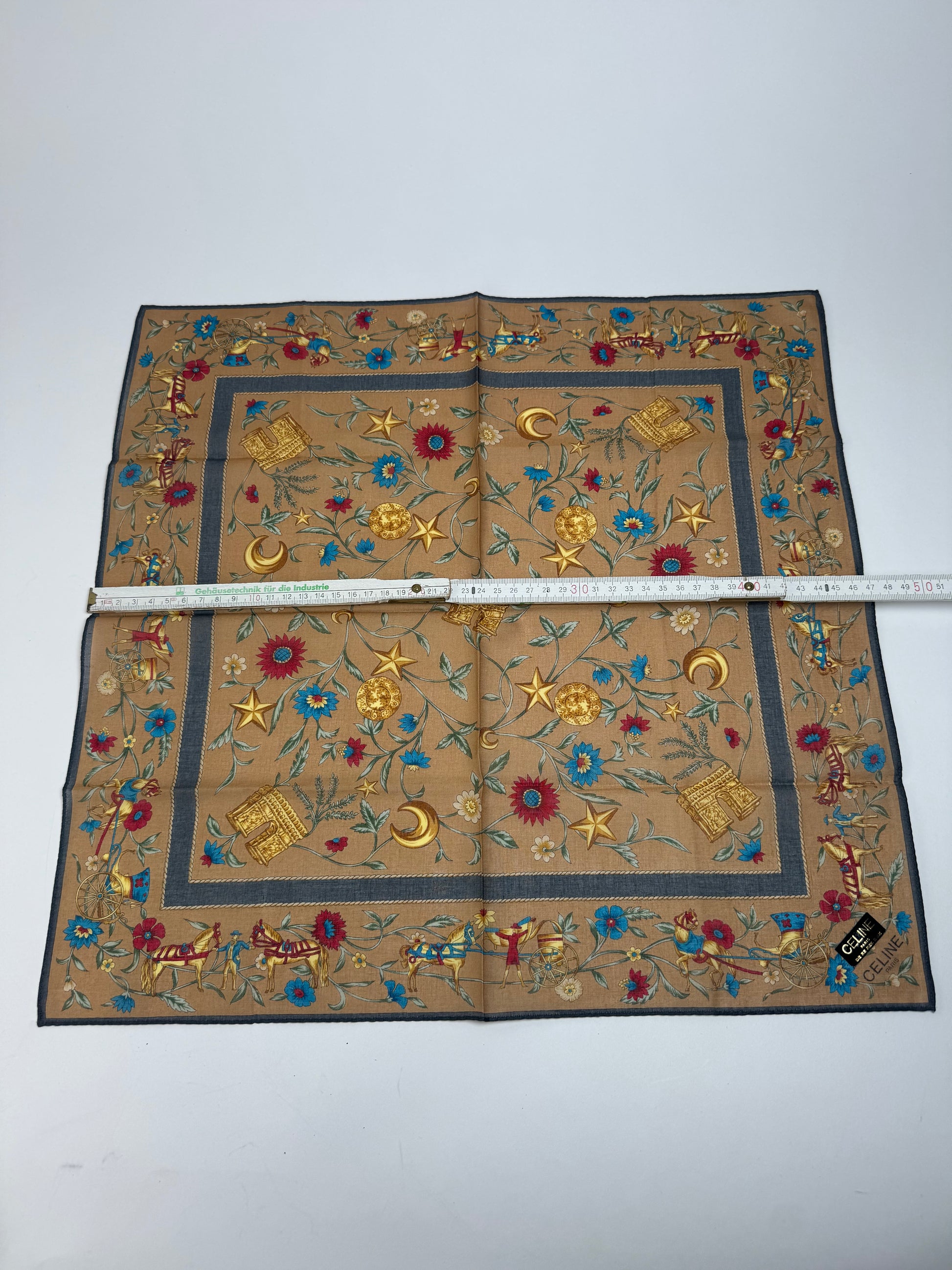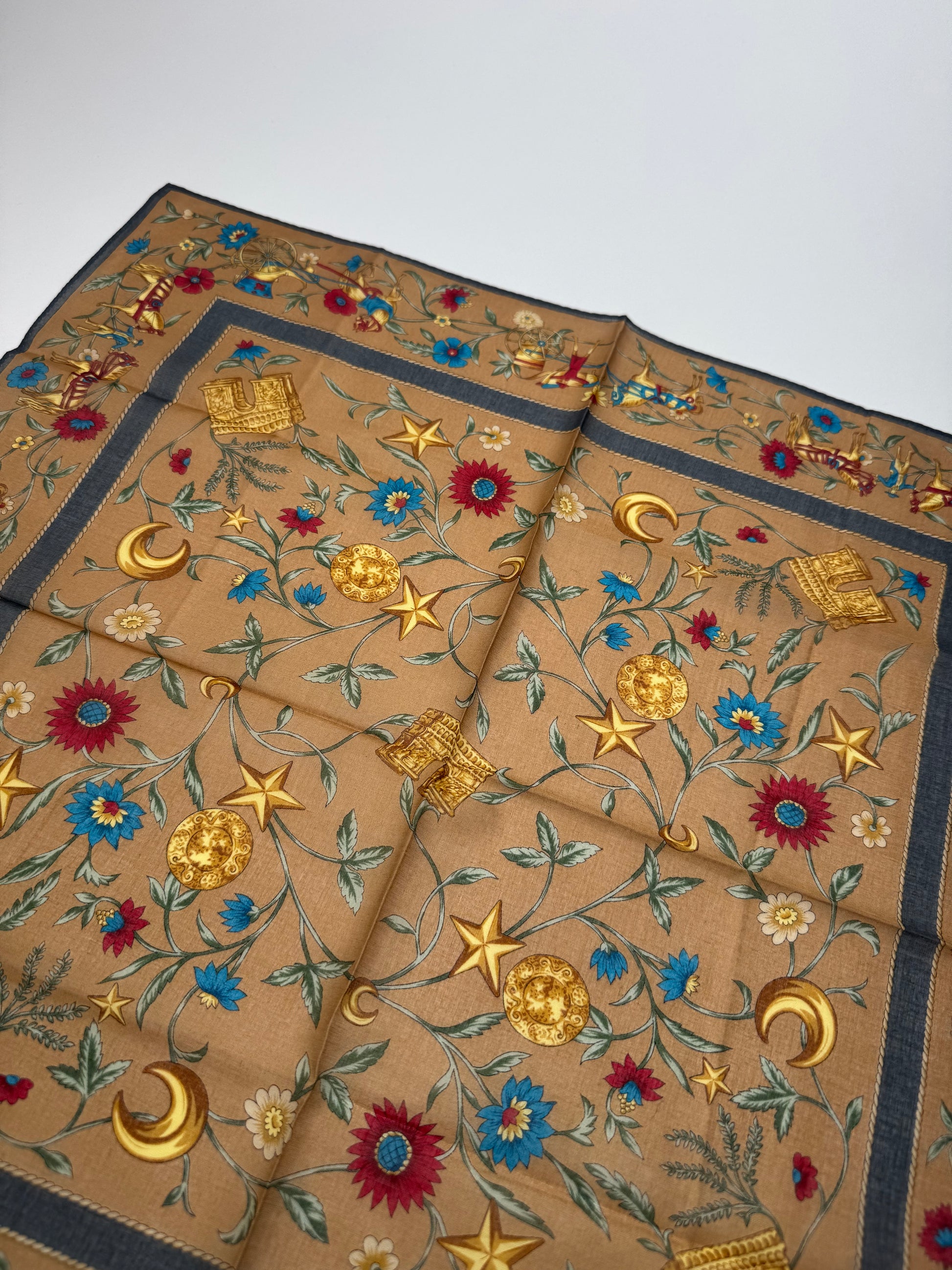 CELINE Brown Celestial & Floral Print Scarf. This vintage scarf features a rich brown base adorned with red and blue floral patterns, golden celestial symbols like the sun and moon, horses, and an Arc de Triomphe motif, all framed by a navy border.