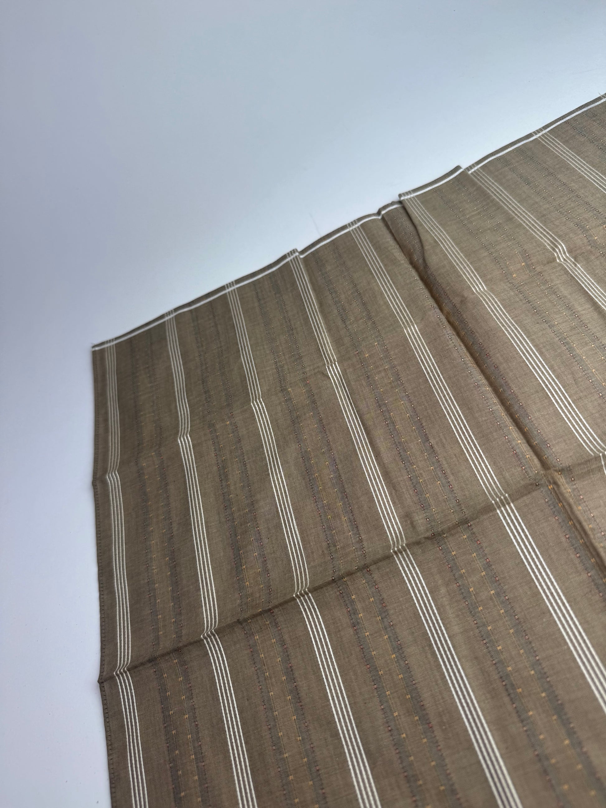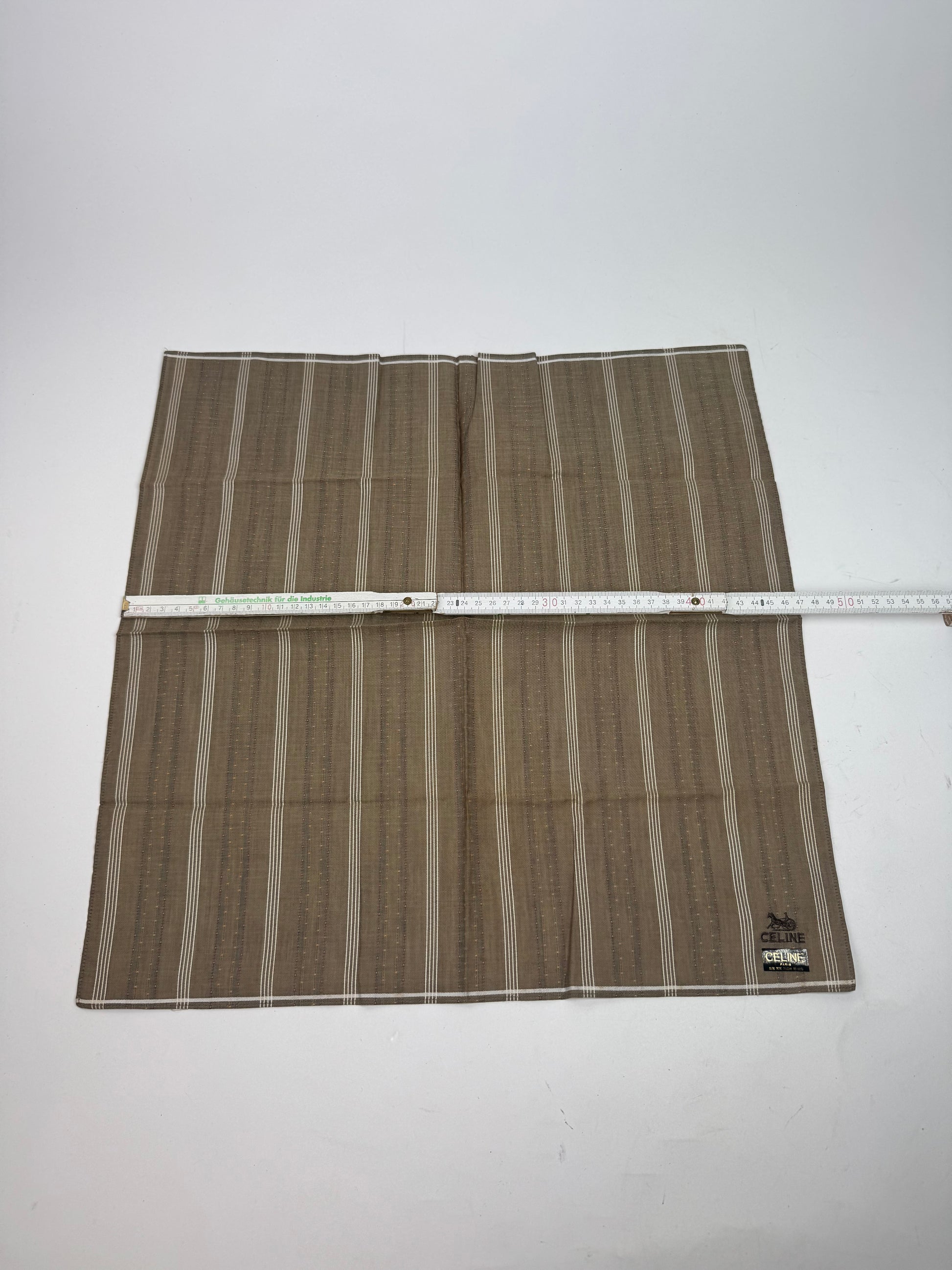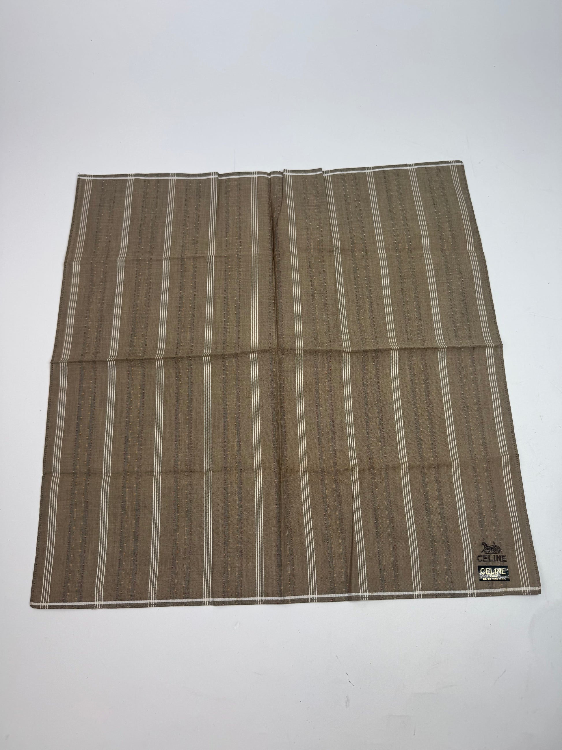 This chic accessory is finely crafted of brown cotton and silk with white stripes and subtle patterned details.