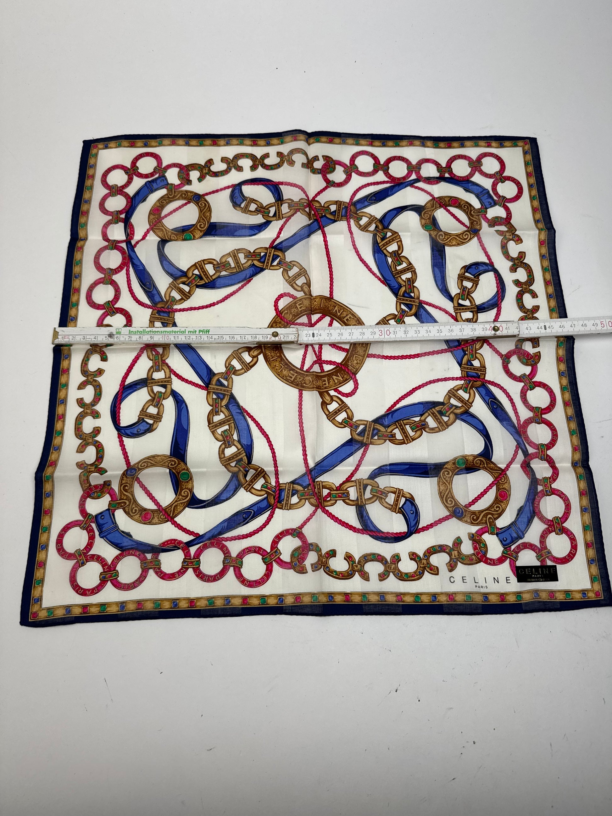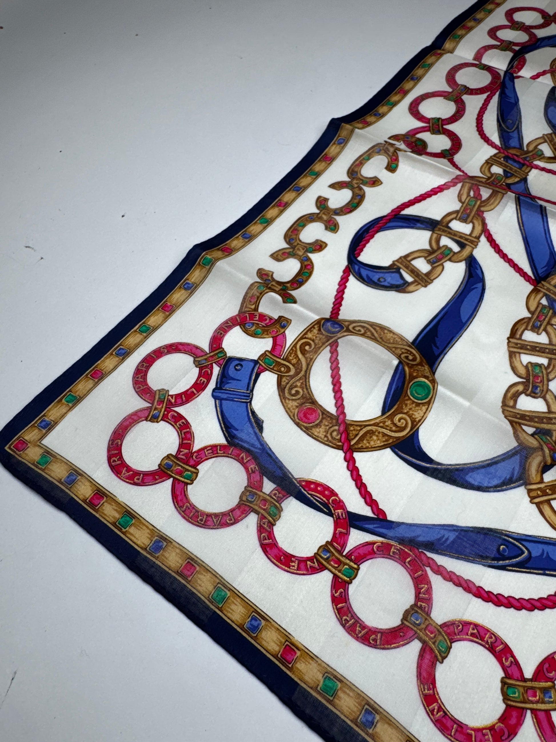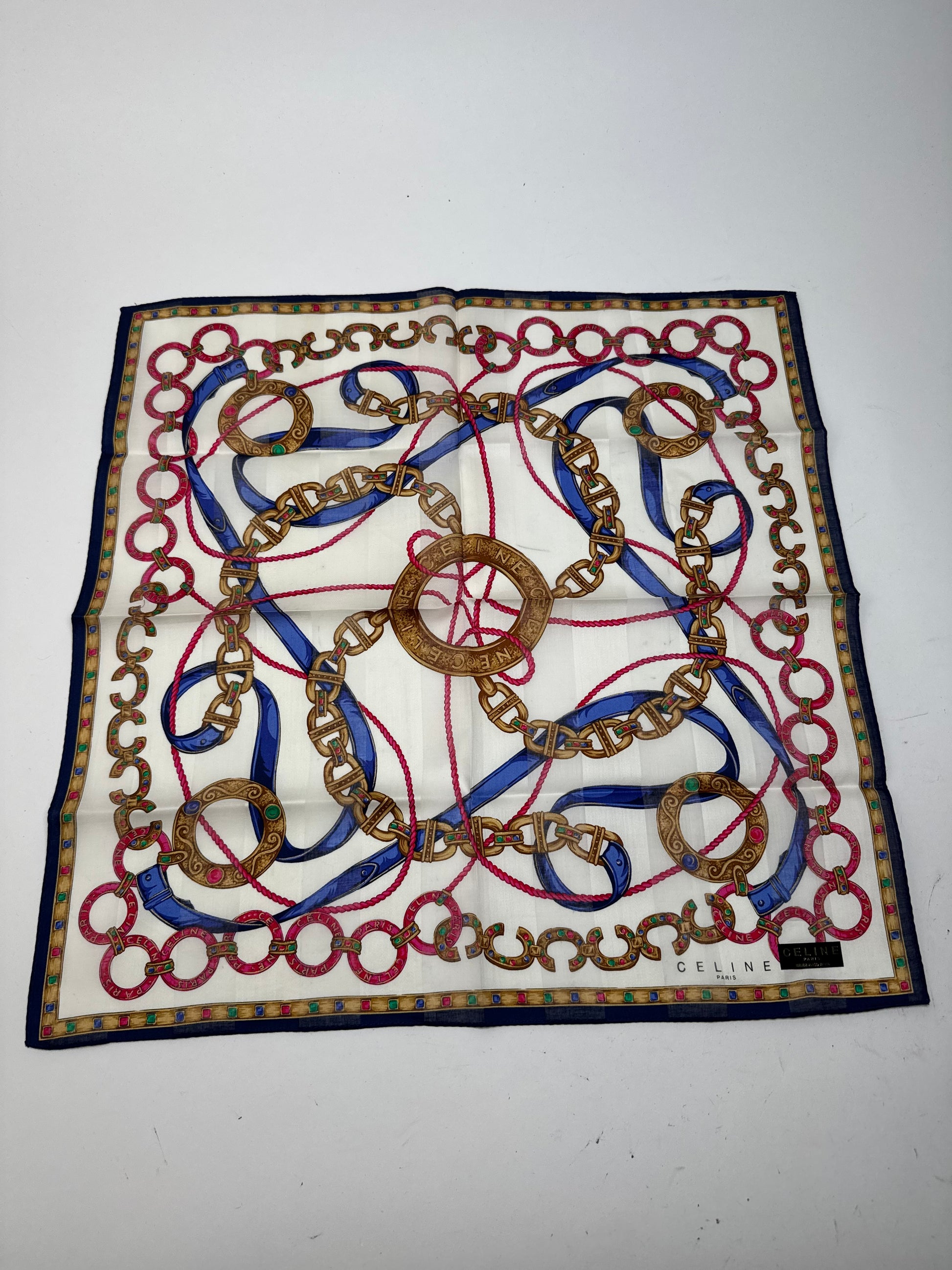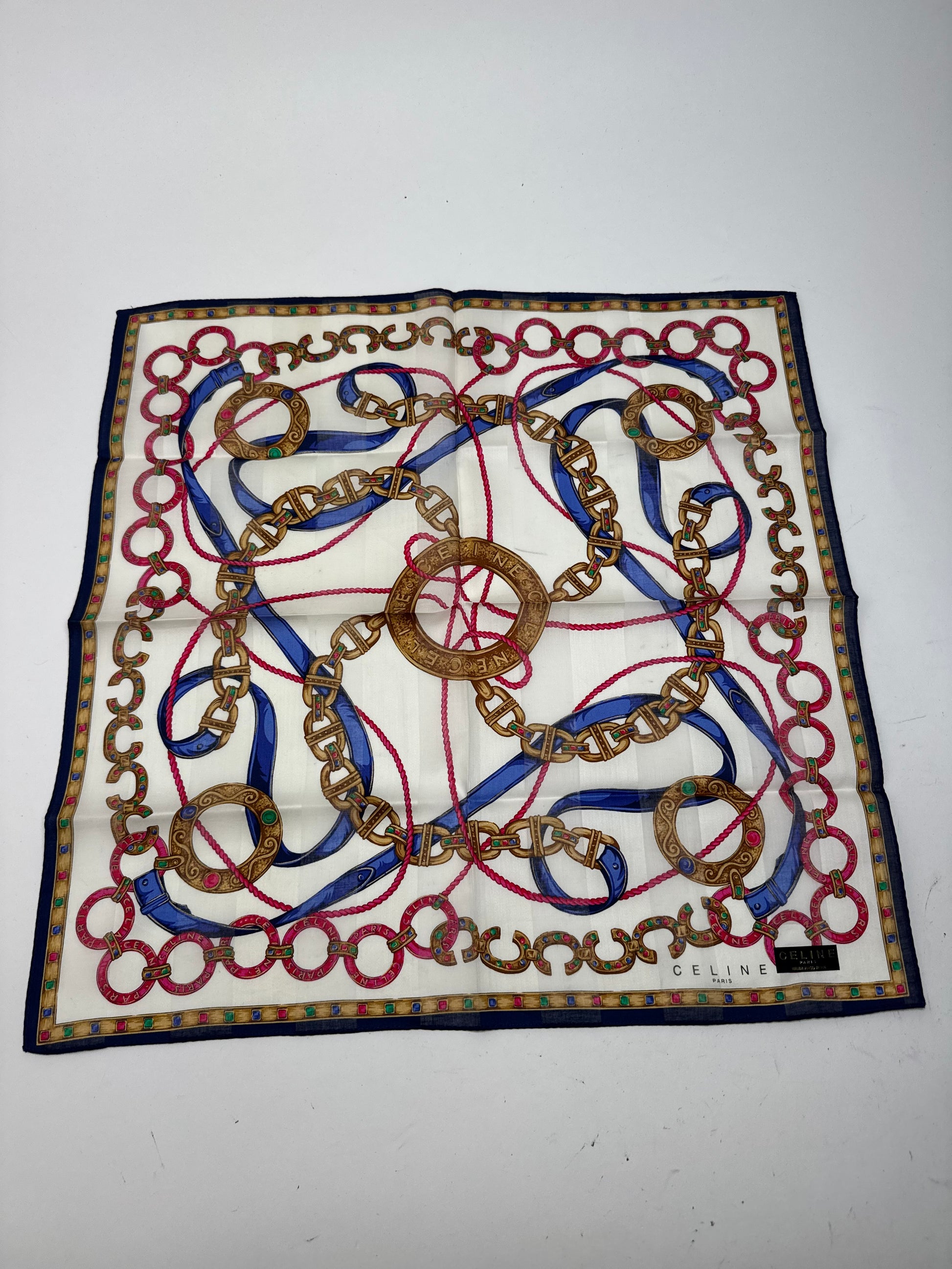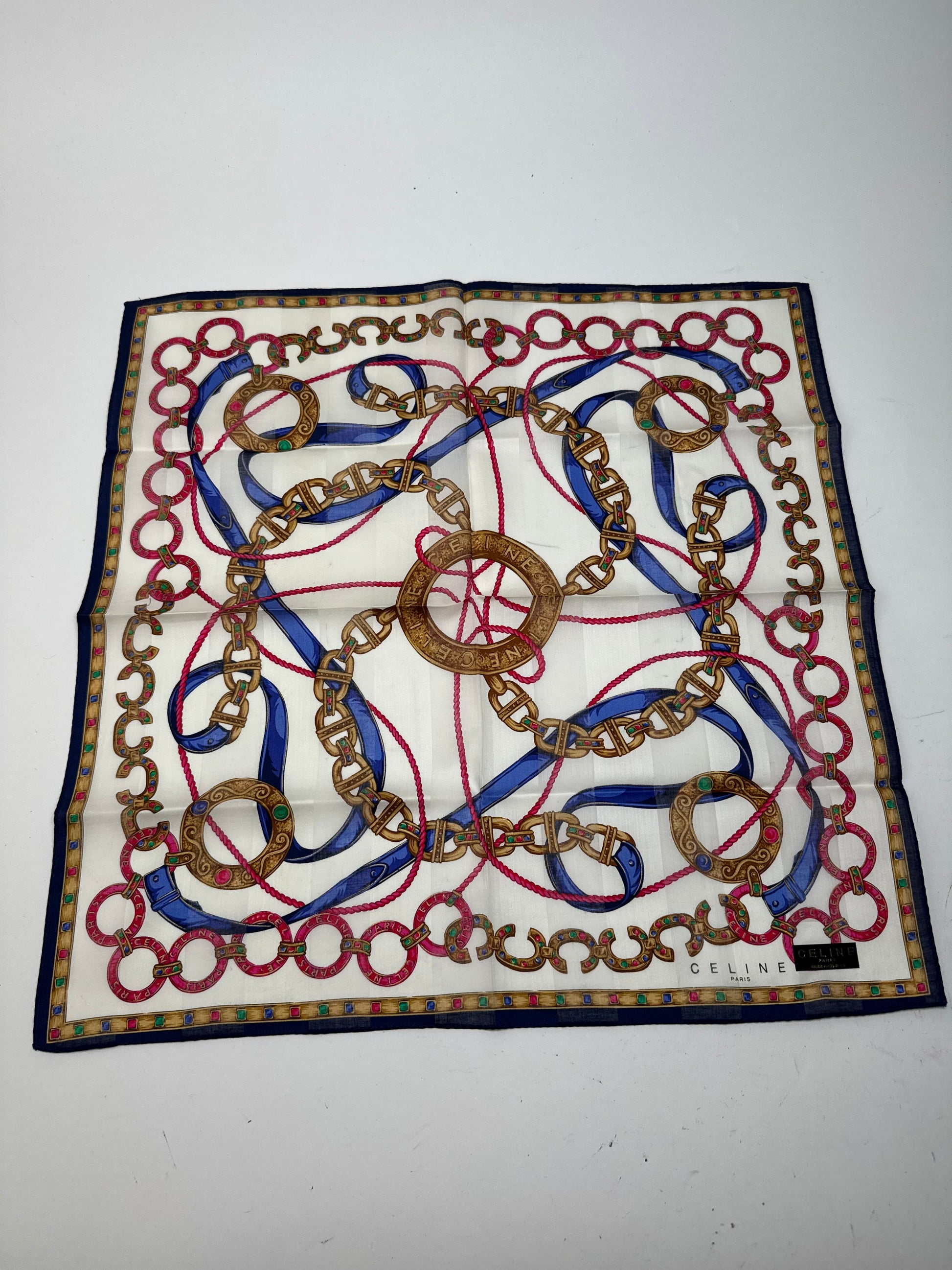CÉLINE PARIS Vintage Scarf. This chic scarf is finely crafted of a soft cotton and silk blend fabric with a white base, featuring gold chains and red and blue stripes in a baroque-style pattern.