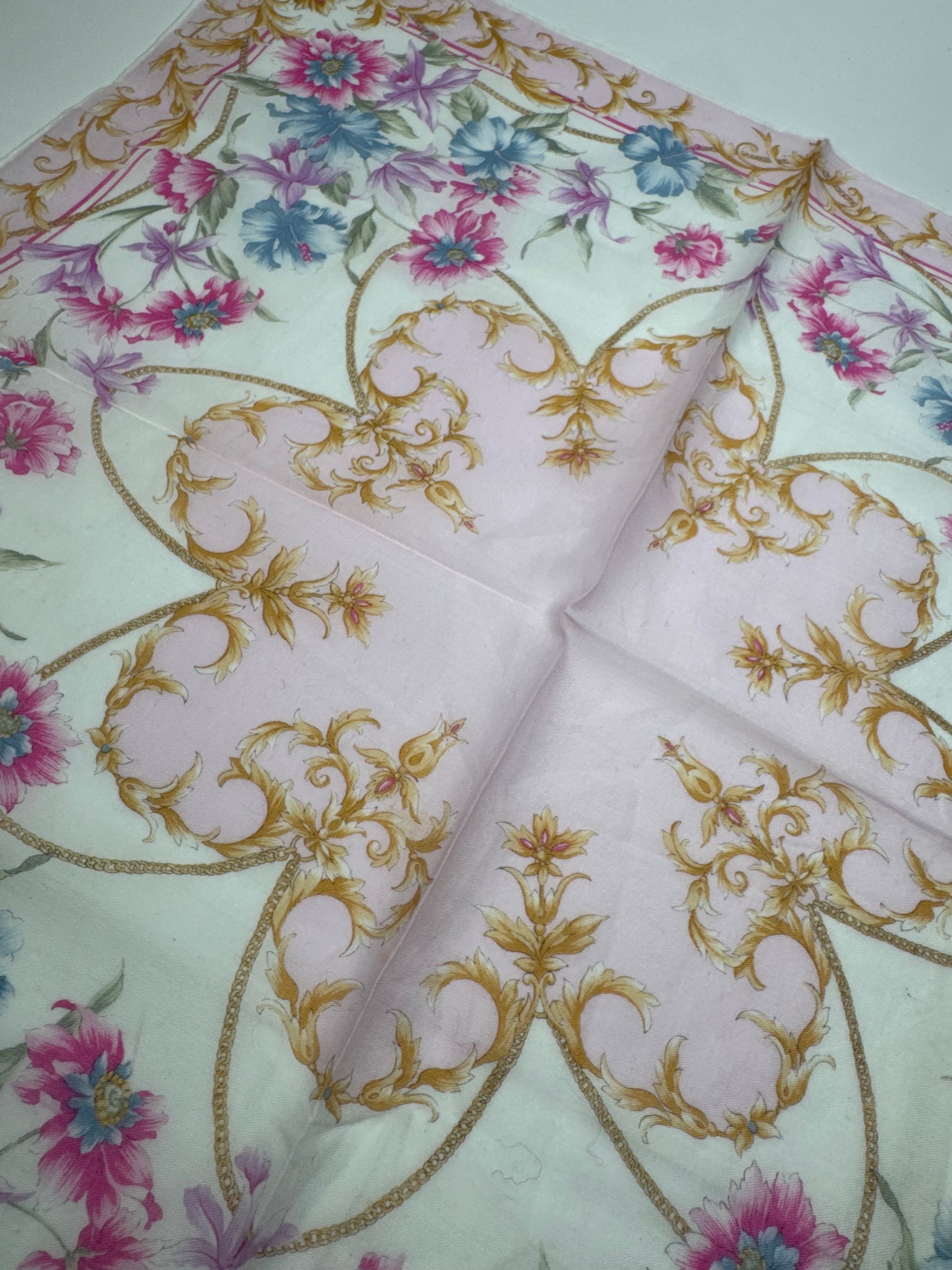 This vintage scarf is finely crafted of silk and canvas in a soft pink, gold, white, and blue floral pattern. A refined and elegant accessory, perfect for both classic and modern looks.