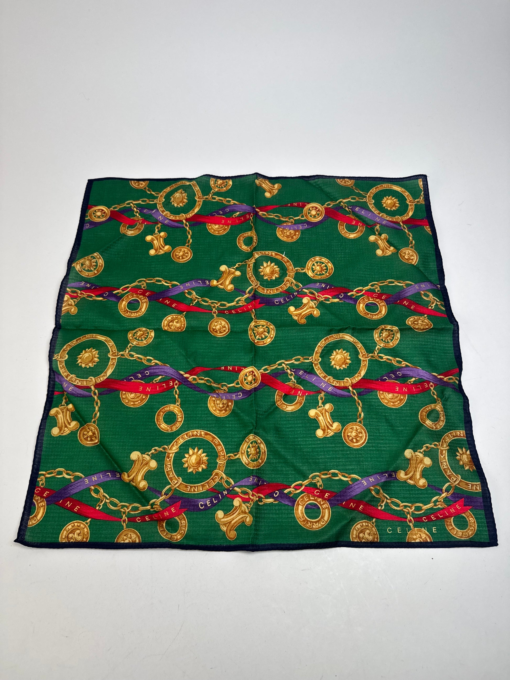 CELINE PARIS Vintage Scarf. This elegant vintage scarf features a green base colour with purple and red ribbon motifs detailed with Celine lettering, complemented by gold-toned Celine Triomphe logos, ring motifs, and sun symbols throughout the design.