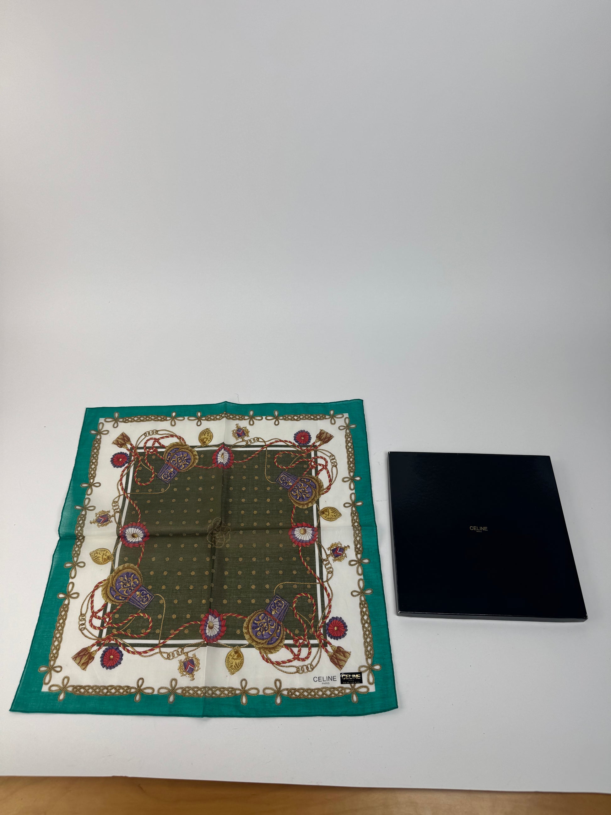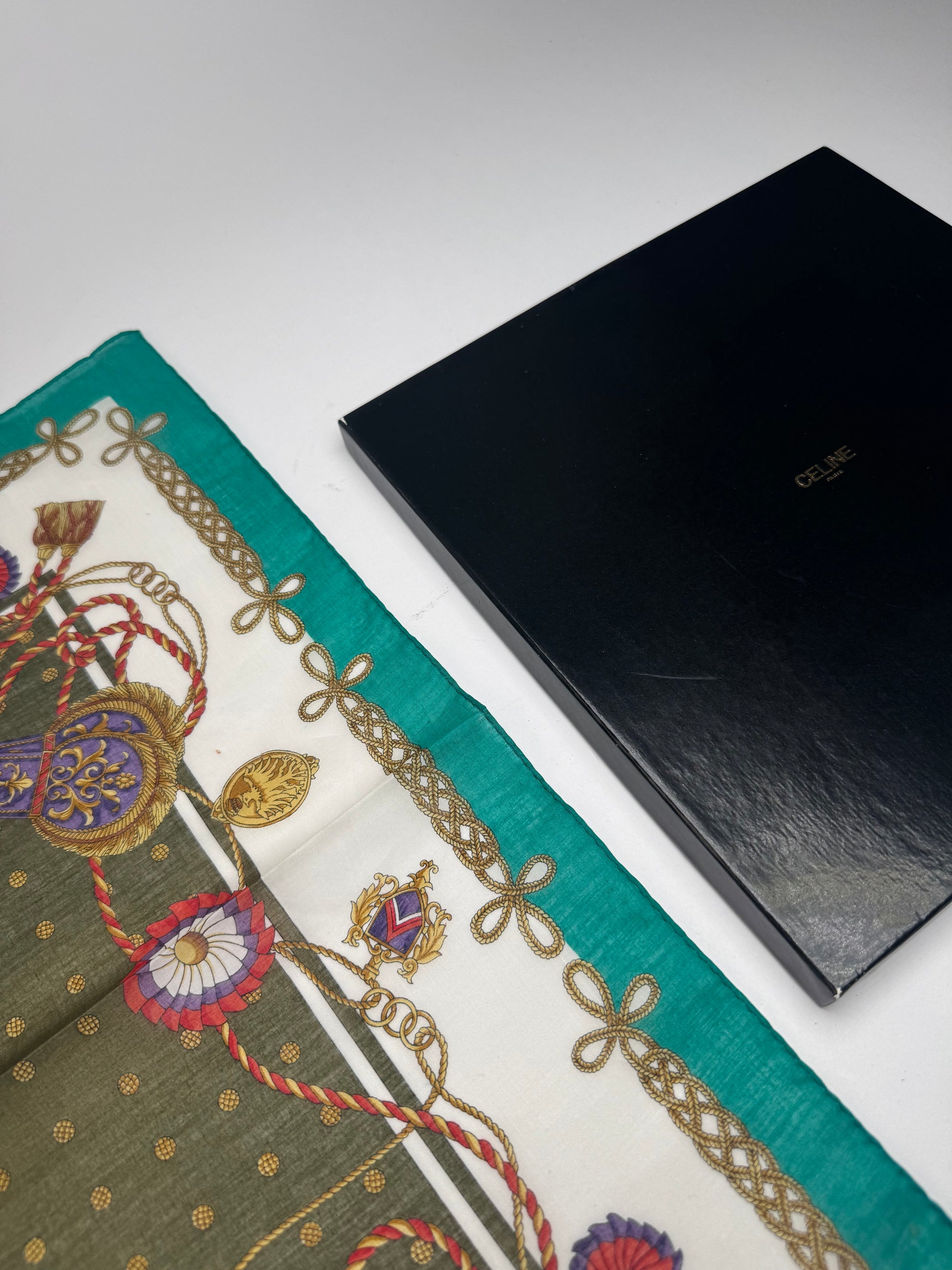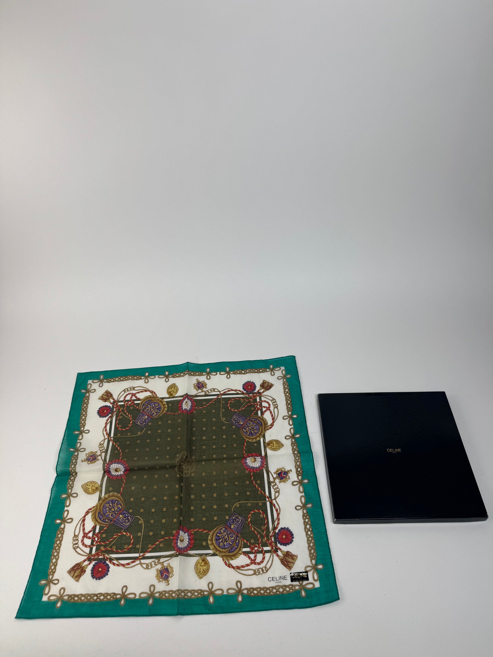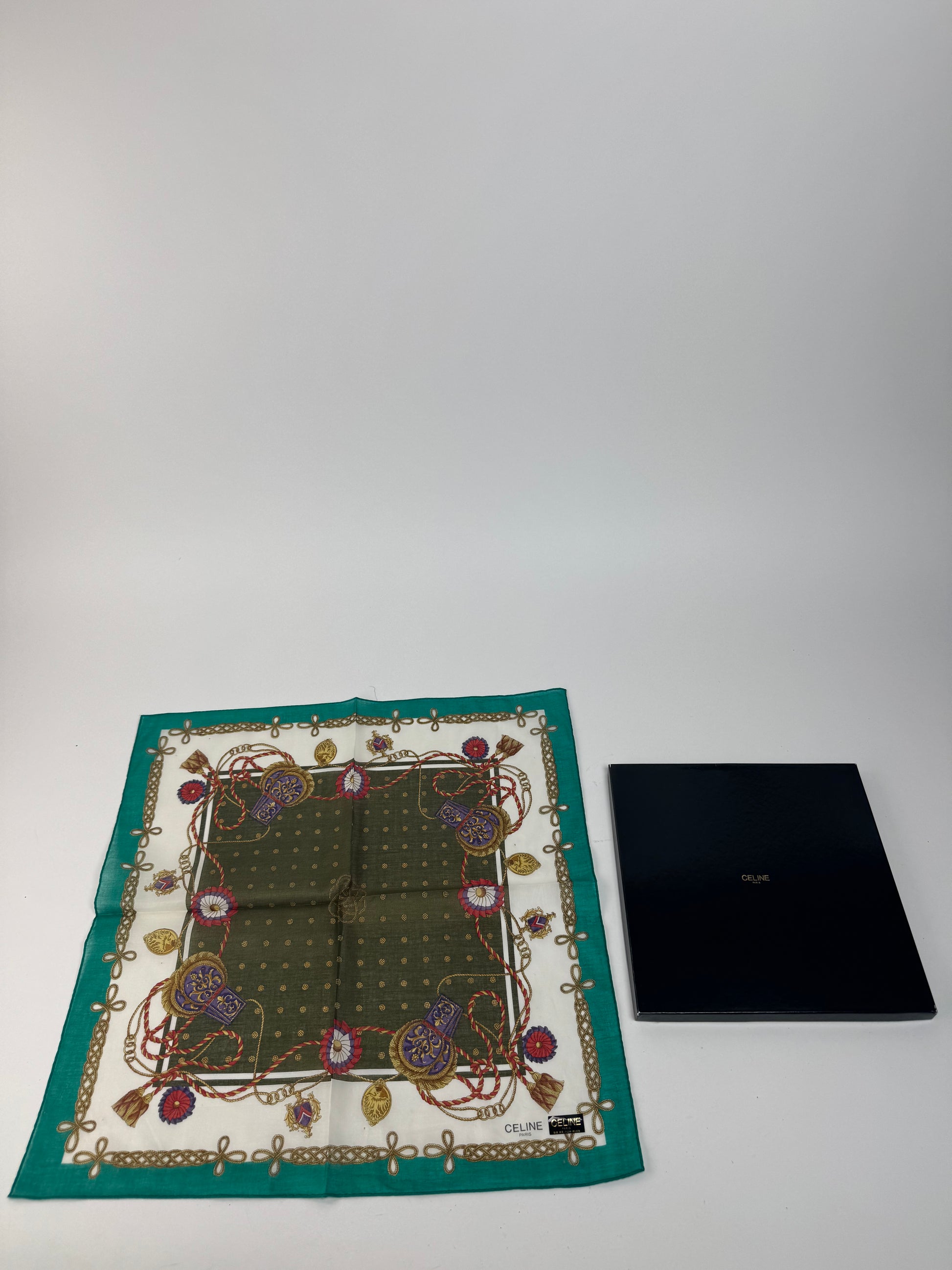 CELINE PARIS Vintage Scarf. This refined scarf features a turquoise border with intricate baroque-style chains, floral motifs, and decorative elements. At the center, a dark green square with golden dots creates a striking focal point.
