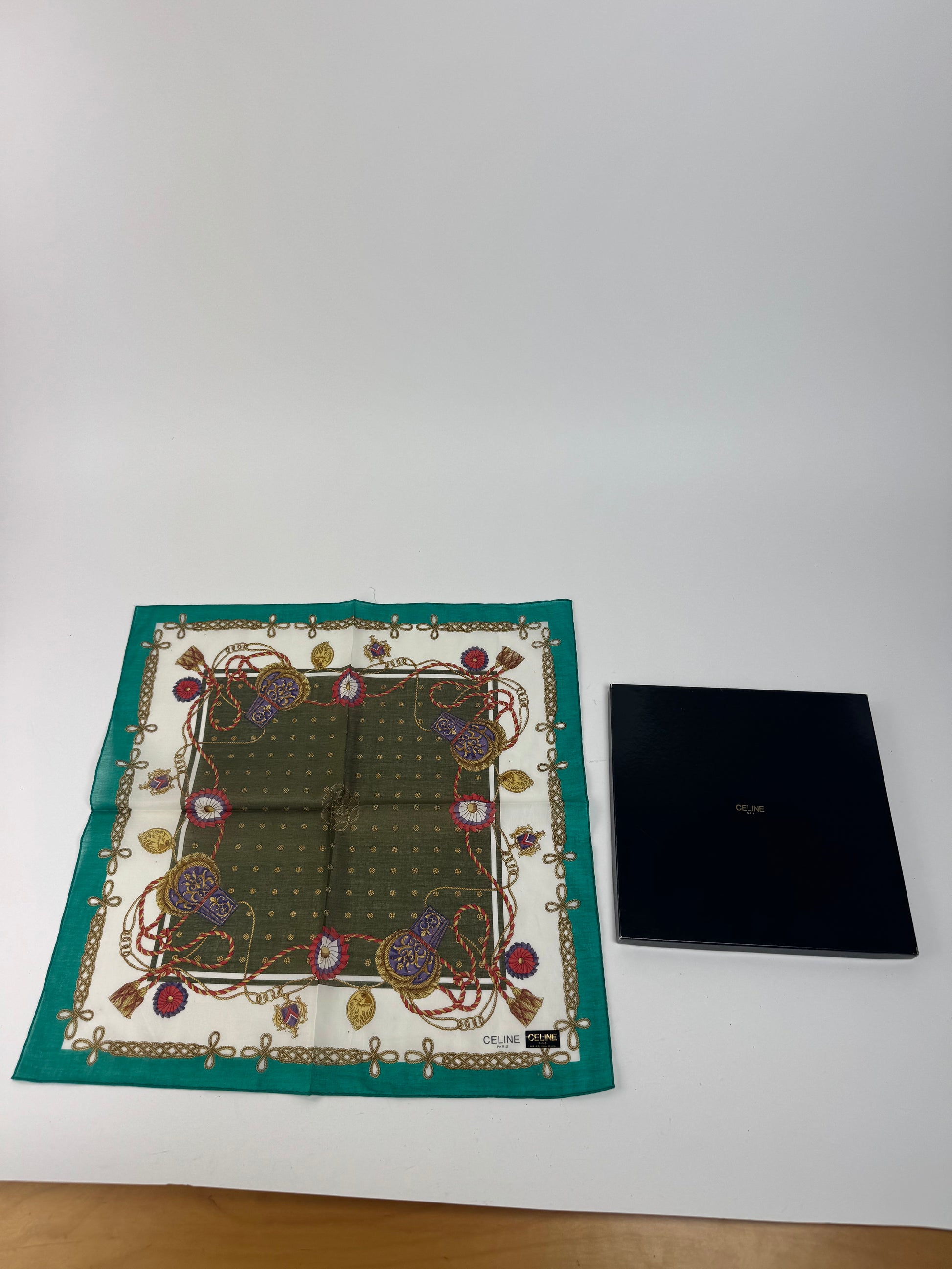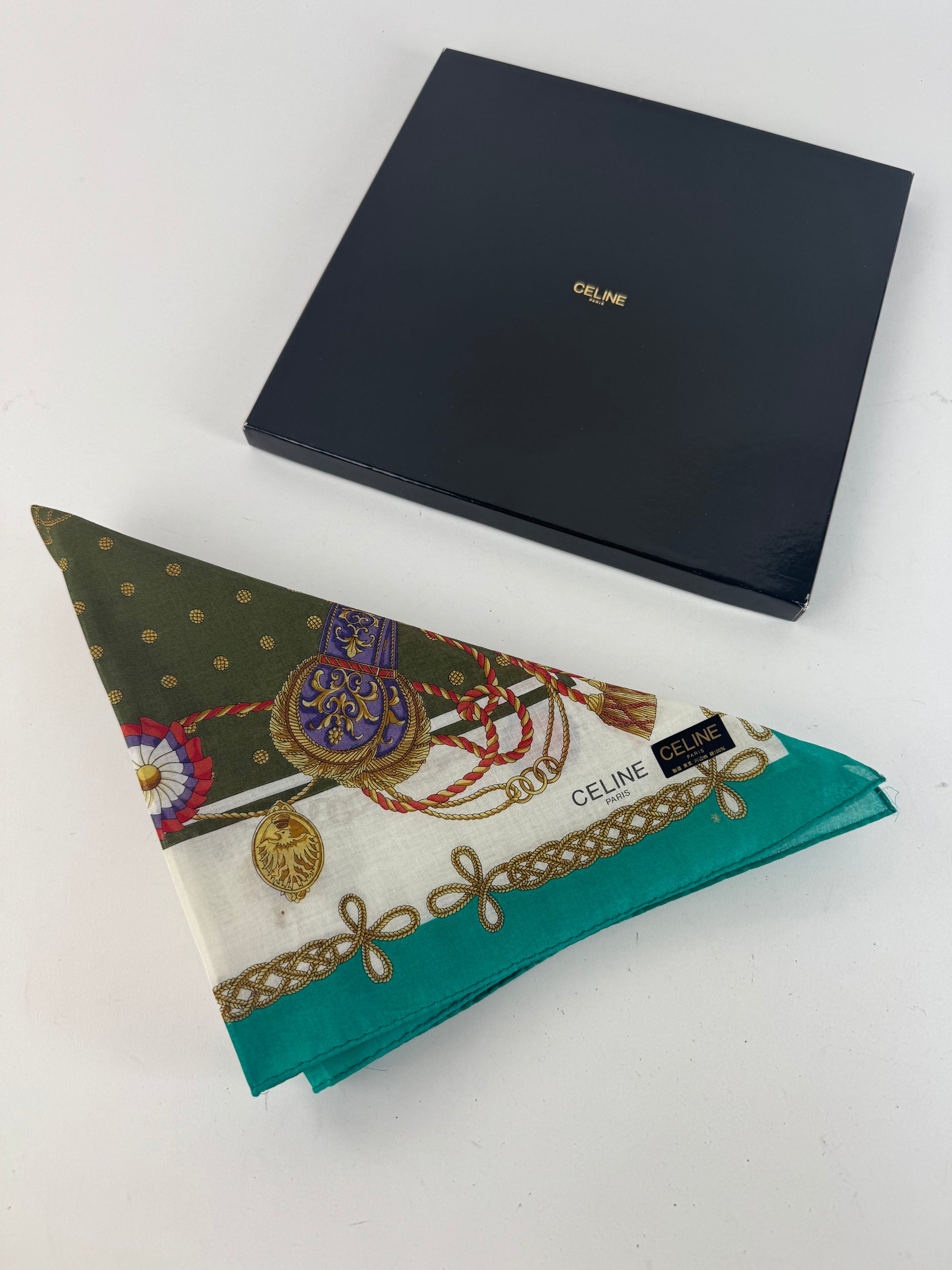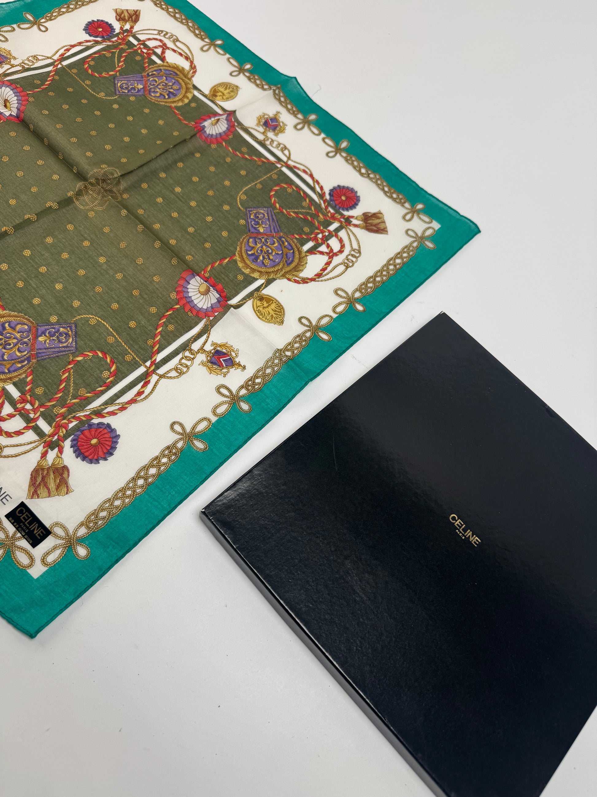 CELINE PARIS Vintage Scarf. This refined scarf features a turquoise border with intricate baroque-style chains, floral motifs, and decorative elements. At the center, a dark green square with golden dots creates a striking focal point.