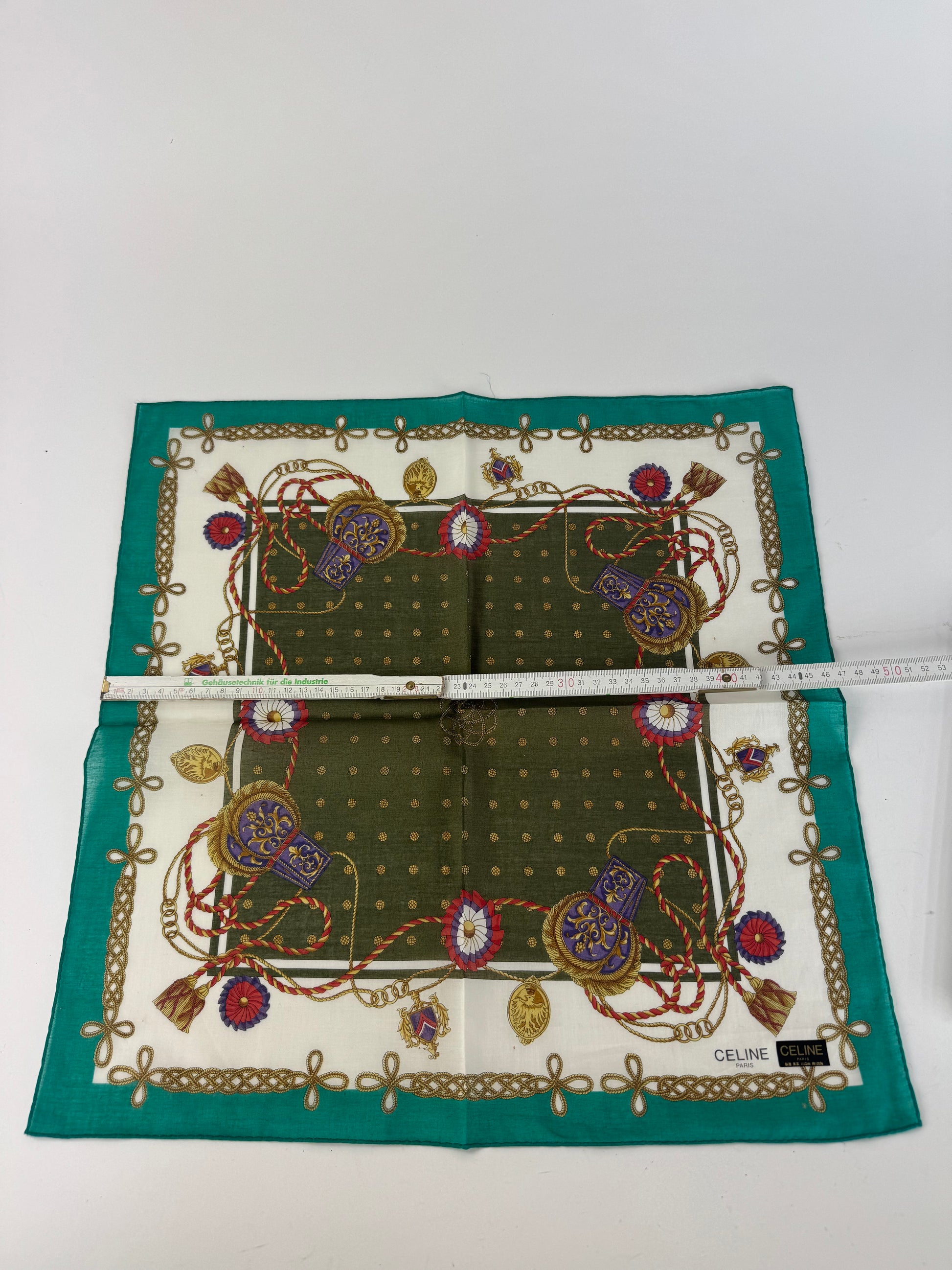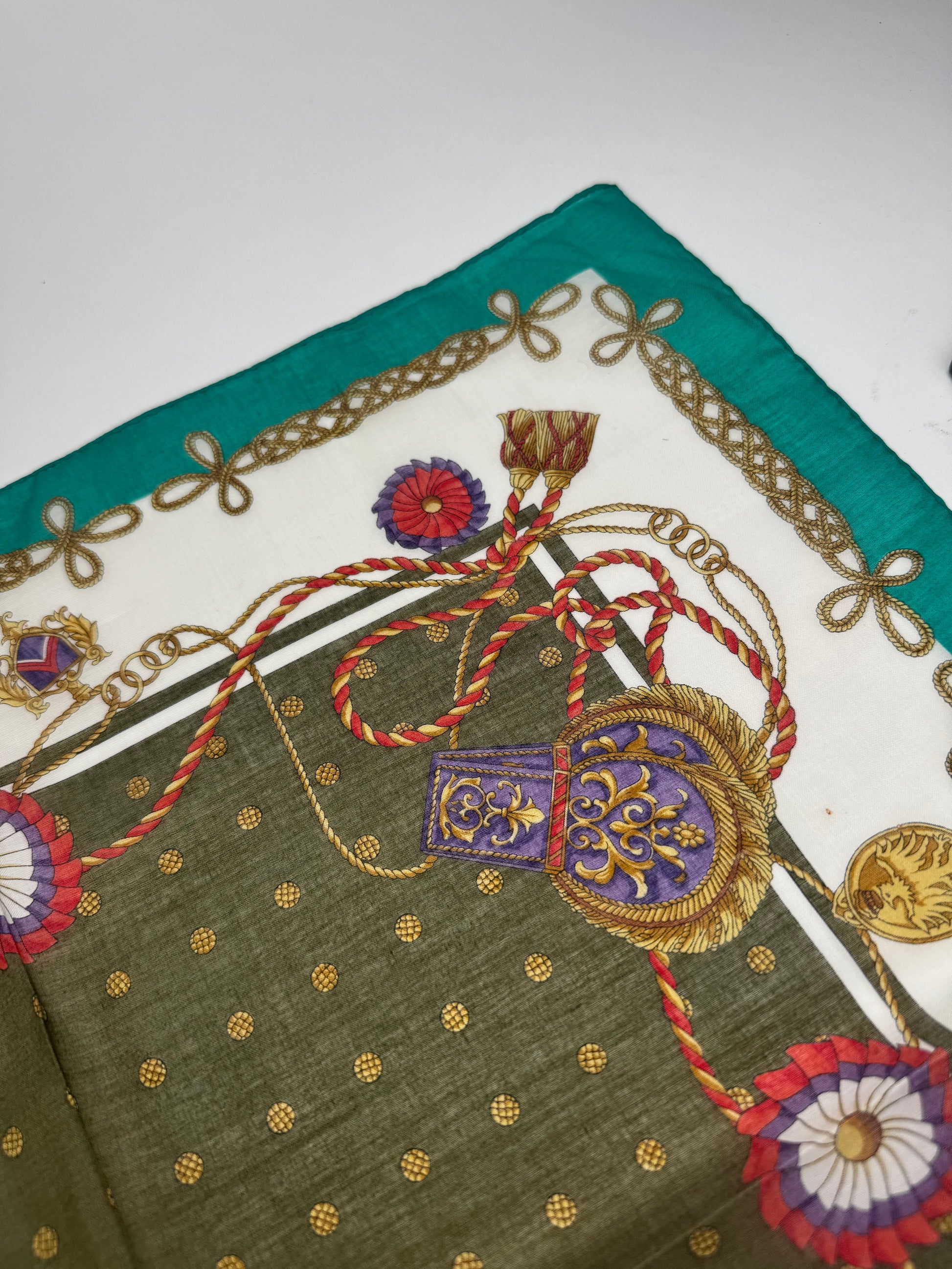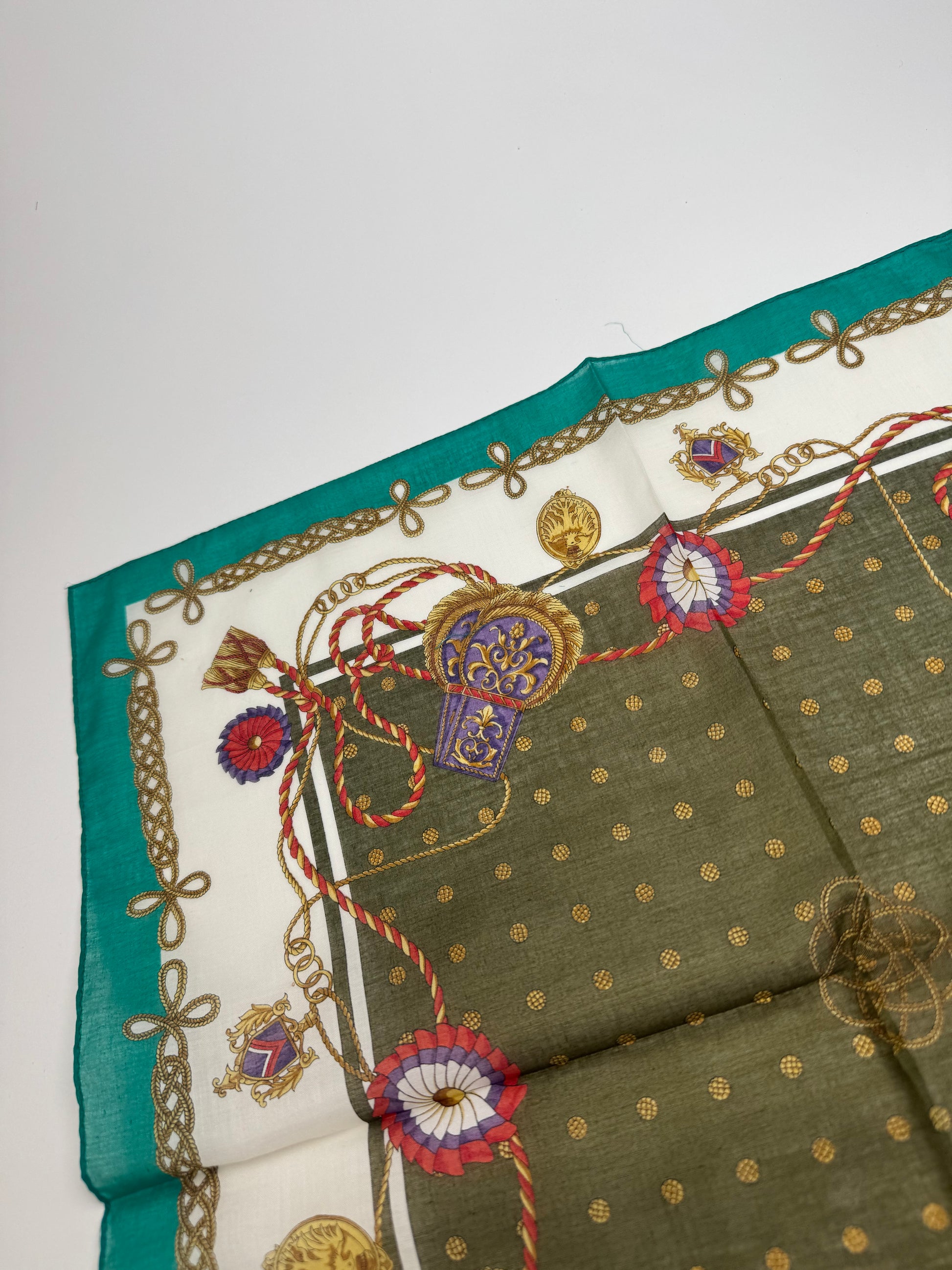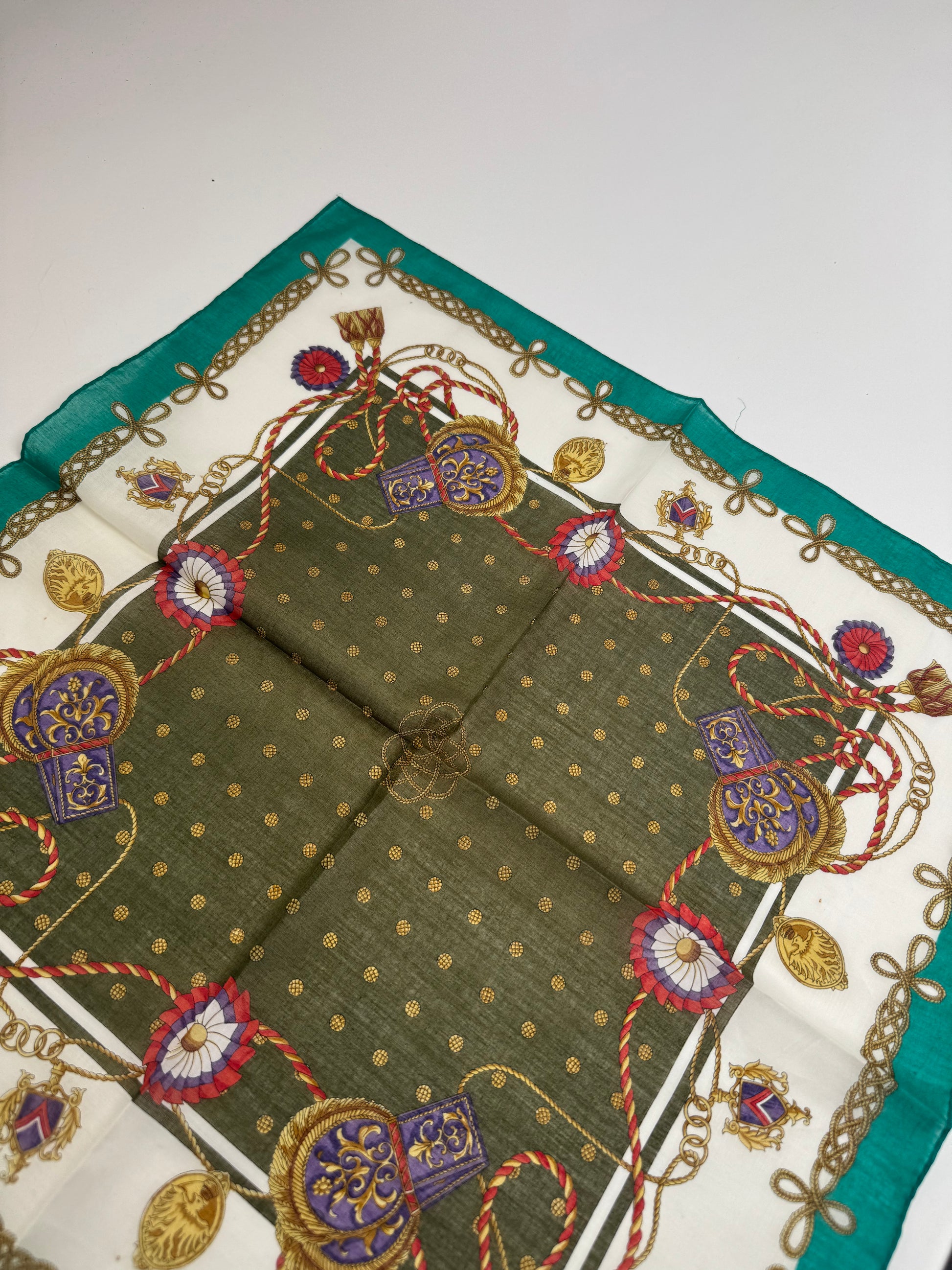 CELINE PARIS Vintage Scarf. This refined scarf features a turquoise border with intricate baroque-style chains, floral motifs, and decorative elements. At the center, a dark green square with golden dots creates a striking focal point.
