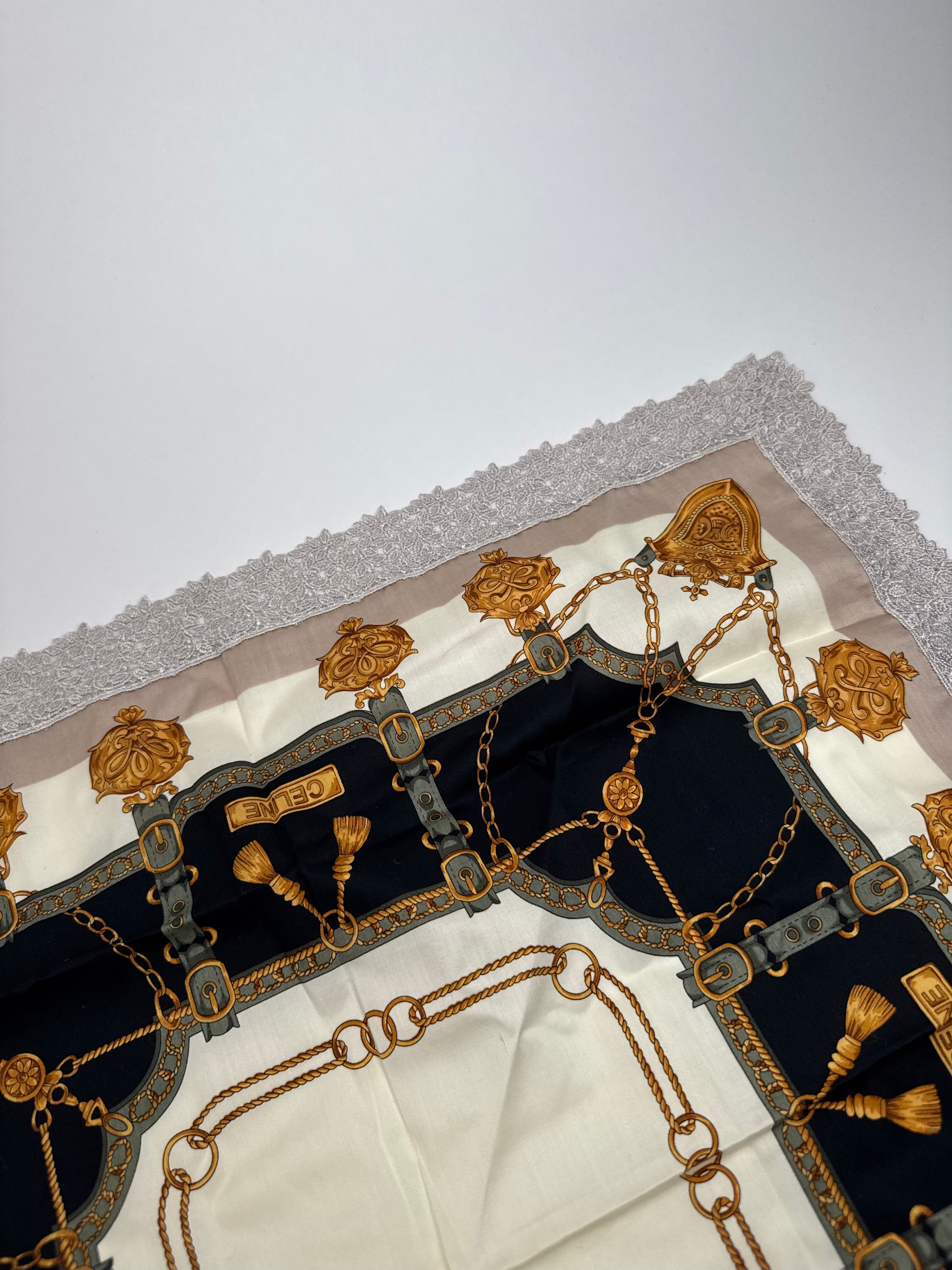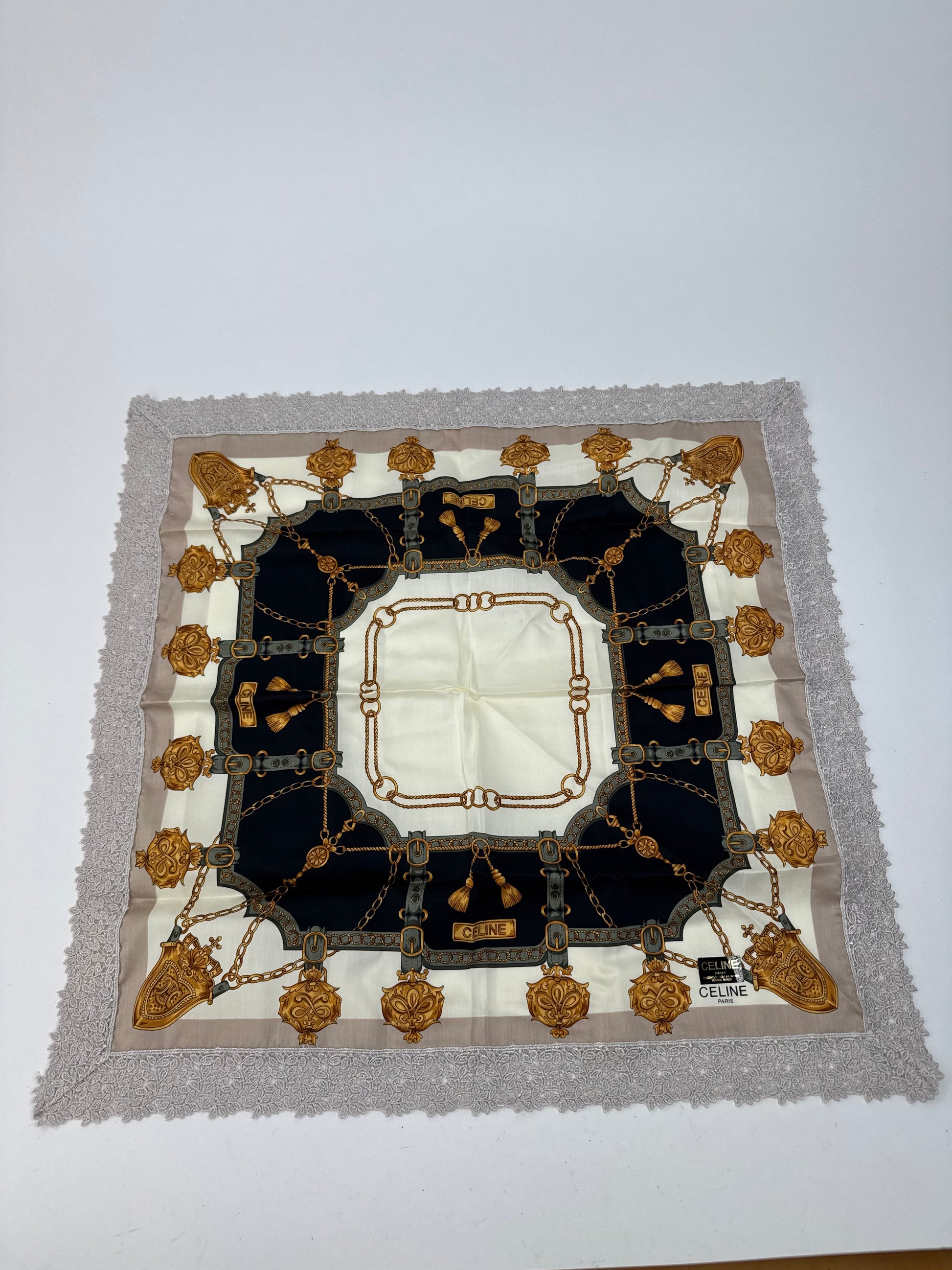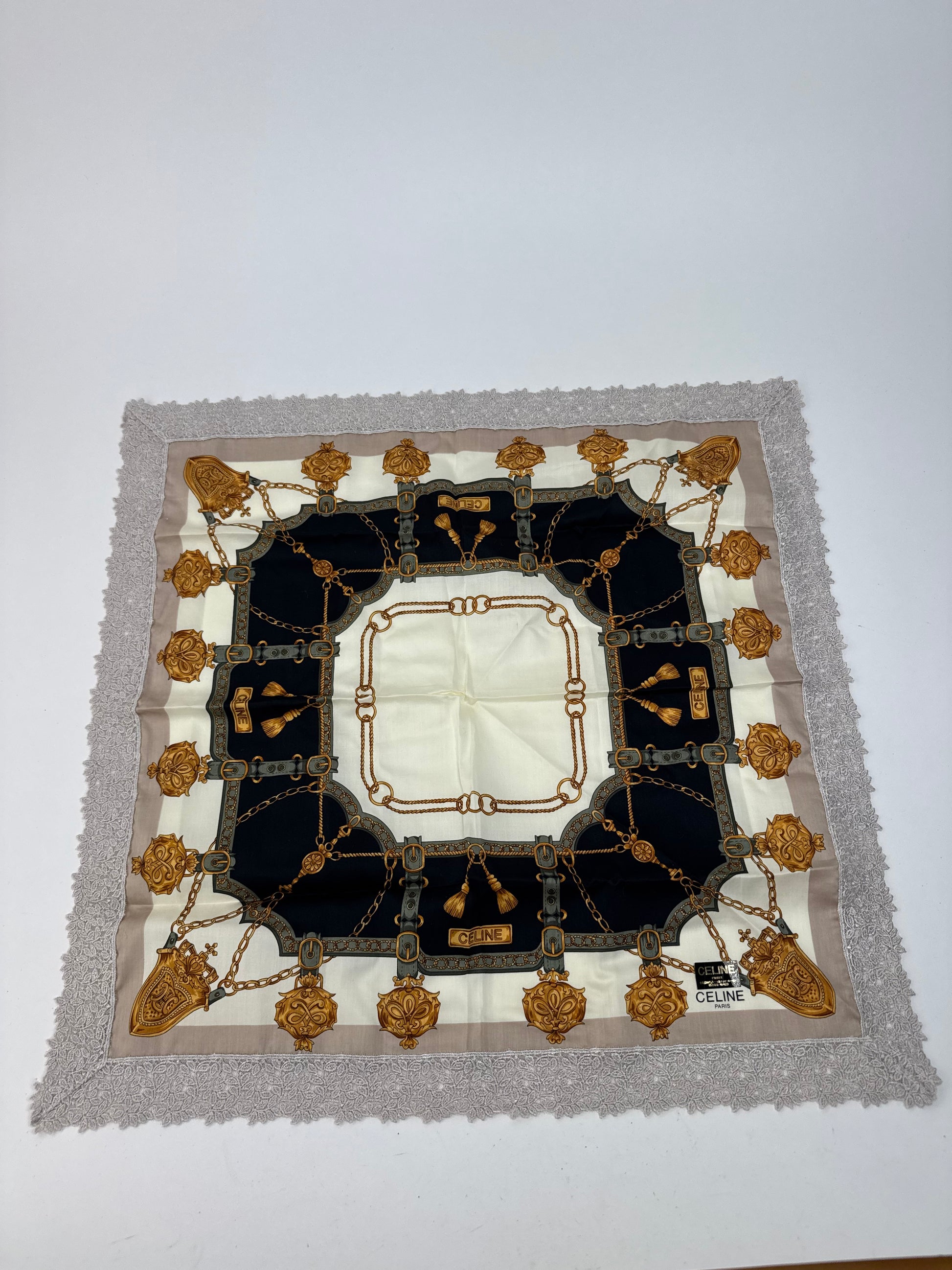 This opulent vintage scarf by Céline Paris features a silver-toned border reminiscent of ornate table décor, framing a luxurious design of golden chains and baroque-style jewelry elements. Accents in white and black add contrast and depth to the richly detailed print.