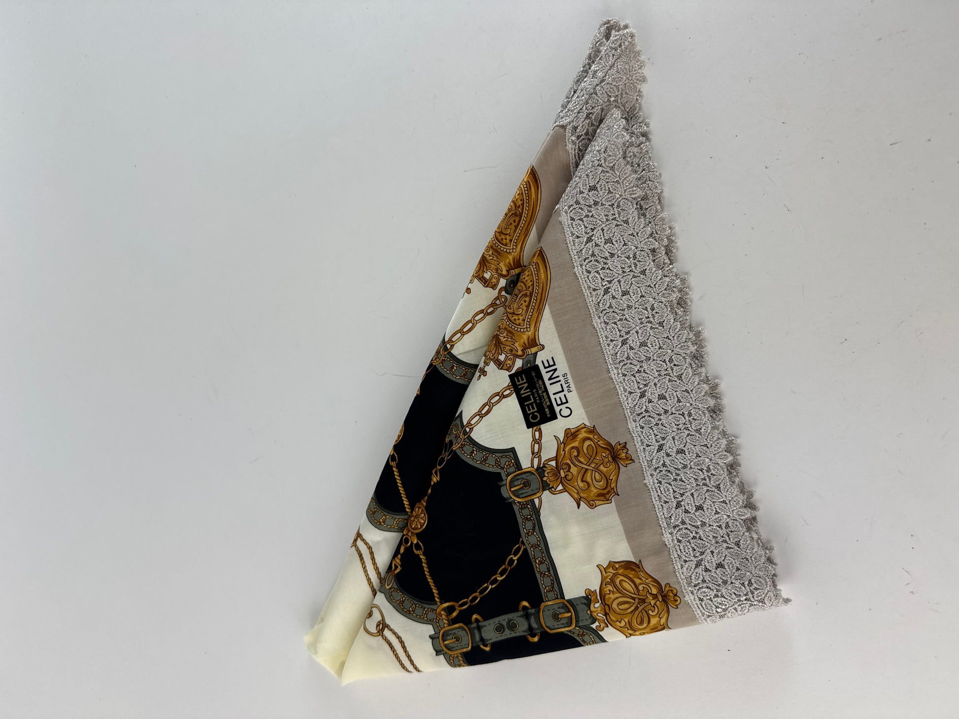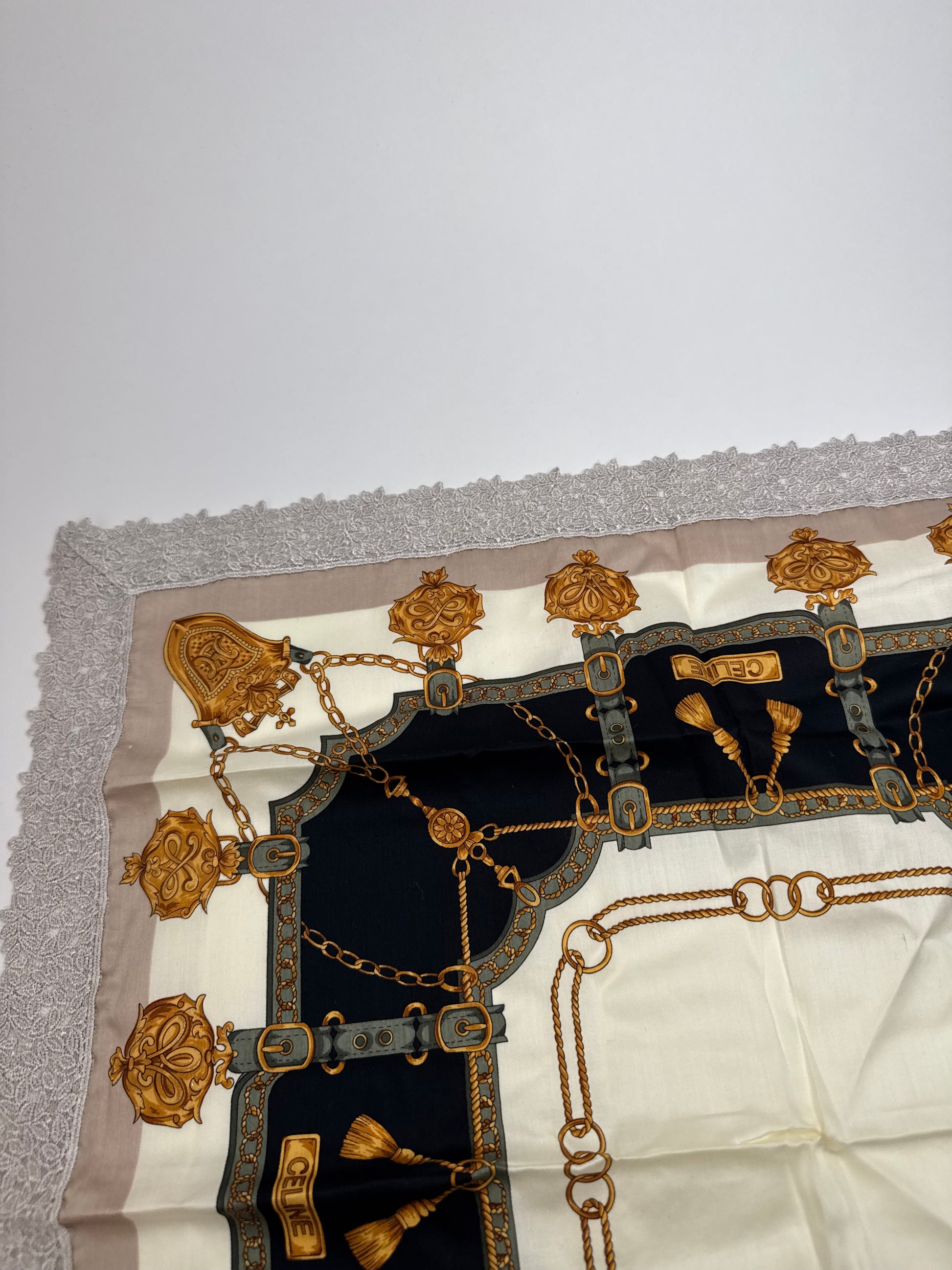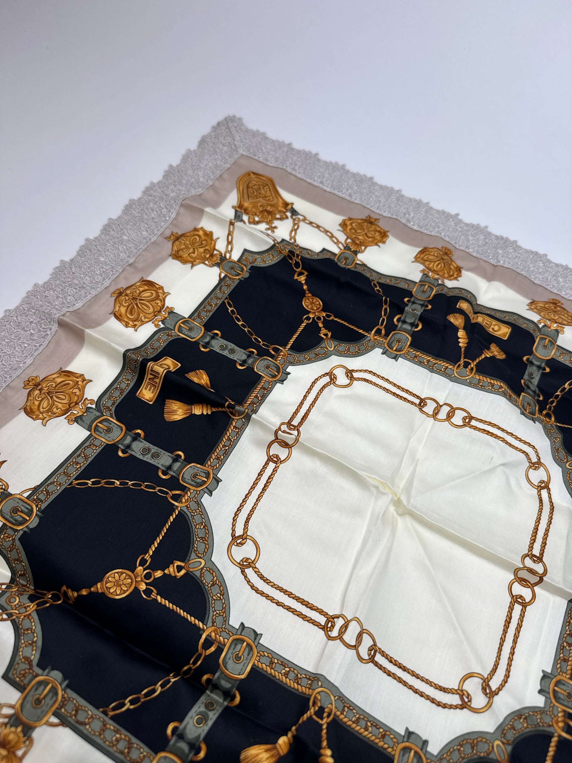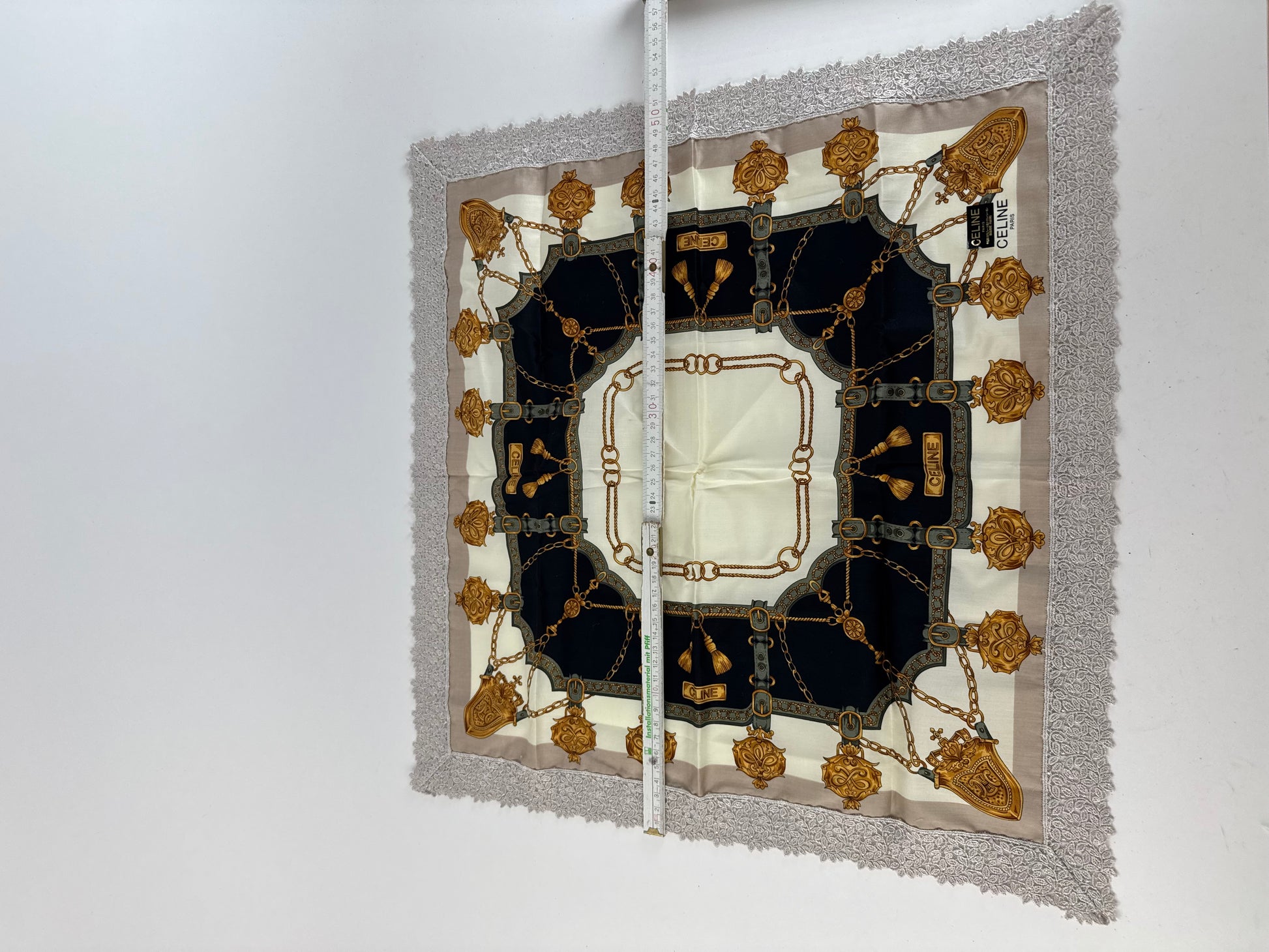 This opulent vintage scarf by Céline Paris features a silver-toned border reminiscent of ornate table décor, framing a luxurious design of golden chains and baroque-style jewelry elements. Accents in white and black add contrast and depth to the richly detailed print.