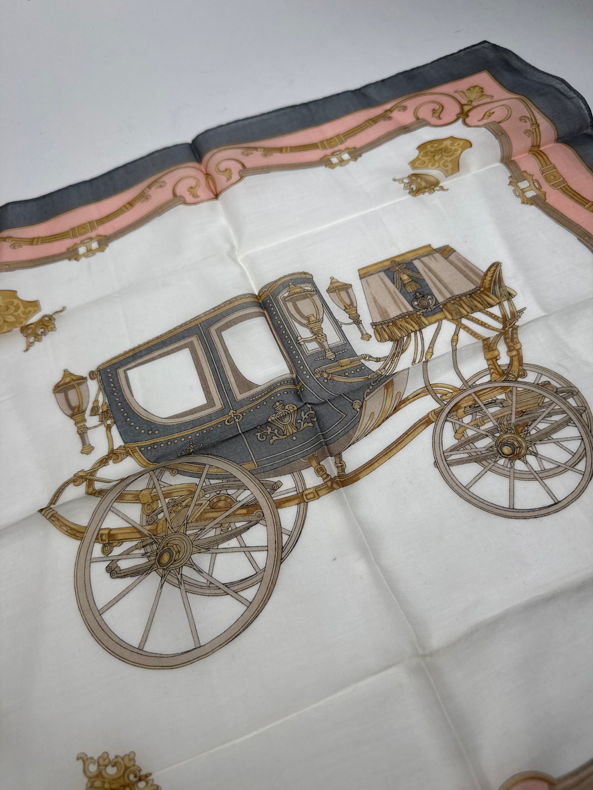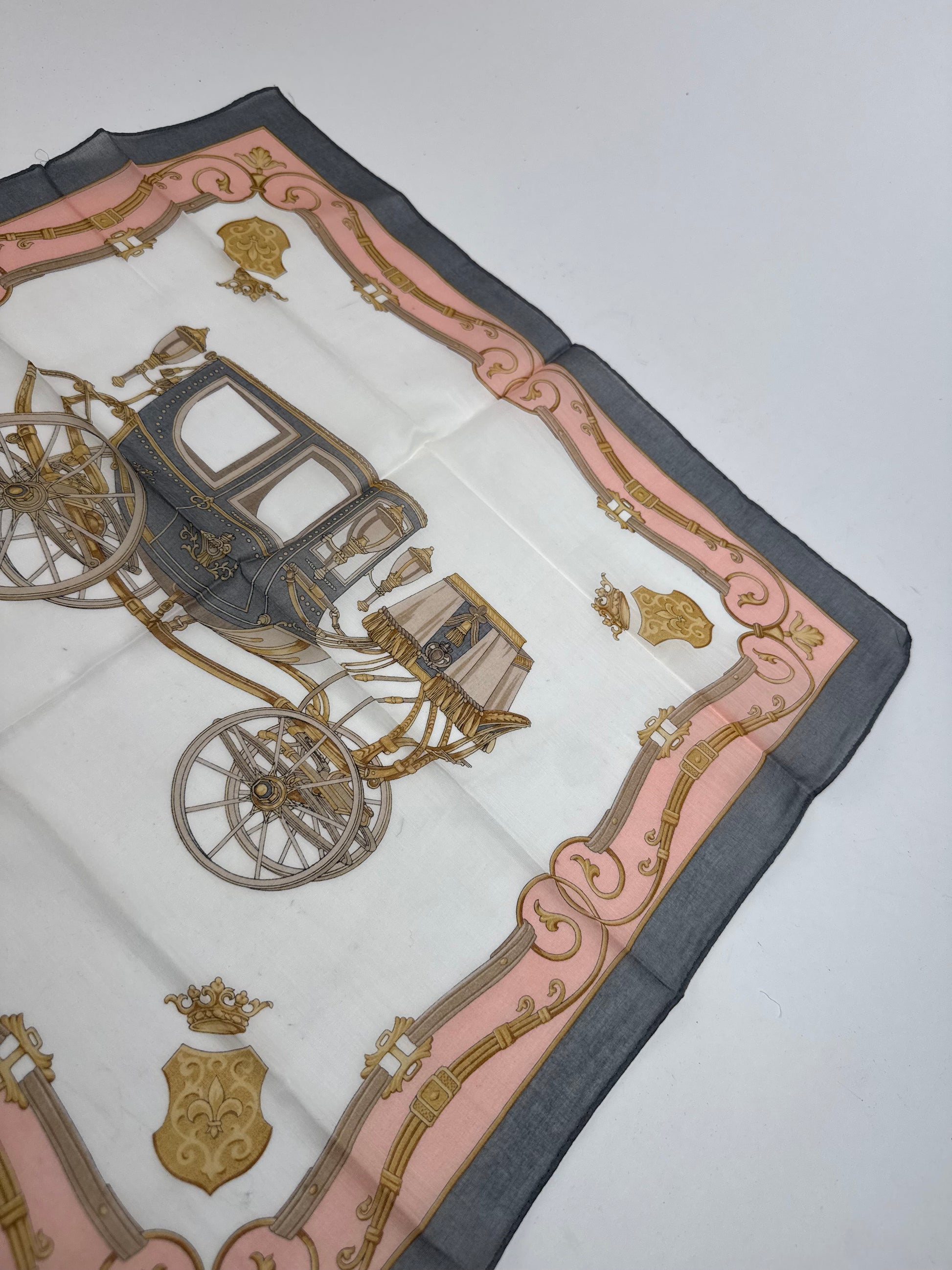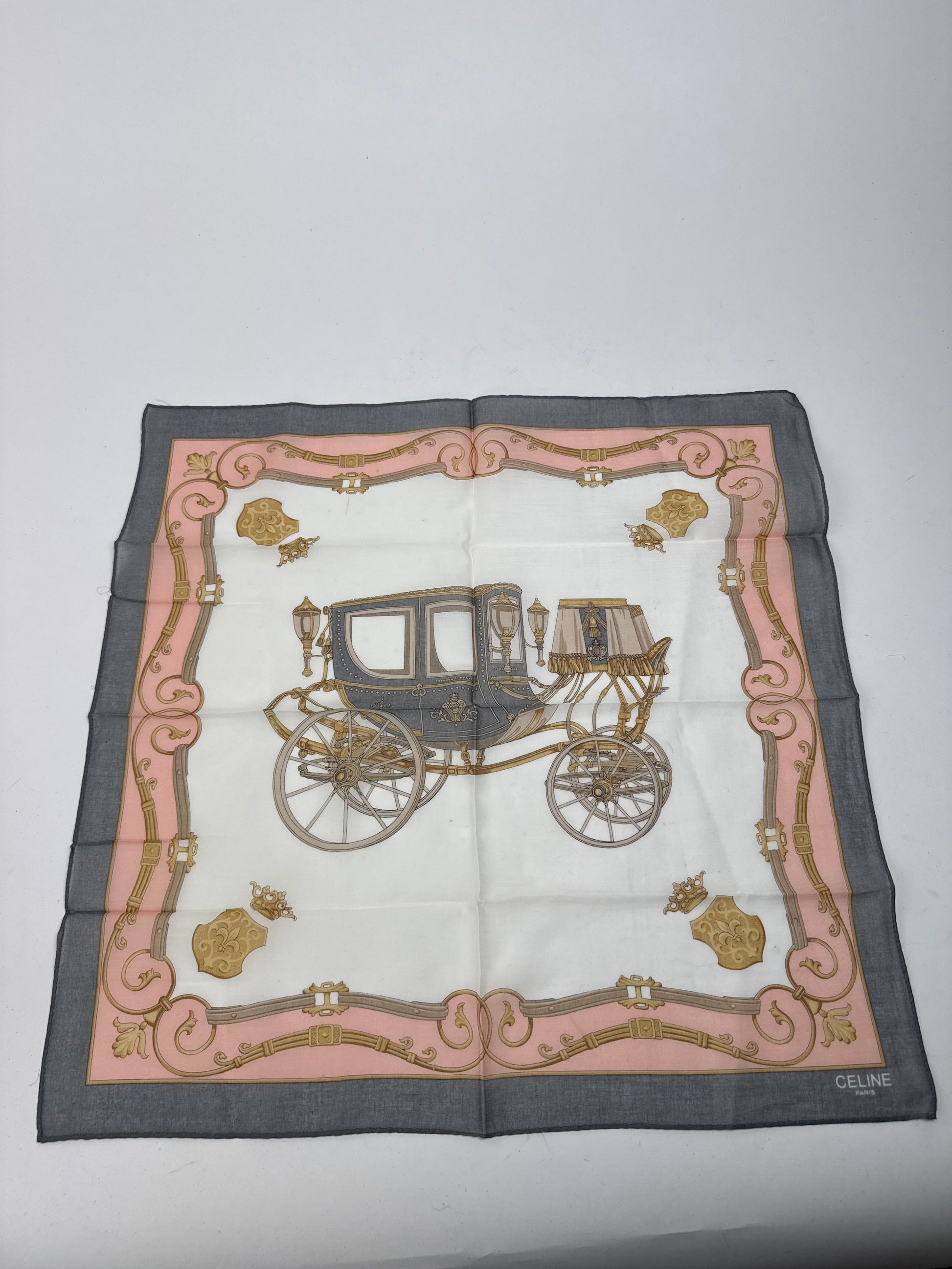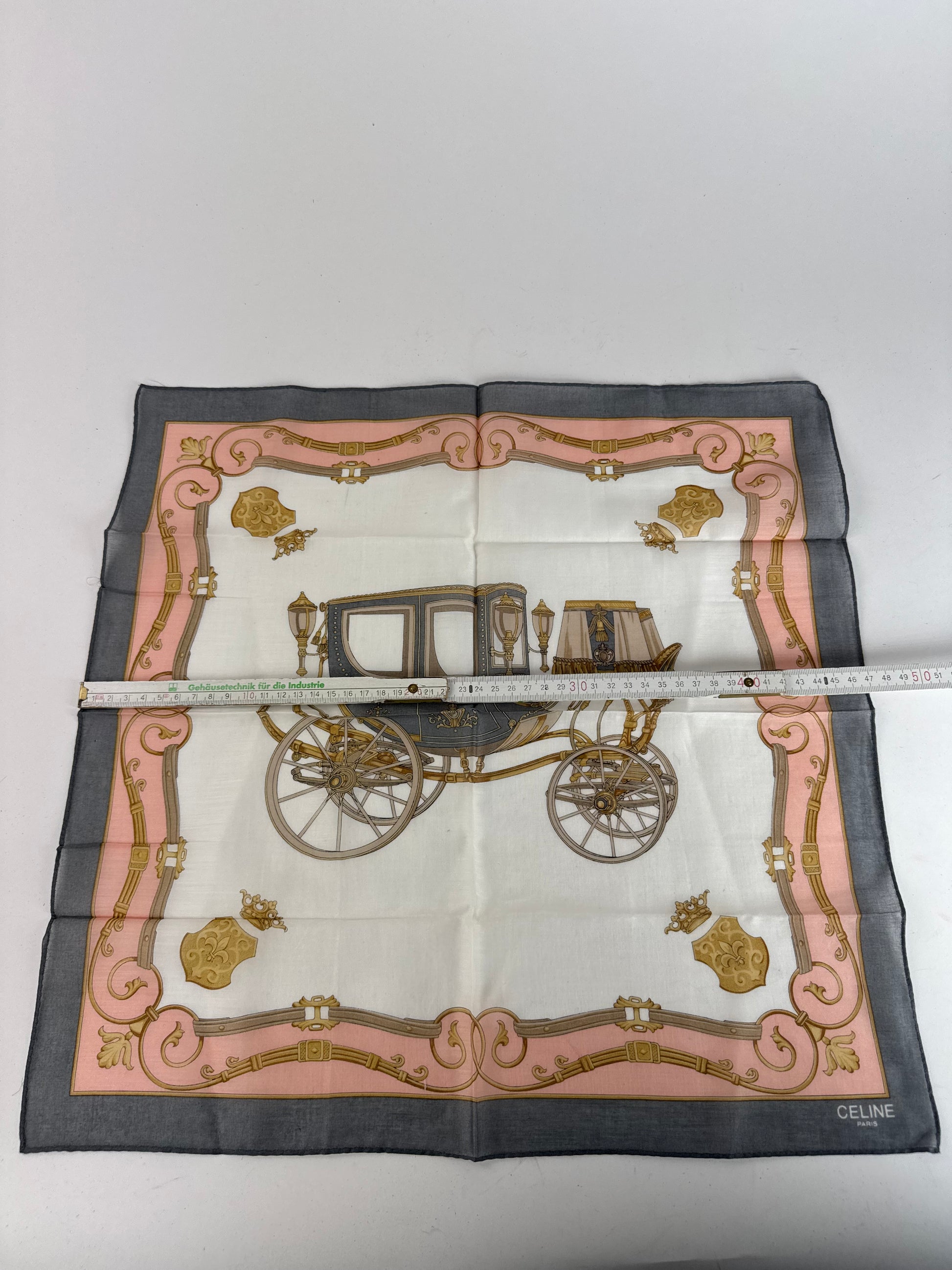 This vintage scarf is finely crafted of silk and canvas, featuring a central carriage logo surrounded by layered design elements: a white field, followed by a pink base with golden chain motifs, and finished with a grey-toned border. A refined composition reflecting Céline’s classic equestrian elegance.