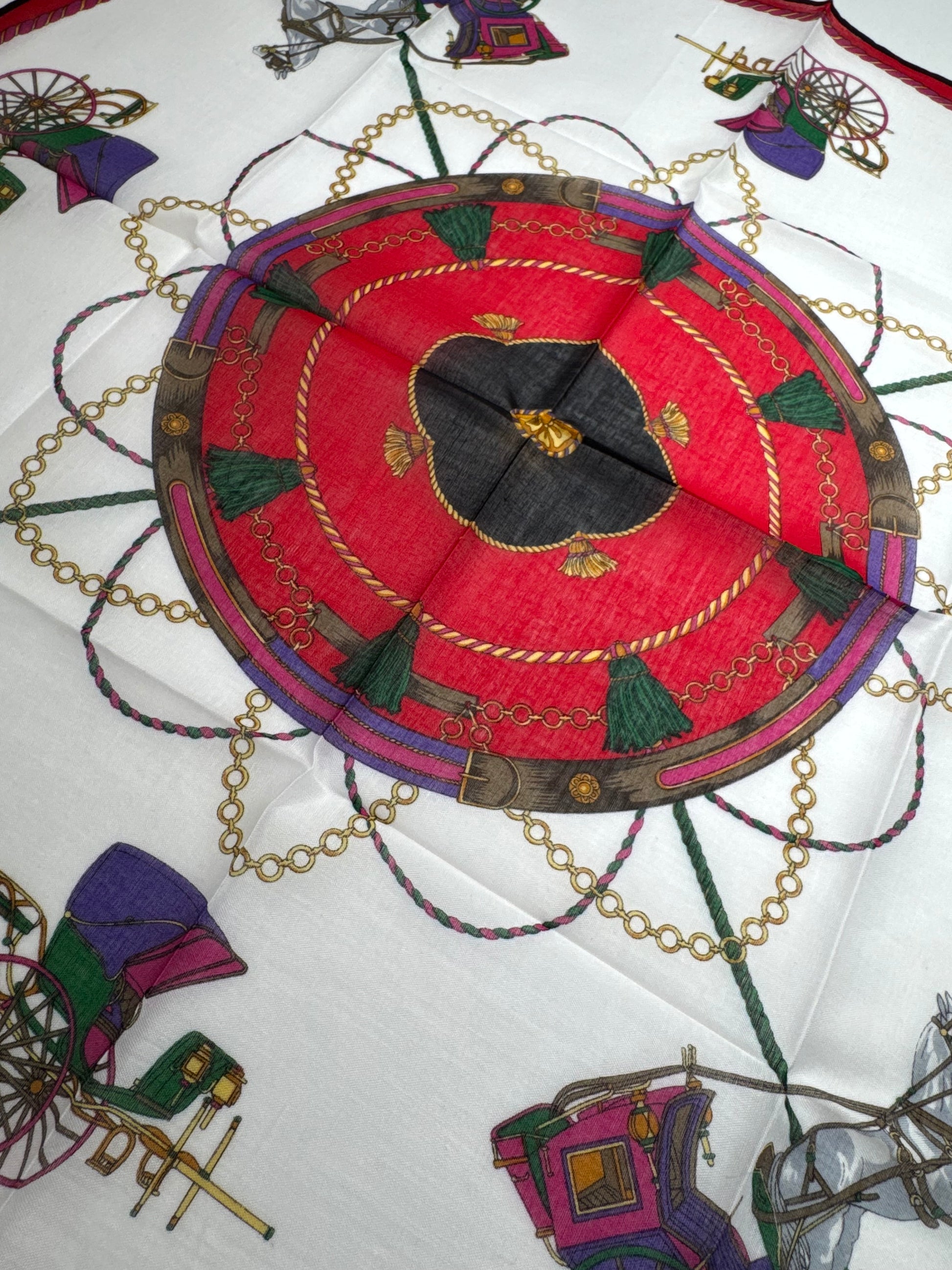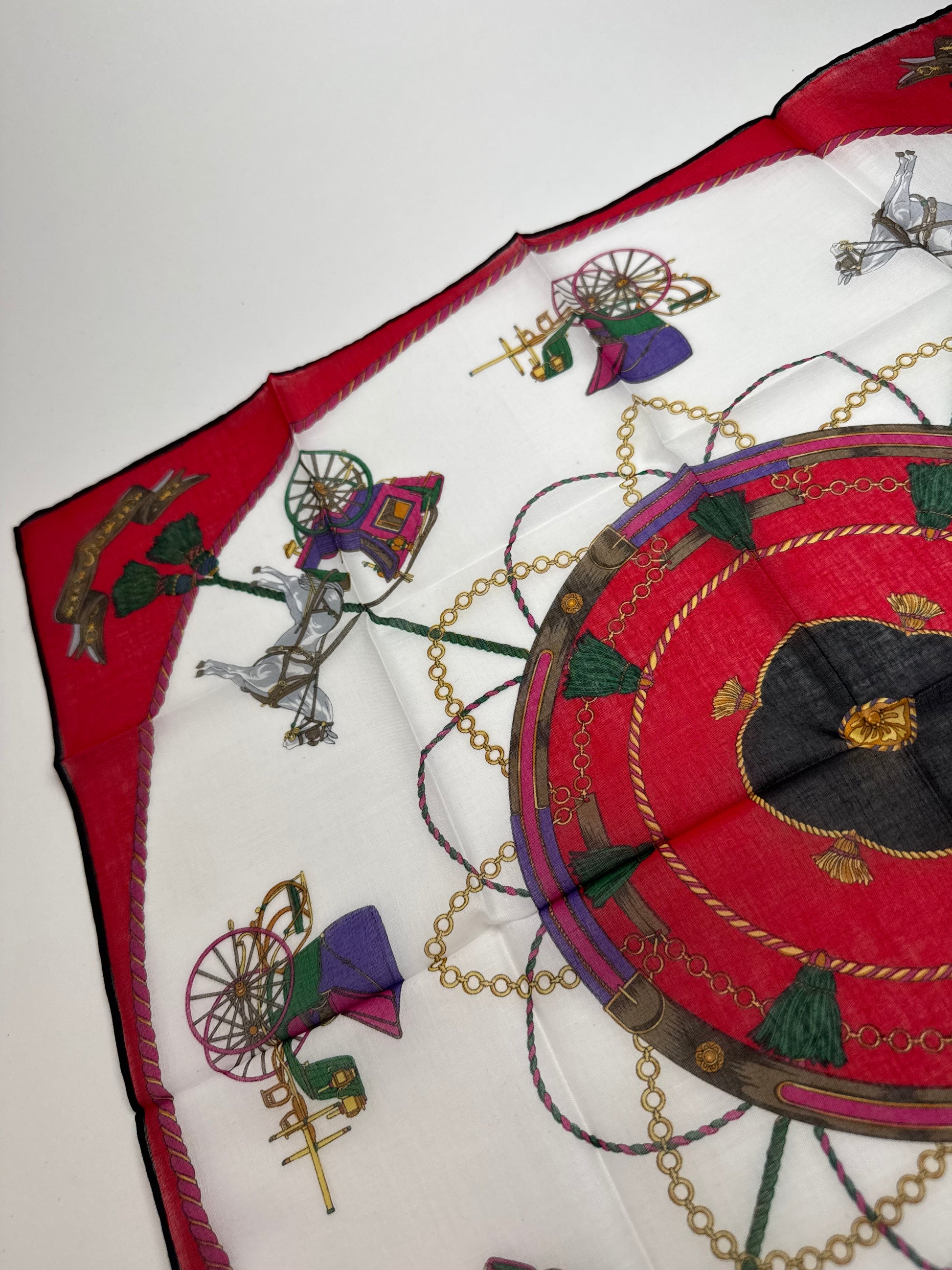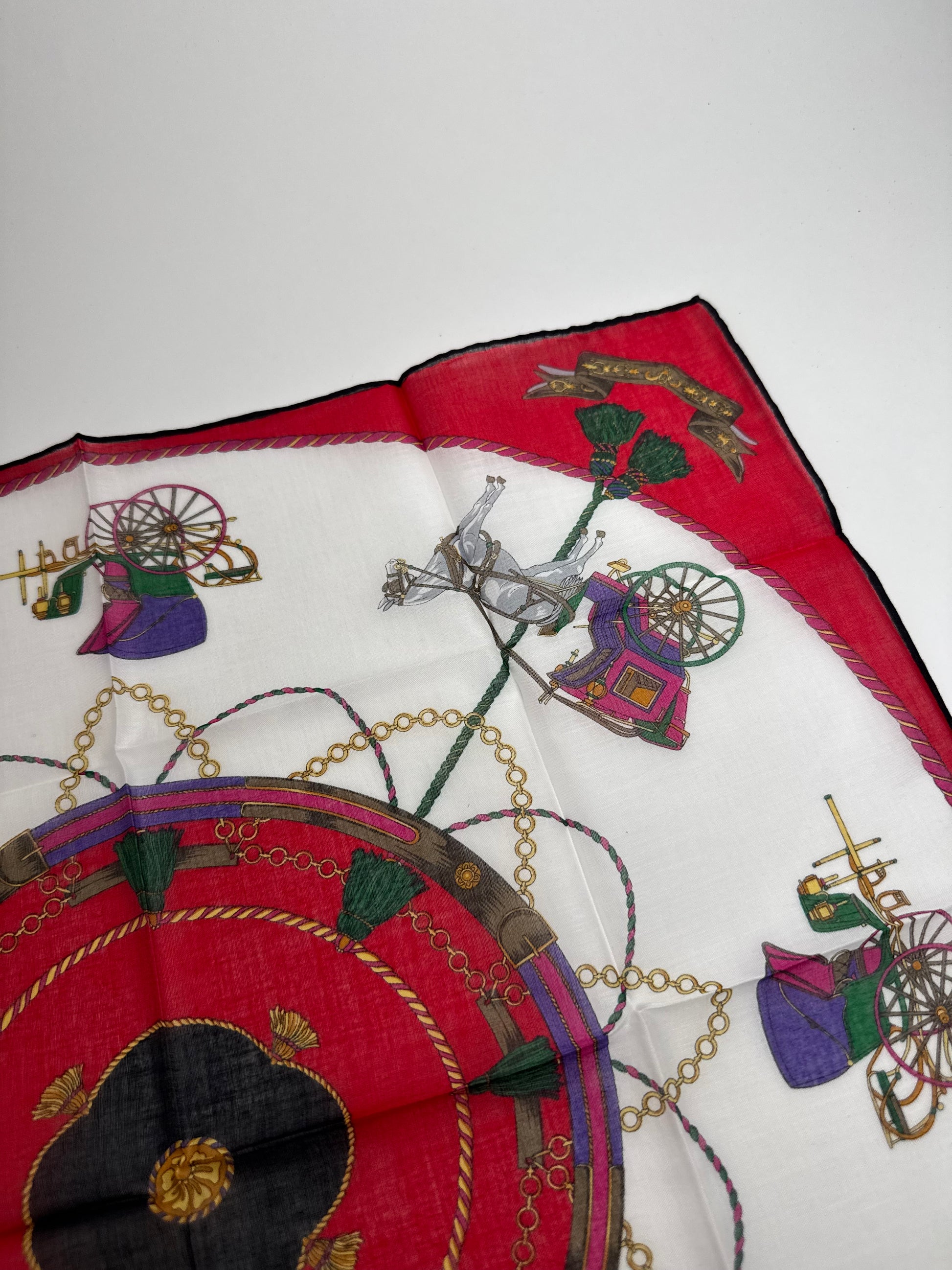 This elegant vintage scarf by Céline Paris features a vivid red border framing detailed illustrations of carriages and horses, accented with classic golden chain motifs. A white circular center adds balance and contrast to the richly decorated design.