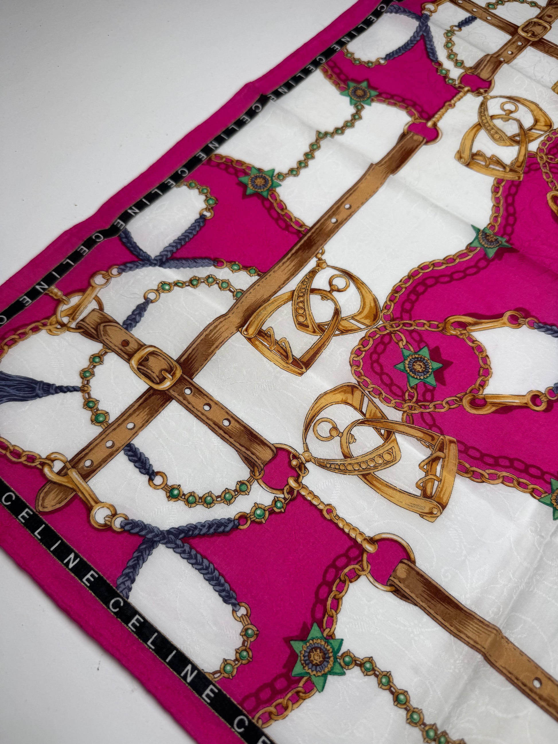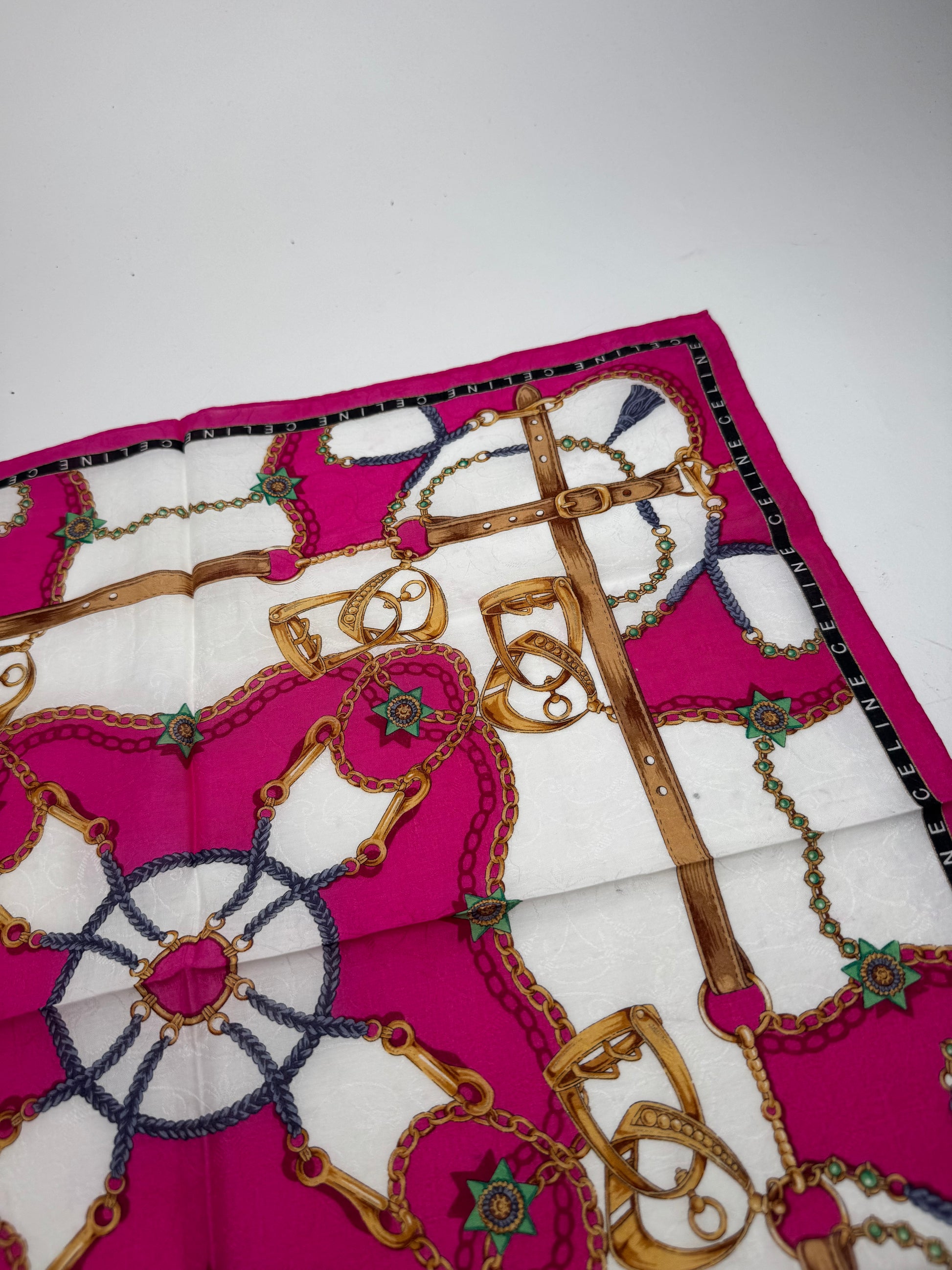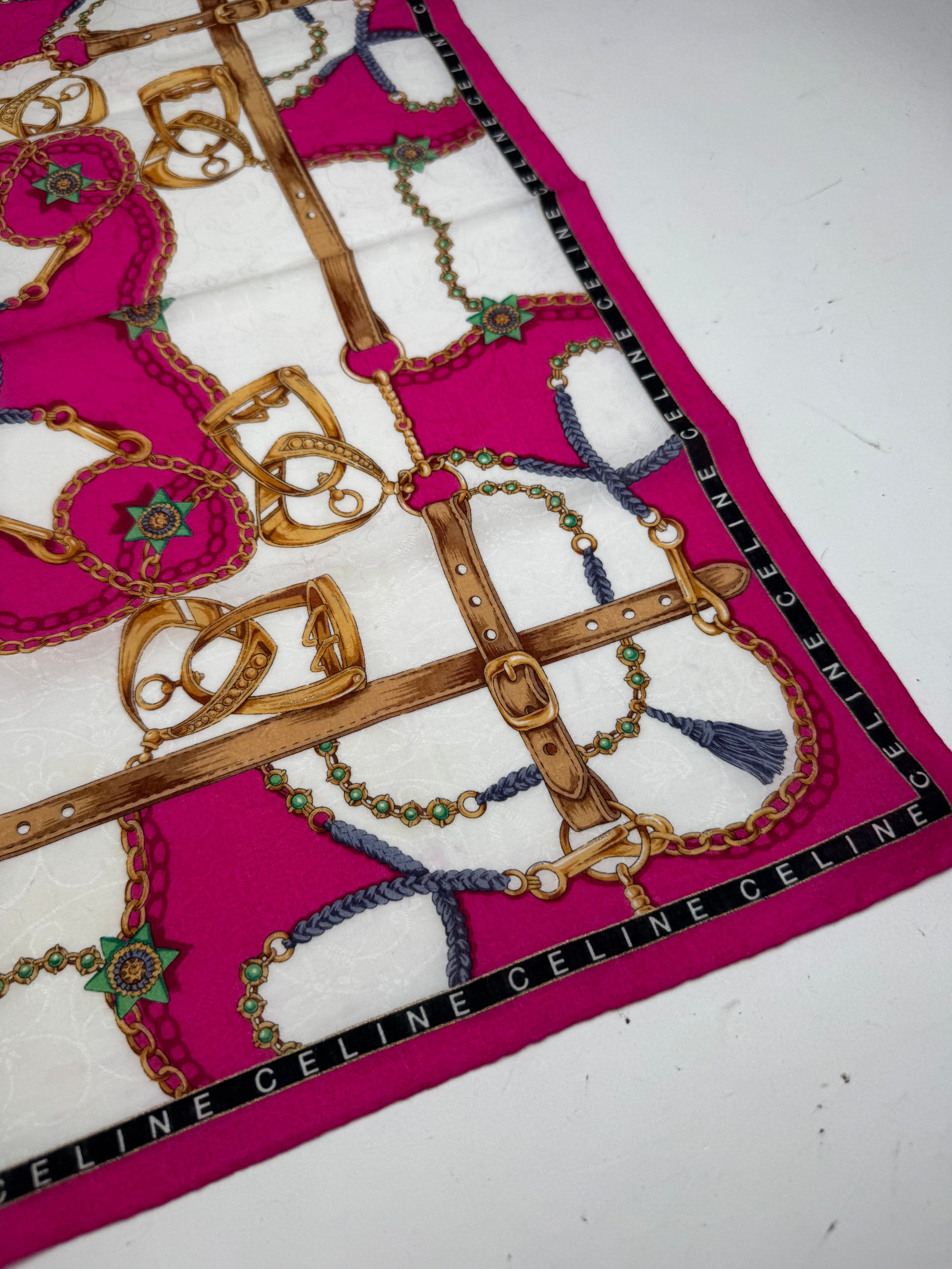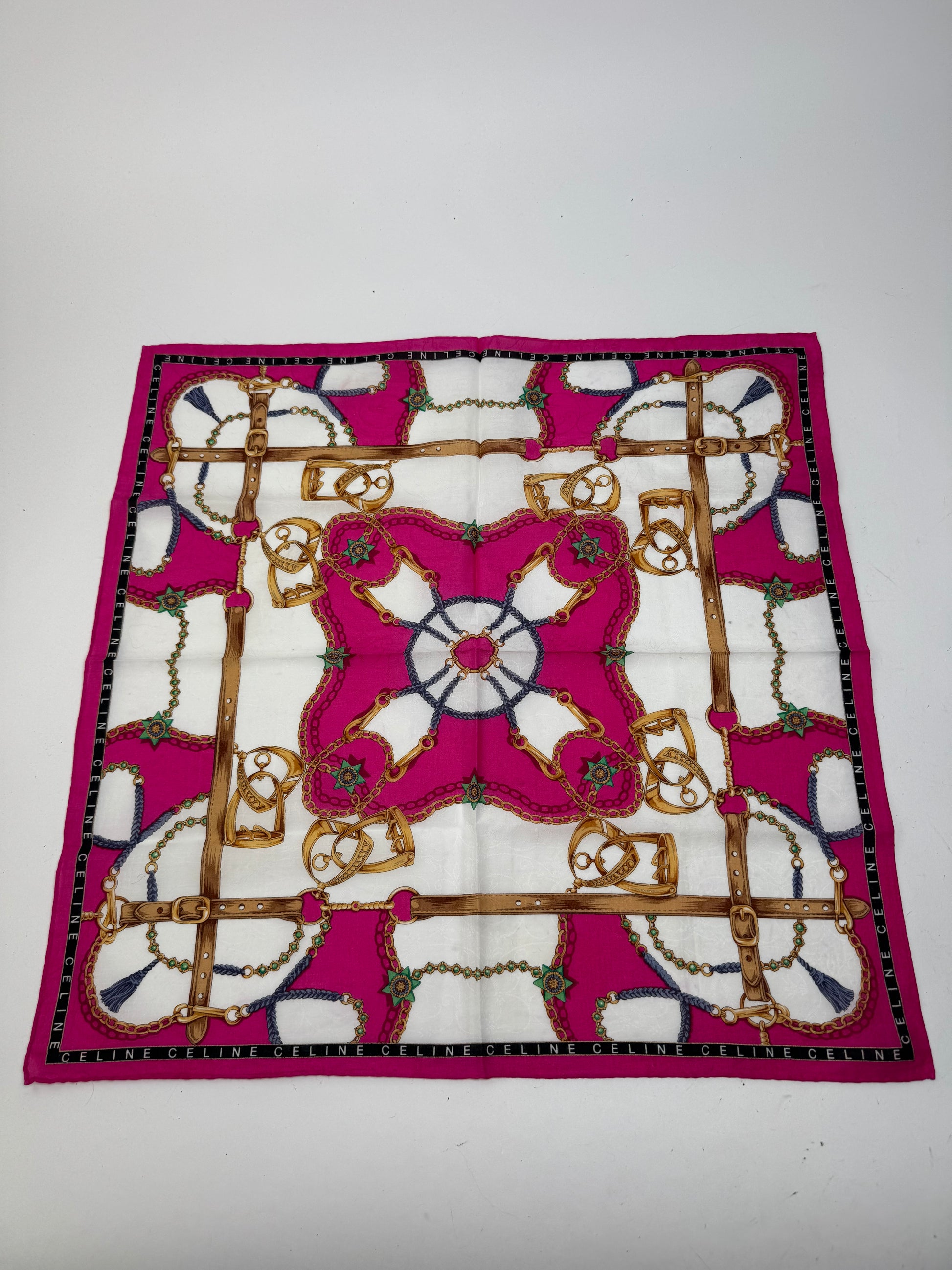 CELINE Baroque Print Scarf. This vintage scarf is crafted from a soft blend of cotton and silk and features an ornate baroque-inspired print in shades of pink, gold, and blue. The luxurious design reflects Céline’s timeless take on classic elegance.